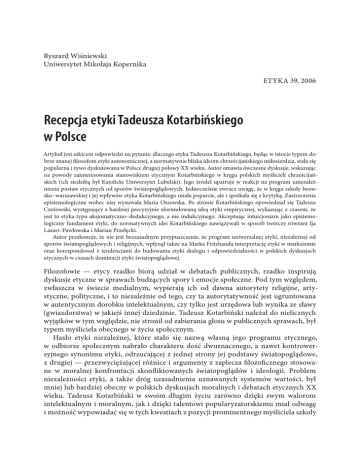 Ryszard Wiśniewski Uniwersytet Mikołaja Kopernika Etyka 39, 2006 Recepcja etyki Tadeusza Kotarbińskiego w Polsce Artykuł jest szkicem odpowiedzi na pytanie: dlaczego etyka Tadeusza Kotarbińskiego, będąc w istocie typem do brze znanej filozofom etyki autonomicznej, a normatywnie bliska ideom chrześcijańskiego miłosierdzia, stała się popularna i żywo dyskutowana w Polsce drugiej połowy XX wieku. Autor omawia ówczesne dyskusje, wskazując na powody zainteresowania stanowiskiem etycznym Kotarbińskiego w kręgu polskich myślicieli chrześcijań skich (ich siedzibą był Katolicki Uniwersytet Lubelski). Jego źródeł upatruje w reakcji na program uniezależ nienia postaw etycznych od sporów światopoglądowych. Jednocześnie zwraca uwagę, że w kręgu szkoły lwow sko–warszawskiej i jej wpływów etyka Kotarbińskiego miała poparcie, ale i spotkała się z krytyką. Zastrzeżenia epistemologiczne wobec niej wysuwała Maria Ossowska. Po stronie Kotarbińskiego opowiedział się Tadeusz Czeżowski, występujący z bardziej precyzyjnie sformułowaną ideą etyki empirycznej, wykazując z czasem, że jest to etyka typu aksjomatyczno–dedukcyjnego, a nie indukcyjnego. Akceptując intuicjonizm jako epistemo logiczny fundament etyki, do normatywnych idei Kotarbińskiego nawiązywali w sposób twórczy również Ija Lazari–Pawłowska i Marian Przełęcki. Autor przekonuje, że nie jest bezzasadnym przypuszczenie, że program uniwersalnej etyki, niezależnej od sporów światopoglądowych i religijnych, wpłynął także na Marka Fritzhanda interpretację etyki w marksizmie oraz korespondował z tendencjami do budowania etyki dialogu i odpowiedzialności w polskich dyskusjach etycznych w czasach dominacji etyki światopoglądowej. Filozofowie — etycy rzadko biorą udział w debatach publicznych, rzadko inspirują dyskusje etyczne w sprawach budzących spory i emocje społeczne. Pod tym względem, zwłaszcza w świecie medialnym, wypierają ich od dawna autorytety religijne, arty styczne, polityczne, i to niezależnie od tego, czy ta autorytatywność jest ugruntowana w autentycznym dorobku intelektualnym, czy tylko jest urzędowa lub wynika ze sławy (gwiazdorstwa) w jakiejś innej dziedzinie. Tadeusz Kotarbiński należał do nielicznych wyjątków w tym względzie, nie stronił od zabierania głosu w publicznych sprawach, był typem myśliciela obecnego w życiu społecznym. Hasło etyki niezależnej, które stało się nazwą własną jego programu etycznego, w odbiorze społecznym nabrało charakteru dość dwuznacznego, a nawet kontrower syjnego synonimu etyki, odrzucającej z jednej strony jej podstawy światopoglądowe, z drugiej — przezwyciężającej różnice i argumenty z zaplecza filozoficznego stosowa ne w moralnej konfrontacji skonfliktowanych światopoglądów i ideologii. Problem niezależności etyki, a także dróg uzasadnienia uznawanych systemów wartości, był mniej lub bardziej obecny w polskich dyskusjach moralnych i debatach etycznych XX wieku. Tadeusz Kotarbiński w swoim długim życiu zarówno dzięki swym walorom intelektualnym i moralnym, jak i dzięki talentowi popularyzatorskiemu miał odwagę i możność wypowiadać się w tych kwestiach z pozycji prominentnego myśliciela szkoły 22 RYSZARD WIŚNIEWSKI lwowsko–warszawskiej, a echo jego wypowiedzi, z czasem jako echo odbite, przenika i do najświeższych sporów. * Idea etyki niezależnej nie jest więc nowa, a co najwyżej jej polski kontekst społeczno–hi storyczny, jej użytek publiczny sprawiał, że wydawała się nosić znamiona myśli względnie nowej. W obrębie filozofii należy ona w sposób jak najbardziej oczywisty do nurtu etyki autonomicznej, której tradycja sięga początków etyki, zwłaszcza Arystotelesa. W Polsce idee te pojawiły się już w XV wieku wraz z ówczesnym inspirującym się filozofią Dunsa Szkota buridańskim nurtem filozofii nowoczesnej zwanym via moderna, projektującym uprawianie filozofii moralnej jako autonomicznej względem teologii i niezależnie od metafizyki, nauczanej przed metafizyką. Tak się też składa, że późnośredniowieczne ten dencje do autonomizacji etyki miały zarazem wyraźny charakter praktycystyczny, co jest symptomatyczne dla etyki poszukującej własnych przesłanek, często w sferze sumienia, doświadczenia moralnego czy jakkolwiek inaczej owe przesłanki się określi. Wreszcie jak w Europie, tak i w Polsce tendencja do autonomizacji etyki nie wyczerpała się w dążeniach późnego średniowiecza do uwolnienia filozofii od kurateli ze strony teolo gii. W brytyjskich koncepcjach zmysłu moralnego i w filozofii Kanta etyka autonomiczna otrzymała nowe impulsy rozwojowe. Jednak dopiero w ostatnich dekadach XIX wieku idee autonomii, czyli niezależności etyki przebiły się do publicystyki oraz tym samym do świadomości elit i zaczęły odgrywać widoczną rolę w świadomości etycznej społeczeństwa, zwłaszcza dzięki moralistyce literackiej. W Polsce stało się tak głównie wskutek ofensywy ideowej pozytywistów warszawskich. W filozofii tego okresu problem możliwości etyki naukowej jako etyki niezależnej został wyraźnie postawiony przez Juliana Ochorowicza oraz Kazimierza Twardowskiego, ale ktokolwiek uprawiał etykę lub wypowiadał się o niej z początkiem XX wieku i po pierwszej wojnie światowej, nawiązując do wzorów europej skich (Florian Znaniecki, Władysław Tatarkiewicz, Henryk Elzenberg, Roman Ingarden), traktował ją jako autonomiczną dziedzinę dociekań filozoficznych, autonomiczną meto dologicznie względem innych działów czy nauk filozoficznych. J. Ochorowicz, Metoda w etyce, „Przegląd Filozoficzny” 1906, z. 1; także: W. Tyburski, Dyskusje wokół modelu etyki w polskiej filozofii przełomu XIX i XX wieku, „Studia Filozoficzne” 1979, nr 8; tenże, Etyka i jej zadania w ujęciu Juliana Ochorowicza, „Etyka”, nr 14 (Warszawa 1975). K. Twardowski, Główne kierunki etyki na