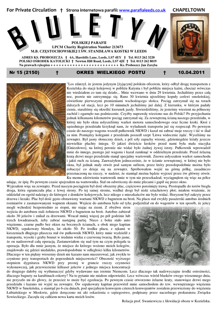 For Private Circulation † Strona internetowa parafii: www.parafialeeds.co.uk CHAPELTOWN POLSKIEJ PARAFII LPCM Charity Registration Number 213673 M.B. CZĘSTOCHOWSKIEJ I ŚW. STANISŁAWA KOSTKI W LEEDS ADRES KS. PROBOSZCZA † 6A, Harehills Lane, Leeds, LS7 4EY † Tel. 0113 262 3220 POLSKI OŚRODEK KATOLICKI † Newton Hill Road, Leeds, LS7 4JE † Tel. 0113 262 8019 Na prawach rękopisu + + + + + + + + + + + + + + + + + + + + + + + + + Ks. Proboszcz Jan Zaręba Nr 15 (2150) † OKRES WIELKIEGO POSTU † 10.04.2011 "Los zdarzył, że jestem jedynym [żyjącym] polskim oficerem, który odbył drogę transportem z Kozielska do stacji kolejowej w pobliżu Katynia i był pobliżu miejsca kaźni, chociaż wówczas nie wiedziałem co tam się działo... Mnie wezwano w dniu 29 kwietnia. Jechaliśmy przez całą noc, prawie nie zatrzymując się. Rano 30 kwietnia ujrzeliśmy kopuły cerkwi smoleńskiej, oświetlone pierwszymi promieniami wschodzącego słońca. Pociąg zatrzymał się na torach dalszych od stacji, lecz po 10 minutach jechaliśmy już dalej. Z kierunku, w którym padały cienie, staraliśmy się określić kierunek jazdy. Stwierdziliśmy, że jesteśmy wiezieni na północny zachód i ogarnęło nas podniecenie. Czyżby naprawdę wieziono nas do Polski? Po przyjechaniu jednak kilkunastu kilometrów pociąg zatrzymał się. Za zewnętrzną ścianą naszego przedziału, w której nie było okna usłyszeliśmy warkot motoru samochodowego oraz liczne kroki. Ktoś z sąsiedniego przedziału krzyknął nam, że wyładunek transportu już się rozpoczął. Po pewnym czasie do naszego wagonu wszedł pułkownik NKWD i kazał mi zabrać moje rzeczy i iść w ślad za nim. Pomiędzy kolegami z przedziału poszedł szept 'Litwa widocznie żąda'. Wyszliśmy na zewnątrz. Był jasny słoneczny dzień, z pól szły zapachy wiosny, gdzieniegdzie leżały jeszcze niewielkie płachty śniegu. O jakieś dwieście kroków przed nami była mała stacyjka [Gniezdowo], na której peronie nie widać było żadnej żywej istoty. Pułkownik wprowadził mnie do innego, pustego już wagonu i kazał zamknąć w oddzielnym przedziale. Przed żelazną kratą drzwi mego przedziału stanął specjalny wartownik. Znowu usłyszałem warkot samochodu i jakiś ruch za ścianą. Zauważyłem jednocześnie, że w ścianie zewnętrznej, w której nie było okna, był jednak mały otwór pod samym sufitem, przez który prawdopodobnie można było zobaczyć co dzieje się na zewnątrz. Spróbowałem wejść na górną półkę, zasadniczo przeznaczoną na rzeczy, w nadziei, że stamtąd można będzie wyjrzeć przez ów główny otwór. Ku memu zdziwieniu wartownik mnie w tym nie przeszkadzał, wyciągnąłem się więc na półce udając, że śpię. Po pewnym czasie spojrzałem na wartownika. Stał on odwrócony do mnie plecami i gapił się przez okno. Wyjrzałem więc na zewnątrz. Przed naszym pociągiem był dość obszerny plac, częściowo porośnięty trawą. Prostopadle do torów biegła droga, która ograniczała plac z lewej strony. Po tej samej stronie, wzdłuż drogi był niski sztachetowy płot; miałem wrażenie, że oddzielał on ogród należący do któregoś z domków kolejowych, lecz nikogo z mieszkańców nie było widać. Horyzont był zakryty przez drzewa i krzaki. Plac był dość gęsto obstawiony wartami NKWD z bagnetem na broń. Na placu stał zwykły pasażerski autobus średnich rozmiarów z zasmarowanymi wapnem oknami. Wejście do autobusu było od tyłu; podjeżdżał on do wagonów w ten sposób, że jeńcy mogli wchodzić bezpośrednio ze stopni, nie stając na ziemi. Z obydwu stron wejścia do autobusu stali żołnierze NKWD z bagnetem na broń. Autobus zabierał około 30 jeńców i znikał za drzewami. Wracał mniej więcej po pół godzinie lub trzech kwadransach, żeby zabrać następną partię. Nieco z boku stało auto więzienne, czarne pudło bez okien na bocznych ścianach, a obok niego kapitan NKWD, szpakowaty blondyn, lat około 50. Po środku placu, z rękami w kieszeniach długiego płaszcza stał ów pułkownik NKWD, który mnie wydzielił z transportu, wysoki i gruby brunet w średnim wieku z czerwoną twarzą. Było jasne, że on nadzorował całą operacją. Zastanawiałem się nad tym na czym polegała ta operacja. Było dla mnie jasnym, że miejsce do którego wożono moich kolegów, znajdowało się gdzieś niedaleko, prawdopodobnie w odległości kilku kilometrów. Dlaczego w ten piękny wiosenny dzień nie kazano nam maszerować, jak zwykle to czyniono przy transportach do poprzednich miejscowości? Obecność wyższego stopniem dygnitarza NKWD przy prostej w gruncie rzeczy czynności wykonawczej, jak przewiezienie kilkuset jeńców z jednego miejsca koncentracji do drugiego dałoby się wytłumaczyć gdyby wydawano nas istotnie Niemcom. Lecz dlaczego tak nadzwyczajne środki ostrożności, dlaczego bagnety na karabinach eskorty? Na to pytanie nie miałem odpowiedzi. Lecz wówczas wśród blasków owego wiosennego dnia, nie przyszło mi do głowy, że przecież to może być egzekucja. Po pewnym czasie otworzono żelazne kraty, stanowiące drzwi mego przedziału i kazano mi wyjść na zewnątrz. Ów szpakowaty kapitan przewiózł mnie samochodem do tzw. wewnętrznego więzienia NKWD w Smoleńsku, a stamtąd po 6-ciu dniach, pod specjalnym konwojem czterech konwojentów zostałem przewieziony do więzienia Łubiańskiego w Moskwie, gdzie doręczono mi akt oskarżenia o szpiegostwo, podpisany przez naczelnego prokuratora Związku Sowieckiego. Zaczęła się całkiem nowa karta moich losów. Relacja prof. Swaniewicza z likwidacji obozu w Kozielsku. PORZĄDEK MSZY ŚWIĘTYCH I NABOŻEŃSTW NIEDZIELA, 10 KWIETNIA 2011; 5 WIELKIEGO POSTU – OBCHODY KATYŃSKIE; 9:30 – BŁ. ROCZNEGO DZIECKA – Olivia ŚLAZYK Do Bożej Opatrzności z prośbą o Błogosławieństwo Boże i potrzebne łaski dla Olivii Ślazyk w 1. rocznicę urodzin oraz dla Jej rodziców, rodziców chr