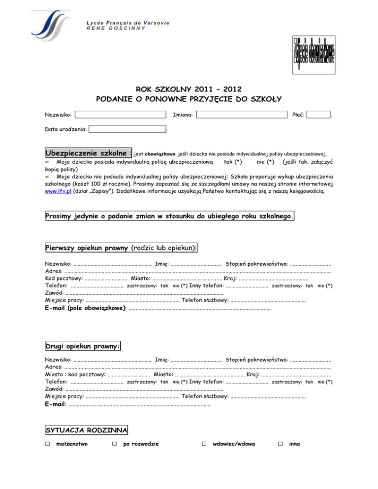 Lycée Français de Varsovie RENE GOSCINNY ROK SZKOLNY 2011 – 2012 PODANIE O PONOWNE PRZYJĘCIE DO SZKOŁY Nazwisko: Imiona: Data urodzenia: Płeć: . . Ubezpieczenie szkolne : jest obowiązkowe jeśli dziecko nie posiada indywidualnej polisy ubezpieczeniowej. • Moje dziecko posiada indywidualną polisę ubezpieczeniową tak (*) nie (*) (jeśli tak, załączyć kopię polisy) • Moje dziecko nie posiada indywidualnej polisy ubezpieczeniowej: Szkoła proponuje wykup ubezpieczenia szkolnego (koszt 100 zł rocznie). Prosimy zapoznać się ze szczegółami umowy na naszej stronie internetowej www.lfv.pl (dział „Zapisy”). Dodatkowe informacje uzyskają Państwo kontaktując się z naszą księgowością. Prosimy jedynie o podanie zmian w stosunku do ubiegłego roku szkolnego. Pierwszy opiekun prawny (rodzic lub opiekun): Nazwisko: ....................................................... Imię: .................................... Stopień pokrewieństwa: ............................. Adres: ........................................................................................................................................................................................... Kod pocztowy: .............................. Miasto: ................................................. Kraj: ................................................. Telefon: ..................................... zastrzeŜony: tak nie (*) Inny telefon: .............................. zastrzeŜony: tak nie (*) Zawód: ............................................................................................................... Miejsce pracy: .................................................................. Telefon słuŜbowy: ..................................................... E-mail (pole obowiązkowe): .................................................................................................... Drugi opiekun prawny: Nazwisko: ....................................................... Imię: .................................... Stopień pokrewieństwa: ............................. Adres: ........................................................................................................................................................................................... Miasto : kod pocztowy: .............................. Miasto: ................................................. Kraj: ................................................. Telefon: ..................................... zastrzeŜony: tak nie (*) Inny telefon: .............................. zastrzeŜony: tak nie (*) Zawód: ............................................................................................................... Miejsce pracy: .................................................................. Telefon słuŜbowy: ..................................................... E-mail: .................................................................................................... SYTUACJA RODZINNA małŜenstwo po rozwodzie wdowiec/wdowa inna PŁATNIK : (jeśli nie jest to wymieniony powyŜej opiekun – załączyć zobowiązanie do płatności, podpisane przez osobę prywatną lub przedsiębiorstwo) Adres ucznia, jeśli jest inny niŜ adres głównego opiekuna Adres: …………………………………………………………………………………………................................................................................................ Miasto : kod pocztowy: ..................................... Miasto: ..................................... Kraj: ....................................... Telefon: ..................................... zastrzeŜony: tak nie (*) Inny telefon: .............................. zastrzeŜony: tak nie (*) (*) Niepotrzebne skreślić NB : Proszę nie zapomnieć o podpisaniu umowy (str. 4 niniejszego podania). Liceum Francuskie w Warszawie Umowa na rok szkolny 2011 – 2012 pomiędzy Liceum Francuskim w Warszawie, reprezentowanym przez przewodniczącego Rady Zarządu Liceum, oraz dyrektorem, a opiekunem prawnym ucznia, uzgodniono co następuje: Liceum Francuskie w Warszawie jest placówką zarządzaną przez rodziców, związaną umową z Agencją d/s Nauczania Francuskiego Za Granicą oraz akredytowaną przez francuskie Ministerstwo Edukacji Narodowej. Czesne przeznaczone jest wyłącznie na pokrycie wydatków związanych z obowiązkowym programem nauczania, ustalonym przez francuskie Ministerstwo Edukacji Narodowej; nie pokrywa: kosztów świadczeń dodatkowych i fakultatywnych (transport szkolny i stołówka szkolna) kosztów zajęć pozalekcyjnych, proponowanych w załączniku do niniejszej umowy kosztów zajęć proponowanych okazjonalnie dla grup uczniów (wycieczki szkolne z noclegiem). Rodzice nie powinni zgadzać się na finansowanie jakichkolwiek zajęć jeśli nie otrzymają dokumentu podpisanego przez osoby upowaŜnione: przewodniczącego i skarbnika Rady Zarządu, dyrektora i intendenta szkoły. Przedszkole i Szkoła Podstawowa Jedna stawka Gimnazjum Liceum Jedna stawka Jedna stawka Czesne za okres roku szkolnego 16 582 PLN 23 807 PLN Ubezpieczenie WypoŜyczenie podręczników Pierwszy zapis i ponowny zapis : wpisowe i opłata rejestracyjna 24 526 PLN 100 PLN Podręczniki i pomoce 150 PLN szkolne bezpłatne 1 600 PLN + (nowi uczniowie : 300 PLN opłaty rejestracyjnej) 9 523 PLN 1 kwartał : wrzesień - grudzień: 9 810 PLN 6 632 PLN WypoŜyczenie podręczników : 150 PLN 15 październikwa 100 PLN ubezpieczenia (do wyboru) 2 kwartał : styczeń – marzec : 15 lutego 4 975 PLN 7 142 PLN 7 358 PLN 4 975 PLN 7 142 PLN 7 358 PLN 3 kwartał : kwiecień - czerwiec 15 kwietnia Fakturę za czesne, płatne kwartalnie, wystawia się oddzielnie za kaŜdego zapisanego ucznia, na nazwisko opiekuna lub pokrywającego koszty przedsiębiorstwa. W tym ostatnim przypadku fakturę przesyła się na adres przedsiębiorstwa na podstawie pisemnego zobowiązania do płatności, z terminem płatności