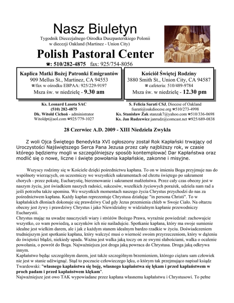 Nasz Biuletyn Tygodnik Diecezjalnego Ośrodka Duszpasterskiego Polonii w diecezji Oakland (Martinez - Union City) Polish Pastoral Center ?: 510/282-4875 fax: 925/754-8056 Kaplica Matki Bożej Patronki Emigrantów 909 Mellus St., Martinez, CA 94553 Kościół Świętej Rodziny 3880 Smith St., Union City, CA 94587 ?/fax w ośrodku EBPAA: 925/229-9197 ? cafeteria: 510/489-9784 Msza św. w niedzielę - 9.30 am Msza św. w niedzielę - 12.30 pm Ks. Leonard Lasota SAC (510) 282-4875 Dk. Witold Cichoń - administrator [email protected] ?925/779-1027 S. Felicia Sarati CSJ, Diocese of Oakland [email protected] ?510/273-4998 Ks. Stanisław Żak [email protected] ?510/336-0698 Ks. Jan Rudzewicz [email protected] ?925/689-0838 28 Czerwiec A.D. 2009 - XIII Niedziela Zwykła Z woli Ojca Świętego Benedykta XVI ogłoszony został Rok Kapłański trwający od Uroczystości Najświętszego Serca Pana Jezusa przez cały najbliższy rok, w czasie którego będziemy mogli w szczególniejszy sposób kontemplować Dar Kapłaństwa oraz modlić się o nowe, liczne i święte powołania kapłańskie, zakonne i misyjne. Wszyscy rodzimy się w Kościele dzięki pośrednictwu kapłana. To on w imieniu Boga przyjmuje nas do wspólnoty wierzących, on uczestniczy we wszystkich sakramentach od chrztu świętego po sakrament chorych - przez pokutę, Eucharystię, bierzmowanie i sakrament małżeństwa. Przez cały czas obecny jest w naszym życiu, jest świadkiem naszych radości, sukcesów, wszelkich życiowych porażek, udziela nam rad a jeśli potrzeba także upomina. We wszystkich momentach naszego życia Chrystus przychodzi do nas za pośrednictwem kapłana. Każdy kapłan reprezentuje Chrystusa działając "in persona Christi". To w kapłańskich dłoniach dokonuje się prawdziwy Cud gdy Jezus przemienia chleb w Swoje Ciało. Na ołtarzu obecny jest żywy i prawdziwy Chrystus i jako Niewidzialny w widzialnym kapłanie przewodniczy Eucharystii. Chrystus mając na uwadze nauczycieli wiary i stróżów Bożego Prawa, wyraźnie powiedział: zachowujcie wszystko, co wam powiedzą, a uczynków ich nie naśladujcie. Spotkanie kapłana, który ma swoje sumienie idealne jest wielkim darem, ale i jak z każdym stanem idealnym bardzo rzadkie w życiu. Doświadczeniem trudniejszym jest spotkanie kapłana, który walczyć musi o wierność swoim przyrzeczeniom, który w dążeniu do świętości błądzi, niekiedy upada. Ważna jest walka jaką toczy on ze swymi słabościami, walka o ocalenie powołania, o powrót do Boga. Najważniejsza jest droga jaką powraca do Chrystusa. Droga jaką odkrywa innym. Kapłaństwo będąc szczególnym darem, jest także szczególnym brzemieniem, którego ciężaru sam człowiek nie jest w stanie udźwignąć. Stąd to poczucie człowieczego lęku, o którym tak przejmująco napisał ksiądz Twardowski: "własnego kapłaństwa się boję, własnego kapłaństwa się lękam i przed kapłaństwem w proch padam i przed kapłaństwem klękam". Najważniejsze jest owo TAK wypowiadane przez kapłana własnemu kapłaństwu i Chrystusowi. To pełne pokory TAK przemienia kapłana, jest jego zgodą na przyjęcie "wieczystej pieczęci", o której pisała siostra Nulla: O, namaszczone, o, tajemnicze Kapłańskie ręce. Ojciec was lepił, Syn umiłował, Duch was poświęcił. Ojciec się z wami łamie, jak chlebem swą stwórczą mocą, Duch was pomazał, Duch was napełnił i przeistoczył. Syn was, jak owce pilnie odszukał wśród rąk tysięcy, By złożyć na was swoje, przebite skrwawione ręce. O, tajemnicze! O, przemienione! Kapłańskie dłonie! Pieczęć wieczystą wypalił na was wieczysty Płomień. Z bojaźni drżeniem odgadnąć pragnę co się w was chowa. Czy też wy jeszcze jesteście moje, Czy Chrystusowe? Zachęcam wszystkich wiernych do modlitwy za kapłanów, a w Roku Kapłańskim w sposób szczególny i gorliwszy. Z Ogłoszenia parafialne Z . 28 czerwca jest już ostatnią niedzielą pobytu Ojca Pallotyna, Ks. Leonarda Lasoty, w naszej Polonijnej wspólnocie. Dziękujemy serdecznie, że tak chętnie przyjechał do nas z bratniej Słowacji, aby wesprzeć naszą wspólnotę posługą Sakramentalno-Eucharystyczną. Po Mszy Św.,kiedy nasza młodzież przyjęła sakrament bierzmowania, Ks. Biskup John S. Cummins bardzo pozytywnie i przychylnie wyrażał się na temat Ks. Leonarda. Dzięki zaangażowaniu Księdza Leonarda, dzieci były dobrze przygotowane do spowiedzi i pierwszej Komunii Św. Wiele dobrego wydarzyło się w czasie Jego pobytu u nas. Dzięki Ci składamy drogi Księże Leonardzie i życzymy Ci wielu sukcesów w Twojej pięknej posłudze na Słowacji. Nie zapominaj o nas. Wspieraj nas swoją modlitwą i wypraszaj wszelkie łaski niezbędne tej wspólnocie, którą poznałeś. .Jak wszyscy pamiętamy, te ostatnie 13 miesięcy nie należały do łatwych dla naszej wspólnoty, jednakże z pomocą Bożą, przetrwaliśmy je. Jestem wdzięczny każdemu Kapłanowi, który pojawił sie u nas za przyzwoleniem Diecezji. Właśnie dzięki ich obecności, trwamy jeszcze jako “ polska owczarnia”w RzymskoKatolickiej rodzinie Diecezji Oakland. Daj Boże, abyśmy jak najrychlej otrzymali stałego duszpasterza. . Do wszystkich zainteresowanych odbiorem Naszego Biuletynu drogą internetową. Po otwarciu strony internetowej www.PolishPastoralCenter.org znajdziecie państwo linki do biuletynów. Każdy może sobie je otworzyć i zapoznać się z bieżącymi informacjami. . Szkoła Języka Polskiego w Walnut Creek poszukuje nauczycieli na nowy rok szkolny 2009-2010. Chętnych prosimy o kontakt z kierownikiem szkoły p. Tomkiem Kotlinskim [email protected] lub (707)480-8692. Więcej informacji można znaleźć na stronie internetowej szkoły www.polishschool.org . Zebrane składki kościelne. Za złożone ofiary składamy serdeczne Bóg zapłać: 05/24/09 05/31/09 06/07/09 06/14/09 06/21/09 Martinez $358 + dotacja na Kape $400 $373 $555 $281 $418 + dla Harcerstwa $161 Tygodniowo potrzeba