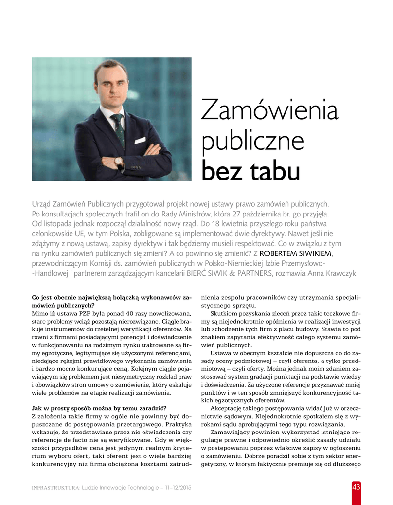 Zamówienia publiczne bez tabu Urząd Zamówień Publicznych przygotował projekt nowej ustawy prawo zamówień publicznych. Po konsultacjach społecznych trafił on do Rady Ministrów, która 27 października br. go przyjęła. Od listopada jednak rozpoczął działalność nowy rząd. Do 18 kwietnia przyszłego roku państwa członkowskie UE, w tym Polska, zobligowane są implementować dwie dyrektywy. Nawet jeśli nie zdążymy z nową ustawą, zapisy dyrektyw i tak będziemy musieli respektować. Co w związku z tym na rynku zamówień publicznych się zmieni? A co powinno się zmienić? Z ROBERTEM SIWIKIEM, przewodniczącym Komisji ds. zamówień publicznych w Polsko-Niemieckiej Izbie Przemysłowo-Handlowej i partnerem zarządzającym kancelarii BIERĆ SIWIK & PARTNERS, rozmawia Anna Krawczyk. Co jest obecnie największą bolączką wykonawców zamówień publicznych? Mimo iż ustawa PZP była ponad 40 razy nowelizowana, stare problemy wciąż pozostają nierozwiązane. Ciągle brakuje instrumentów do rzetelnej weryfikacji oferentów. Na równi z firmami posiadającymi potencjał i doświadczenie w funkcjonowaniu na rodzimym rynku traktowane są firmy egzotyczne, legitymujące się użyczonymi referencjami, niedające rękojmi prawidłowego wykonania zamówienia i bardzo mocno konkurujące ceną. Kolejnym ciągle pojawiającym się problemem jest niesymetryczny rozkład praw i obowiązków stron umowy o zamówienie, który eskaluje wiele problemów na etapie realizacji zamówienia. Jak w prosty sposób można by temu zaradzić? Z założenia takie firmy w ogóle nie powinny być dopuszczane do postępowania przetargowego. Praktyka wskazuje, że przedstawiane przez nie oświadczenia czy referencje de facto nie są weryfikowane. Gdy w większości przypadków cena jest jedynym realnym kryterium wyboru ofert, taki oferent jest o wiele bardziej konkurencyjny niż firma obciążona kosztami zatrud- nienia zespołu pracowników czy utrzymania specjalistycznego sprzętu. Skutkiem pozyskania zleceń przez takie teczkowe firmy są niejednokrotnie opóźnienia w realizacji inwestycji lub schodzenie tych firm z placu budowy. Stawia to pod znakiem zapytania efektywność całego systemu zamówień publicznych. Ustawa w obecnym kształcie nie dopuszcza co do zasady oceny podmiotowej – czyli oferenta, a tylko przedmiotową – czyli oferty. Można jednak moim zdaniem zastosować system gradacji punktacji na podstawie wiedzy i doświadczenia. Za użyczone referencje przyznawać mniej punktów i w ten sposób zmniejszyć konkurencyjność takich egzotycznych oferentów. Akceptację takiego postępowania widać już w orzecznictwie sądowym. Niejednokrotnie spotkałem się z wyrokami sądu aprobującymi tego typu rozwiązania. Zamawiający powinien wykorzystać istniejące regulacje prawne i odpowiednio określić zasady udziału w postępowaniu poprzez właściwe zapisy w ogłoszeniu o zamówieniu. Dobrze poradził sobie z tym sektor energetyczny, w którym faktycznie premiuje się od dłuższego INFRASTRUKTURA: Ludzie Innowacje Technologie – 11–12/2015 43 TEMAT WYDANIA czasu najlepszych wykonawców. Z tym, że cena nie stanowi tam zazwyczaj jedynego kryterium wyboru. Niestety ani PKP PLK, ani GDDKiA takich zapisów nie wprowadzają, a szkoda, bo właśnie trwają postępowania związane z dużymi kontraktami kolejowymi i drogowymi i warto byłoby zadbać o najlepszych wykonawców tych kluczowych inwestycji. Zatrzymajmy się na chwilę przy kryterium ceny. Nowelizacja z 2013 r. wprowadziła definicję rażąco niskiej ceny. Czy to niczego nie zmieniło? Niestety nie, nadal dochodzi do zaniżania cen, niejednokrotnie poniżej kosztów zakupu czy wytworzenia. Co może wydawać się dziwne, inwestorzy prywatni nie mają tego rodzaju problemów. Nie będąc zobligowanymi do stosowania ustawy PZP, mogą określać własne zasady postępowania. Przede wszystkim dokonują bardzo rygorystycznej weryfikacji wykonawcy. Ostatecznie rzetelność wykonawcy to gwarancja dobrego wykonania zlecenia i w konsekwencji zysków dla obu stron umowy. A właśnie maksymalne zyski to jest to, co inwestor prywatny ma na uwadze, gdy wybiera wykonawcę i określoną technologię. Strona publiczna także dostrzega ww. zależność. Jest jednak skrępowana niektórymi przepisami ustawy. Nie może jednak zażądać przedstawienia dodatkowych uwierzytelniających oferenta dokumentów, przedstawienia kilku alternatywnych ofert czy w przypadku podejrzenia naruszenia przepisów w ogóle unieważnić postępowania, bo ustawa tego jednoznacznie nie dopuszcza. Minusem tych postępowań jest brak możliwości odwołania się od decyzji zamawiającego, co z kolei dopuszcza rynek zamówień publicznych. W jaki sposób wykonawcy zgłaszający sprawę do KIO mogliby się lepiej przygotować? Kontradyktoryjność postępowania wskazuje, że to na stronie odwołującej spoczywa obowiązek wykazania naruszenia przez zamawiającego przepisów i wykazania, na czym to naruszenie polegało. Wielokrotnie zdarza się, że przedstawiony przez odwołujących materiał dowodowy jest niedostateczny. Podobnie jak postępowanie o udzielenie zamówienia również postępowanie przed KIO jest bardzo sformalizowane. Sformułowanie zarzutów odwołania jest w tym wypadku kluczowe. Jeżeli pod względem prawnym i faktycznym zarzuty są nieprawidłowo sformułowane, trudno oczekiwać od KIO satysfakcjonującego orzeczenia. Z roku na rok widać jednak, że świadomość wykonawców jest coraz większa. Jak Pan ocenia efektywność systemu kontroli zamówień publicznych? Jak ocenia Pan projekt nowej ustawy PZP? Krajowa Izba Odwoławcza została powołana tylko i wy- Moim zdaniem nie do końca odpowiada on potrzebom łącznie w celu rozstrzygania branży wykonawczej. Nie sąsporów związanych z udzieladzę też, aby poprawił efekZamawiający powinien wykorzystać istniejące niem zamówień publicznych. tywność systemu zamówień regulacje prawne i odp