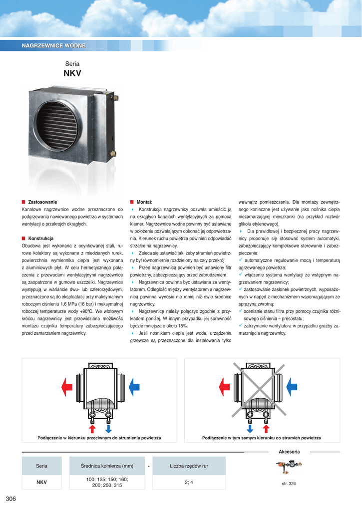 NAGRZEWNICE WODNE Seria NKV Zastosowanie Kanaãowe nagrzewnice wodne przeznaczone do podgrzewania nawiewanego powietrza w systemach wentylacji o przekrojch okrćgãych. J Konstrukcja Obudowa jest wykonana z ocynkowanej stali, rurowe kolektory sć wykonane z miedzianych rurek, powierzchnia wymiennika ciepãa jest wykonana z aluminiowych pãyt. W celu hermetycznego poãćczenia z przewodami wentylacyjnymi nagrzewnice sć zaopatrzone w gumowe uszczelki. Nagrzewnice wystĕpujć w wariancie dwu- lub czterorzĕdowym, przeznaczone sć do eksploatacji przy maksymalnym roboczym ciŋnieniu 1,6 MPa (16 bar) i maksymalnej roboczej temperaturze wody +90ºC. We wlotowym króþcu nagrzewnicy jest przewidziana moŧliwoŋþ montaŧu czujnika temperatury zabezpieczajćcego przed zamarzaniem nagrzewnicy. J Montaŧ Konstrukcja nagrzewnicy pozwala umieŋciþ jć na okrćgãych kanaãach wentylacyjnych za pomocć klamer. Nagrzewnice wodne powinny byþ ustawiane w poãoŧeniu pozwalajćcym dokonaþ jej odpowietrzania. Kierunek ruchu powietrza powinien odpowiadaþ strzaãce na nagrzewnicy. Zaleca siĕ ustawiaþ tak, ŧeby strumieĸ powietrzny byã równomiernie rozdzielony na caãy przekrój. Przed nagrzewnicć powinien byþ ustawiony Àltr powietrzny, zabezpieczajćcy przed zabrudzeniem. Nagrzewnica powinna byþ ustawiana za wentylatorem. Odlegãoŋþ miĕdzy wentylatorem a nagrzewnicć powinna wynosiþ nie mniej niŧ dwie ŋrednice nagrzewnicy. Nagrzewnicĕ naleŧy poãćczyþ zgodnie z przykãadem poniŧej. W innym przypadku jej sprawnoŋþ bĕdzie mniejsza o okoão 15%. Jeŋli noŋnikiem ciepãa jest woda, urzćdzenia grzewcze sć przeznaczone dla instalowania tylko J Podãćczenie w kierunku przeciwnym do strumienia powietrza wewnćtrz pomieszczenia. Dla montaŧy zewnĕtrznego konieczne jest uŧywanie jako noŋnika ciepãa niezamarzajćcej mieszkanki (na przykãad roztwór glikolu etylenowego). Dla prawidãowej i bezpiecznej pracy nagrzewnicy proponuje siĕ stosowaþ system automatyki, zabezpieczajćcy kompleksowe sterowanie i zabezpieczenie: 9 automatyczne regulowanie mocć i temperaturć ogrzewanego powietrza; 9 wãćczenie systemu wentylacji ze wstĕpnym nagrzewaniem nagrzewnicy; 9 zastosowanie zasãonek powietrznych, wyposaŧonych w napĕd z mechanizmem wspomagajćcym ze sprĕŧynć zwrotnć; 9 ocenianie stanu Àltra przy pomocy czujnika róŧnicowego ciŋnienia – presostatu; 9 zatrzymanie wentylatora w przypadku groťby zamarzniĕcia nagrzewnicy. Podãćczenie w tym samym kierunku co strumieĸ powietrza Akcesoria 306 Seria Ŋrednica koãnierza (mm) NKV 100; 125; 150; 160; 200; 250; 315 - Liczba rzĕdów rur 2; 4 str. 324 WWW.VENTS-GROUP.PL Wymiary nagrzewnic: Typ NKV 100-2 Wymiary (mm) ØD B H H3 L L1 L2 L3 K Liczba rzĕdów rur Waga (kg) 99 350 230 150 300 32 43 220 G 3/4” 2 3,9 NKV 100-4 99 350 230 150 300 28 65 220 G 3/4” 4 5,2 NKV 125-2 124 350 230 150 300 32 43 220 G 3/4” 2 4,0 NKV 125-4 124 350 230 150 300 28 65 220 G 3/4” 4 5,3 NKV 150-2 149 400 280 200 300 32 43 220 G 3/4” 2 7,5 NKV 150-4 149 400 280 200 300 28 65 220 G 3/4” 4 8,2 NKV 160-2 159 400 280 200 300 32 43 220 G 3/4” 2 7,5 NKV 160-4 159 400 280 200 300 28 65 220 G 3/4” 4 8,2 NKV 200-2 198 400 280 200 300 32 43 220 G 3/4” 2 7,5 NKV 200-4 198 400 280 200 300 28 65 220 G 3/4” 4 8,2 NKV 250-2 248 470 350 270 350 32 43 270 G 1” 2 10,3 NKV 250-4 248 470 350 270 350 28 65 270 G 1” 4 10,8 NKV 315-2 313 550 430 350 450 57 43 370 G 1” 2 12,6 NKV 315-4 313 550 430 350 450 53 65 370 G 1” 4 13,4 Strata ciśnienia powietrza nagrzewnic wodnych NKV a w do zę r ro te cz NAGRZEWNICE WODNE wa do zę ur dw NKV Zużycie powietrza (m3/h) Opór aerodynamiczny (Pa) NKV okrągła Prędkość strumienia powietrza (m/s) WWW.VENTS-GROUP.PL 307 NAGRZEWNICE WODNE Charakterystyka nagrzewnicy wodnej NKV NKV 100-2 / NKV 125-2 Moc nagrzewnicy (kW) Temp eratura zewnętrzna powietrza (oC) Temperatura powietrza po użyciu nagrzewnicy (oC) Spadek ciśnienia wody (kPa) Prędkość powietrza przepływa jącego przez nagrzewnicę (m/s) Wydajność powietrza przepływającego przez nagrzewnicę (m3/h) Wydajność wody przepływającej przez nagrzewnicę (l/s) Przykãad obliczania parametrów wodnej nagrzewnicy: Dla wydajnoŋci 250 m3/h, prĕdkoŋþ powietrza w przekroju nagrzewnicy wynosi 3,75 m/s c. Aby znaleťþ temperaturĕ, do której moŧliwe jest nagrzewanie powietrza, naleŧy od punktu przeciĕcia wydajnoŋci c z linić obliczeniowć zimowej temperatury ( opadajćca niebieska linia, na przykãad -15ºC) przeprowadziþ w lewo liniĕ d do przeciĕcia ze spadkiem temperatury wody (na przykãad 90/70) i poprowadziþ prostopadãć z osi temperatury powietrza po przejŋciu przez nagrzewnicĕ (17,5ºC) e. Dlatego aby okreŋliþ moc nagrzewnicy trzeba od punktu przeciĕcia wydajnoŋci c z linić obliczeniowej zimowej temperatury (wznoszćca siĕ czerwona linia, na przykãad -15ºC) przeprowadziþ na prawo liniĕ f w celu przeciĕcia ze spadkiem temperatury wody (na przykãad 90/70) i poprowadziþ prostopadãć na oŋ mocy nagrzewnicy (3,25 kW) g. Aby okreŋliþ niezbĕdnć wydajnoŋþ nagrzewnicy trzeba opuŋciþ prostopadãć h na liniĕ wydajnoŋci wody przepãywajćcej przez nagrzewnicĕ (0,42 l/s) Aby okreŋliþ spadek ciŋnienia wody w nagrzewnicy koniecznie trzeba znaleťþ punkt przeciĕcia linii h z wykresem straty ciŋnienia i przeprowadziþ w prawo prostopadãć i na oŋ spadku ciŋnienia wody (2,9 kPa). NKV NKV 100-4 / NKV 125-4 Moc nagrzewnicy (kW) Temp eratura zewnętrzna powietrza (oC) Temperatura powietrza po użyciu nagrzewnicy (oC) Wydajność powietrza przepływającego przez nagrzewnicę (m3/h) Spadek ciśnienia wody (kPa) Prędkość powietrza przepływa jącego przez nagrzewnicę (m/s) Wydajność wody przepływającej przez nagrzewnicę (l/s) Przykãad obliczania parametrów wodnej nagrzewnicy: 3 Dla wydajnoŋci 700 m /h, prĕdkoŋþ powietrza w przekroju nagrzewnicy wynosi 4,4 m/s c. Aby znaleťþ temperaturĕ, do której 
