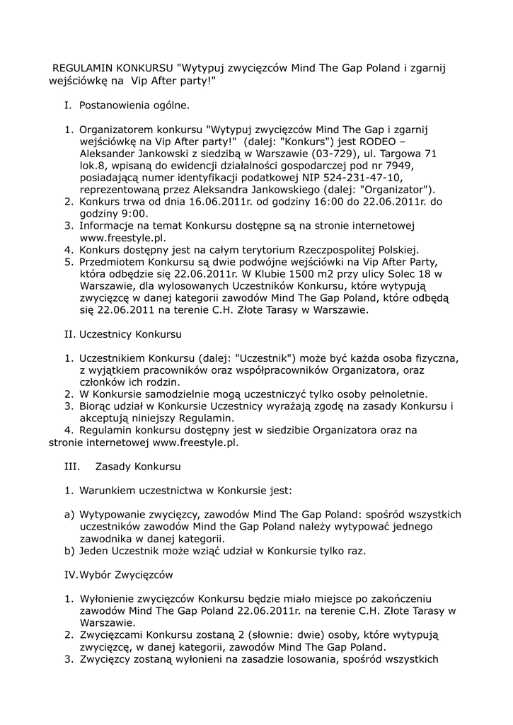 REGULAMIN KONKURSU "Wytypuj zwycięzców Mind The Gap Poland i zgarnij wejściówkę na Vip After party!" I. Postanowienia ogólne. 1. Organizatorem konkursu "Wytypuj zwycięzców Mind The Gap i zgarnij wejściówkę na Vip After party!" (dalej: "Konkurs") jest RODEO – Aleksander Jankowski z siedzibą w Warszawie (03-729), ul. Targowa 71 lok.8, wpisaną do ewidencji działalności gospodarczej pod nr 7949, posiadającą numer identyfikacji podatkowej NIP 524-231-47-10, reprezentowaną przez Aleksandra Jankowskiego (dalej: "Organizator"). 2. Konkurs trwa od dnia 16.06.2011r. od godziny 16:00 do 22.06.2011r. do godziny 9:00. 3. Informacje na temat Konkursu dostępne są na stronie internetowej www.freestyle.pl. 4. Konkurs dostępny jest na całym terytorium Rzeczpospolitej Polskiej. 5. Przedmiotem Konkursu są dwie podwójne wejściówki na Vip After Party, która odbędzie się 22.06.2011r. W Klubie 1500 m2 przy ulicy Solec 18 w Warszawie, dla wylosowanych Uczestników Konkursu, które wytypują zwycięzcę w danej kategorii zawodów Mind The Gap Poland, które odbędą się 22.06.2011 na terenie C.H. Złote Tarasy w Warszawie. II. Uczestnicy Konkursu 1. Uczestnikiem Konkursu (dalej: "Uczestnik") może być każda osoba fizyczna, z wyjątkiem pracowników oraz współpracowników Organizatora, oraz członków ich rodzin. 2. W Konkursie samodzielnie mogą uczestniczyć tylko osoby pełnoletnie. 3. Biorąc udział w Konkursie Uczestnicy wyrażają zgodę na zasady Konkursu i akceptują niniejszy Regulamin. 4. Regulamin konkursu dostępny jest w siedzibie Organizatora oraz na stronie internetowej www.freestyle.pl. III. Zasady Konkursu 1. Warunkiem uczestnictwa w Konkursie jest: a) Wytypowanie zwycięzcy, zawodów Mind The Gap Poland: spośród wszystkich uczestników zawodów Mind the Gap Poland należy wytypować jednego zawodnika w danej kategorii. b) Jeden Uczestnik może wziąć udział w Konkursie tylko raz. IV. Wybór Zwycięzców 1. Wyłonienie zwycięzców Konkursu będzie miało miejsce po zakończeniu zawodów Mind The Gap Poland 22.06.2011r. na terenie C.H. Złote Tarasy w Warszawie. 2. Zwycięzcami Konkursu zostaną 2 (słownie: dwie) osoby, które wytypują zwycięzcę, w danej kategorii, zawodów Mind The Gap Poland. 3. Zwycięzcy zostaną wyłonieni na zasadzie losowania, spośród wszystkich poprawnie udzielonych odpowiedzi. 4. Warunkiem odbioru nagrody jest obecność podczas losowania. 5. W przypadku nieobecności wylosowanego Uczestnika, zostanie wylosowany kolejny Uczestnik Konkursu, który poprawnie wytypował zwycięzcę zawodów Mind the Gap Poland. V. Nagrody 1. Fundatorem nagród jest Organizator. 2. Nagrodami w Konkursie są: dwie podwójne wejściówki na Vip After Party,która odbędzie się 22.06.2011r. W Klubie 1500 m2 przy ulicy Solec 18 w Warszawie. 3. Nagrody nie podlegają zamianie na inną nagrodę lub na jej równowartość pieniężną. 4. Zwycięzca nie może przenieść praw do przyznanej mu nagrody na osoby trzecie. Zwycięzca ma prawo zrzec się prawa do przyznanej mu nagrody składając Organizatorowi stosowne oświadczenie na piśmie. 5. Zwycięzca Konkursu traci prawo do nagrody, bez jakichkolwiek roszczeń lub żądań wobec Organizatora, jeżeli przekazane przez niego dane osobowe okażą się błędne lub nieprawdziwe. VI. Dane osobowe 1. Administratorem danych osobowych zbieranych i przetwarzanych w ramach Konkursu jest Organizator. 2. Organizator uprawniony jest do przetwarzania danych osobowych uczestników Konkursu jedynie w zakresie niezbędnym dla realizacji Konkursu, w szczególności w celu przekazania nagród zwycięzcom Konkursu. Po zakończeniu Konkursu dane osobowe będą anonimizowane poza przypadkami określonymi w przepisach prawa. 3. Na podstawie bezwzględnie obowiązujących przepisów o ochronie danych osobowych Uczestnicy mają prawo wglądu do swoich danych osobowych, ich poprawiania oraz zgłoszenia żądania zaprzestania ich przetwarzania. Prawo to może być wykonywane poprzez przesłanie odpowiedniego wniosku w formie pisemnej na adres: Freestyle.pl, ul. Targowa 71 lok. 8, 03-729 Warszawa. VII. Reklamacje 1. Prawo do składania reklamacji, w zakresie niezgodności przeprowadzenia Konkursu z Regulaminem, służy każdemu Uczestnikowi w ciągu 7 dni od daty wyłonienia zwycięzców Konkursu. 2. Reklamacja dopuszczalna jest w formie pisemnej zastrzeżonej pod rygorem nieważności skierowanej na adres do korespondencji Organizatora. - Freestyle.pl, ul. Targowa 71 lok. 8, 03-729 Warszawa. 3. Reklamacja zostanie rozpatrzona przez Organizatora w ciągu 14 dni od otrzymania. Powiadomienie o rozstrzygnięciu nastąpi pocztą, na adres podany przez Uczestnika, składającego reklamację.