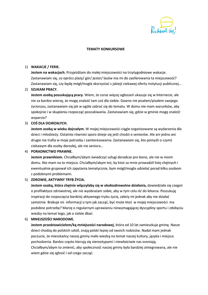 TEMATY KONKURSOWE 1) WAKACJE / FERIE. Jestem na wakacjach. Przyjeżdżam do małej miejscowości na trzytygodniowe wakacje. Zastanawiam się, co oprócz plaży/ gór/ jezior/ lasów ma mi do zaoferowania ta miejscowość? Zastanawiam się, czy będę mógł/mogła skorzystać z jakiejś ciekawej oferty instytucji publicznej… 2) SZUKAM PRACY. Jestem osobą poszukującą pracy. Wiem, że coraz więcej ogłoszeń ukazuje się w Internecie, ale nie za bardzo wierzę, że mogę znaleźć tam coś dla siebie. Dawno nie pisałam/pisałem swojego życiorysu, zastanawiam się jak w ogóle zabrać się do tematu. W domu nie mam warunków, aby spokojnie i w skupieniu rozpocząć poszukiwania. Zastanawiam się, gdzie w gminie mogę znaleźć wsparcie? 3) COŚ DLA DOJRZAŁYCH. Jestem osobą w wieku dojrzałym. W mojej miejscowości ciągle organizowane są wydarzenia dla dzieci i młodzieży. Ostatnio również sporo dzieje się jeśli chodzi o seniorów. Ale ani jedno ani drugie nie trafia w moje potrzeby i zainteresowania. Zastanawiam się, kto pomyśli o czymś ciekawym dla osoby dorosłej, ale nie seniora… 4) PORADNICTWO PRAWNE. Jestem prawnikiem. Chciałbym/abym świadczyć usługi doradcze pro bono, ale nie w moim domu. Nie mam na to miejsca. Chciałbym/abym też, by ktoś za mnie prowadził listę chętnych i ewentualnie grupował ich zapytania tematycznie, bym mógł/mogła udzielać porad kilku osobom z podobnymi problemami. 5) ZDROWIE, AKTYWNY TRYB ŻYCIA. Jestem osobą, która chętnie włączyłaby się w okołozdrowotne działania, dowiedziała się czegoś o profilaktyce zdrowotnej, ale nie wyobrażam sobie, aby w tym celu iść do lekarza. Poszukuję inspiracji do rozpoczęcia bardziej aktywnego trybu życia, zależy mi jednak aby nie działać samotnie. Brakuje mi informacji o tym jak zacząć, być może ktoś w mojej miejscowości ma podobne potrzeby? Marzę o regularnym uprawianiu niewymagającej dyscypliny sportu i zdobyciu wiedzy na temat tego, jak o siebie dbać. 6) MNIEJSZOŚCI NARODOWE. Jestem przedstawicielem/ką mniejszości narodowej, która od 10 lat zamieszkuje gminę. Nasze dzieci chodzą do polskich szkół, znają polski lepiej od swoich rodziców. Nadal mam jednak poczucie, że mieszkańcy naszej gminy mało wiedzą na temat naszej kultury, języka i miejsca pochodzenia. Bardzo często kierują się stereotypami i niewłaściwie nas oceniają. Chciałbym/abym to zmienić, aby społeczność naszej gminy była bardziej zintegrowana, ale nie wiem gdzie się zgłosić i od czego zacząć. 7) WOLONTARIAT. Jestem osobą aktywną i doświadczonym pracownikiem. W życiu nabyłem/nabyłam już wiele różnych umiejętności, mam chęć dzielenia się swoją wiedzą z innymi. Mogę poświęcić na to kilka godzin w tygodniu. Wiele słyszę o wolontariacie, ale nie wiem kto mógłby mi pomóc w zostaniu wolontariuszem/wolontariuszką, nie mam też miejsca ani sprzętu, dzięki którym wymiana umiejętności mogłaby się odbywać. 8) COŚ DLA MŁODEGO CZŁOWIEKA. Czy ktoś dostrzega młodych ludzi pomiędzy 16 a 30 rokiem życia? Zastanawiam się dlaczego wszystko co się dzieje w mojej miejscowości dotyczy małych dzieci lub seniorów. Interesuje mnie muzyka, film, komiks, dziennikarstwo… Od czasu do czasu chętnie spotkam się w fajnej atmosferze, żeby pogadać, napić się kawy. Kogo interesują moje potrzeby?