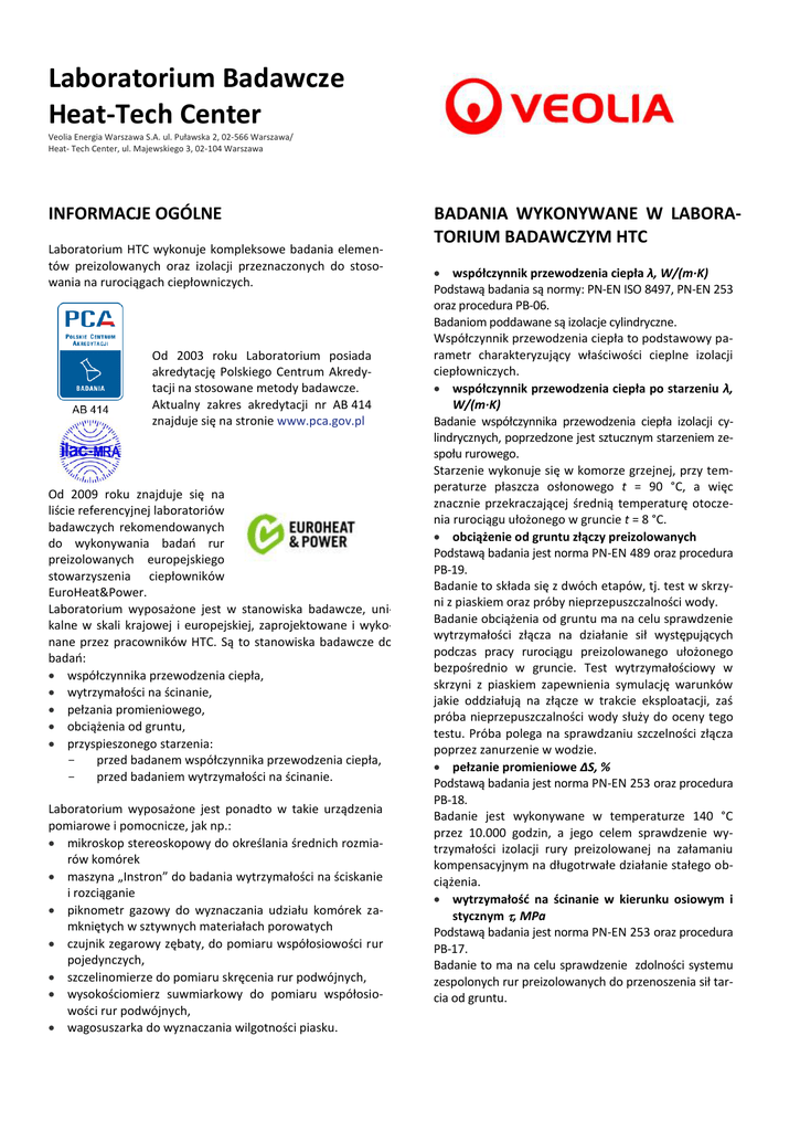 Laboratorium Badawcze Heat-Tech Center Veolia Energia Warszawa S.A. ul. Puławska 2, 02-566 Warszawa/ Heat- Tech Center, ul. Majewskiego 3, 02-104 Warszawa INFORMACJE OGÓLNE Laboratorium HTC wykonuje kompleksowe badania elementów preizolowanych oraz izolacji przeznaczonych do stosowania na rurociągach ciepłowniczych. Od 2003 roku Laboratorium posiada akredytację Polskiego Centrum Akredytacji na stosowane metody badawcze. Aktualny zakres akredytacji nr AB 414 znajduje się na stronie www.pca.gov.pl Od 2009 roku znajduje się na liście referencyjnej laboratoriów badawczych rekomendowanych do wykonywania badań rur preizolowanych europejskiego stowarzyszenia ciepłowników EuroHeat&Power. Laboratorium wyposażone jest w stanowiska badawcze, unikalne w skali krajowej i europejskiej, zaprojektowane i wykonane przez pracowników HTC. Są to stanowiska badawcze do badań: współczynnika przewodzenia ciepła, wytrzymałości na ścinanie, pełzania promieniowego, obciążenia od gruntu, przyspieszonego starzenia: przed badanem współczynnika przewodzenia ciepła, przed badaniem wytrzymałości na ścinanie. Laboratorium wyposażone jest ponadto w takie urządzenia pomiarowe i pomocnicze, jak np.: mikroskop stereoskopowy do określania średnich rozmiarów komórek maszyna „Instron” do badania wytrzymałości na ściskanie i rozciąganie piknometr gazowy do wyznaczania udziału komórek zamkniętych w sztywnych materiałach porowatych czujnik zegarowy zębaty, do pomiaru współosiowości rur pojedynczych, szczelinomierze do pomiaru skręcenia rur podwójnych, wysokościomierz suwmiarkowy do pomiaru współosiowości rur podwójnych, wagosuszarka do wyznaczania wilgotności piasku. BADANIA WYKONYWANE W LABORATORIUM BADAWCZYM HTC współczynnik przewodzenia ciepła λ, W/(m·K) Podstawą badania są normy: PN-EN ISO 8497, PN-EN 253 oraz procedura PB-06. Badaniom poddawane są izolacje cylindryczne. Współczynnik przewodzenia ciepła to podstawowy parametr charakteryzujący właściwości cieplne izolacji ciepłowniczych. współczynnik przewodzenia ciepła po starzeniu λ, W/(m·K) Badanie współczynnika przewodzenia ciepła izolacji cylindrycznych, poprzedzone jest sztucznym starzeniem zespołu rurowego. Starzenie wykonuje się w komorze grzejnej, przy temperaturze płaszcza osłonowego t = 90 °C, a więc znacznie przekraczającej średnią temperaturę otoczenia rurociągu ułożonego w gruncie t = 8 °C. obciążenie od gruntu złączy preizolowanych Podstawą badania jest norma PN-EN 489 oraz procedura PB-19. Badanie to składa się z dwóch etapów, tj. test w skrzyni z piaskiem oraz próby nieprzepuszczalności wody. Badanie obciążenia od gruntu ma na celu sprawdzenie wytrzymałości złącza na działanie sił występujących podczas pracy rurociągu preizolowanego ułożonego bezpośrednio w gruncie. Test wytrzymałościowy w skrzyni z piaskiem zapewnienia symulację warunków jakie oddziałują na złącze w trakcie eksploatacji, zaś próba nieprzepuszczalności wody służy do oceny tego testu. Próba polega na sprawdzaniu szczelności złącza poprzez zanurzenie w wodzie. pełzanie promieniowe ΔS, % Podstawą badania jest norma PN-EN 253 oraz procedura PB-18. Badanie jest wykonywane w temperaturze 140 °C przez 10.000 godzin, a jego celem sprawdzenie wytrzymałości izolacji rury preizolowanej na załamaniu kompensacyjnym na długotrwałe działanie stałego obciążenia. wytrzymałość na ścinanie w kierunku osiowym i stycznym , MPa Podstawą badania jest norma PN-EN 253 oraz procedura PB-17. Badanie to ma na celu sprawdzenie zdolności systemu zespolonych rur preizolowanych do przenoszenia sił tarcia od gruntu. wytrzymałość na ścinanie po starzeniu , MPa chłonność wody w podwyższonej temperaturze WAV, % Podstawa badania – PN EN 253:2009, PB-17. Proces przyspieszonego starzenia realizowany jest przy temperaturze rury przewodowej znacznie przekraczającej rzeczywistą temperaturę pracy ciągłej pianki PUR. Zespół rurowy, którego przewidywana trwałość w ciągłej temperaturze pracy 120 °C wynosi 30 lat, starzony jest w temperaturze t = 160 °C przez 3600 godzin lub w temperaturze t = 170 °C przez 1450 godzin. Po starzeniu wykonywane jest badanie wytrzymałości na ścinanie styczne lub osiowe. Podstawa badania: PN-EN 253, PB-20. Badanie ma na celu sprawdzenie odporności izolacji cieplnej na zniszczenie wskutek zalania gorącą wodą. chłonność wody przez zanurzenie WAV, % Podstawa badania – PN-C-89084, PB-20. Badanie ma na celu sprawdzenie nasiąkliwości tworzywa izolacji cieplnej poprzez pomiar zmiany wyporu hydrostatycznego próbki zanurzonej w zimnej wodzie. odchylenie od współosiowości e, mm wytrzymałość na ściskanie σ, MPa Podstawa badania – PN-EN 253, PN-EN 826, PN-C-89071, PB-20. Badanie polega na określeniu wytrzymałości na ściskanie w kierunku promieniowym, przy 10% odkształceniu względnym. Podstawa badania – PN-EN 253, PB-20. Badanie ma na celu sprawdzenie współosiowości rury osłonowej w stosunku do rury stalowej. Odchylenie od współosiowości oznacza, że grubość izolacji w przekroju rury nie jest równomierna, a to wiąże się z utrudnieniem prawidłowego wykonania zespołu złącza. wydłużenie przy zerwaniu A, % badania rur preizolowanych podwójnych: Podstawa badania – PN-EN 253, PB-20. Badanie poddaje się płaszcz osłonowy HDPE rur preizolowanych. Podstawa badania – PN-EN 15698-1, PB-20. Badania przeprowadzane w HTC: - położenie względem siebie końców rur przewodowych, - odległość między rurami przewodowymi, - skręcenie rur przewodowych, - współosiowość rur. gęstość pozorna ρ, kg/m 3 Badanie wykonywane jest według norm: PN-EN ISO 845, PN-EN 1602, PN-EN 13470, PN-EN 253, PB-20. Gęstość pozorna to ważny parametr wytrzymałościowy materiału izolacji. Duża gęstość pozorna zapewnia właściwą wytrzymałość mechaniczną pianki oraz odporność preizolowanego zespo