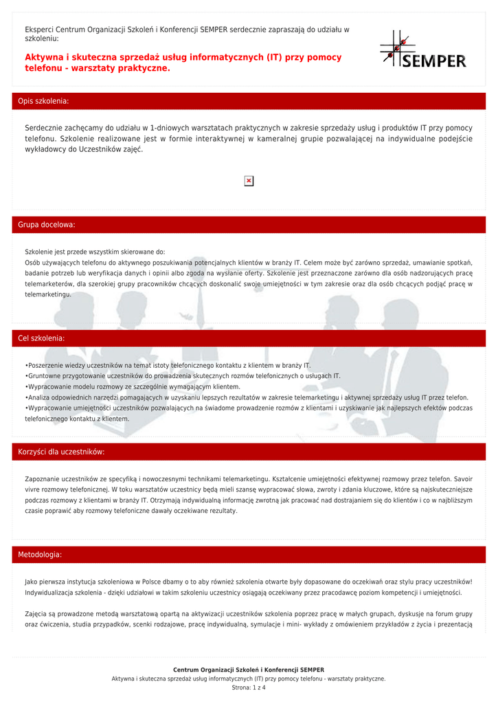 Eksperci Centrum Organizacji Szkoleń i Konferencji SEMPER serdecznie zapraszają do udziału w szkoleniu: Aktywna i skuteczna sprzedaż usług informatycznych (IT) przy pomocy telefonu - warsztaty praktyczne. Opis szkolenia: Serdecznie zachęcamy do udziału w 1-dniowych warsztatach praktycznych w zakresie sprzedaży usług i produktów IT przy pomocy telefonu. Szkolenie realizowane jest w formie interaktywnej w kameralnej grupie pozwalającej na indywidualne podejście wykładowcy do Uczestników zajęć. Grupa docelowa: Szkolenie jest przede wszystkim skierowane do: Osób używających telefonu do aktywnego poszukiwania potencjalnych klientów w branży IT. Celem może być zarówno sprzedaż, umawianie spotkań, badanie potrzeb lub weryfikacja danych i opinii albo zgoda na wysłanie oferty. Szkolenie jest przeznaczone zarówno dla osób nadzorujących pracę telemarketerów, dla szerokiej grupy pracowników chcących doskonalić swoje umiejętności w tym zakresie oraz dla osób chcących podjąć pracę w telemarketingu. Cel szkolenia: •Poszerzenie wiedzy uczestników na temat istoty telefonicznego kontaktu z klientem w branży IT. •Gruntowne przygotowanie uczestników do prowadzenia skutecznych rozmów telefonicznych o usługach IT. •Wypracowanie modelu rozmowy ze szczególnie wymagającym klientem. •Analiza odpowiednich narzędzi pomagających w uzyskaniu lepszych rezultatów w zakresie telemarketingu i aktywnej sprzedaży usług IT przez telefon. •Wypracowanie umiejętności uczestników pozwalających na świadome prowadzenie rozmów z klientami i uzyskiwanie jak najlepszych efektów podczas telefonicznego kontaktu z klientem. Korzyści dla uczestników: Zapoznanie uczestników ze specyfiką i nowoczesnymi technikami telemarketingu. Kształcenie umiejętności efektywnej rozmowy przez telefon. Savoir vivre rozmowy telefonicznej. W toku warsztatów uczestnicy będą mieli szansę wypracować słowa, zwroty i zdania kluczowe, które są najskuteczniejsze podczas rozmowy z klientami w branży IT. Otrzymają indywidualną informację zwrotną jak pracować nad dostrajaniem się do klientów i co w najbliższym czasie poprawić aby rozmowy telefoniczne dawały oczekiwane rezultaty. Metodologia: Jako pierwsza instytucja szkoleniowa w Polsce dbamy o to aby również szkolenia otwarte były dopasowane do oczekiwań oraz stylu pracy uczestników! Indywidualizacja szkolenia - dzięki udziałowi w takim szkoleniu uczestnicy osiągają oczekiwany przez pracodawcę poziom kompetencji i umiejętności. Zajęcia są prowadzone metodą warsztatową opartą na aktywizacji uczestników szkolenia poprzez pracę w małych grupach, dyskusje na forum grupy oraz ćwiczenia, studia przypadków, scenki rodzajowe, pracę indywidualną, symulacje i mini- wykłady z omówieniem przykładów z życia i prezentacją Centrum Organizacji Szkoleń i Konferencji SEMPER Aktywna i skuteczna sprzedaż usług informatycznych (IT) przy pomocy telefonu - warsztaty praktyczne. Strona: 1 z 4 multimedialną. Przedmiotem zajęć są realne trudności uwzględniające specyfikę danej branży oraz potrzeby i możliwości osób biorących udział w warsztatach. Uczestnicy uczą się poprzez doświadczenie – ćwiczą różne sytuacje, mają możliwość konsultacji indywidualnych. Nauka poprzez kreatywność, elastyczność i osobiste doświadczenia jest najskuteczniejszą formą zdobywania nowych umiejętności. Trener: Anna Specjalizacja trenerska: Trener kompetencji miękkich: Procesy doskonalenia umiejętności komunikacyjnych. Umiejętności efektywnego rozwiązywania konfliktów. Umiejętności radzenia sobie z trudnymi sytuacjami. Treningi radzenia sobie ze stresem. Treningi profesjonalnej obsługi klienta, telemarketingu oraz sprzedaży. Warsztaty z ocen pracowniczych a także zarządzania zespołem pracowniczym. Program szkolenia: 1.Powitanie- rozpoczęcie szkolenia. a.Autoprezentacja uczestników szkolenia. b.Wymiana doświadczeń w zakresie telefonicznej obsługi klienta. 2.Telemarketing w branży IT– zagadnienia wstępne. a. Skuteczność komunikacji telefonicznej. b. Cele i ich realizacja. 3. Jak działa telemarketing w branży IT? a. Ćwiczenia warsztatowe w grupie. b. Dyskusja moderowana podsumowująca zajęcia warsztatowe. 4. Osoba telemarketera. a. Wypracowanie najważniejszych zasad telemarketingu - zajęcia warsztatowe. b. Telefon jako szczególne narzędzie komunikacji. c. Ja w roli telemarketera. d. Jak mówić o usłucha IT żeby ludzie nas słuchali? e. Umiejętność słuchania rozmówcy. 5. Dobra organizacja pracy telemarketera. a. Sposoby zapisywania informacji o klientach. b. Umiejętne korzystanie z terminarza i pamięć o kolejnych kontaktach z klientami. 6. Klient - rozmówca unikalny. a. Sondowanie klienta i budowanie relacji długofalowych. b. Techniki nawiązywania relacji i ocieplania kontaktu. c. Wpływ temperamentu i osobowości na kontakt przez telefon. d. Techniki wywierania wpływu w rozmowie telefonicznej. 7. Etapy skutecznej rozmowy. a. Przygotowanie do rozmowy. b. Jakich pretekstów użyć by skutecznie zacząć rozmowę? c. Jak ocieplić zimny kontakt i kiedy wykonać następny krok? d. Język korzyści- rozmowa o produkcie. e. Podsumowanie ustaleń. Centrum Organizacji Szkoleń i Konferencji SEMPER Aktywna i skuteczna sprzedaż usług informatycznych (IT) przy pomocy telefonu - warsztaty praktyczne. Strona: 2 z 4 8. Podsumowanie-efektywność działań telemarketingowych w branży IT. Informacje organizacyjne: Na kilka dni przed terminem wydarzenia skontaktujemy się z Państwem aby zapytać o Państwa oczekiwania, dotychczasowe doświadczenia i umiejętności, co pozwoli nam na częściowe dopasowanie programu szkolenia do Państwa potrzeb. -szkolenie trwa 1 dzień (8h); -zajęcia odbywają się w godzinach 10.00-18.00; -ze względu na warsztatową formę szkolenia maksymalna liczba uczestników to 15 osób; -w programie szkolenia przewidziane są 2 przerwy kawowe or