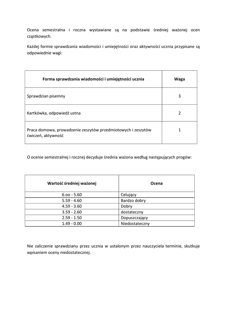 Ocena semestralna i roczna wystawiane są na podstawie średniej ważonej ocen cząstkowych. Każdej formie sprawdzania wiadomości i umiejętności oraz aktywności ucznia przypisane są odpowiednie wagi: Forma sprawdzania wiadomości i umiejętności ucznia Waga Sprawdzian pisemny 3 Kartkówka, odpowiedź ustna 2 Praca domowa, prowadzenie zeszytów przedmiotowych i zeszytów ćwiczeń, aktywność 1 O ocenie semestralnej i rocznej decyduje średnia ważona według następujących progów: Wartość średniej ważonej 6.oo - 5.60 5.59 - 4.60 4.59 - 3.60 3.59 - 2.60 2.59 - 1.50 1.49 - 0.00 Celujący Bardzo dobry Dobry dostateczny Dopuszczający Niedostateczny Ocena Nie zaliczenie sprawdzianu przez ucznia w ustalonym przez nauczyciela terminie, skutkuje wpisaniem oceny niedostatecznej. Ocena semestralna i roczna wystawiane są na podstawie średniej ważonej ocen cząstkowych. Każdej formie sprawdzania wiadomości i umiejętności oraz aktywności ucznia przypisane są odpowiednie wagi: Forma sprawdzania wiadomości i umiejętności ucznia Waga Sprawdzian pisemny 3 Kartkówka, odpowiedź ustna 2 Praca domowa, prowadzenie zeszytów przedmiotowych i zeszytów ćwiczeń, aktywność 1 O ocenie semestralnej i rocznej decyduje średnia ważona według następujących progów: Wartość średniej ważonej 6.oo - 5.60 5.59 - 4.60 4.59 - 3.60 3.59 - 2.60 2.59 - 1.50 1.49 - 0.00 Celujący Bardzo dobry Dobry dostateczny Dopuszczający Niedostateczny Ocena Nie zaliczenie sprawdzianu przez ucznia w ustalonym przez nauczyciela terminie, skutkuje wpisaniem oceny niedostatecznej. Ocena semestralna i roczna wystawiane są na podstawie średniej ważonej ocen cząstkowych. Każdej formie sprawdzania wiadomości i umiejętności oraz aktywności ucznia przypisane są odpowiednie wagi: Forma sprawdzania wiadomości i umiejętności ucznia Waga Sprawdzian pisemny 3 Kartkówka, odpowiedź ustna 2 Praca domowa, prowadzenie zeszytów przedmiotowych i zeszytów ćwiczeń, aktywność 1 O ocenie semestralnej i rocznej decyduje średnia ważona według następujących progów: Wartość średniej ważonej 6.oo - 5.60 5.59 - 4.60 4.59 - 3.60 3.59 - 2.60 2.59 - 1.50 1.49 - 0.00 Celujący Bardzo dobry Dobry dostateczny Dopuszczający Niedostateczny Ocena Nie zaliczenie sprawdzianu przez ucznia w ustalonym przez nauczyciela terminie, skutkuje wpisaniem oceny niedostatecznej.