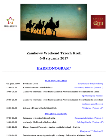 Zamkowy Weekend Trzech Króli 6-8 stycznia 2017 HARMONOGRAM* 06.01.2017 r. (PIĄTEK) Od godz.16.00 Powitanie Gości 17.00-21.00 Królewska uczta - obiadokolacja 19.00-20.00 Zamkowe opowieści – zwiedzanie Zamku z Przewodnikiem i deszczykiem dla Dzieci Rozpoczęcie doby hotelowej Restauracja Refektarz (Poziom I) Spotkanie przy Recepcji 20.00-21.00 Zamkowe opowieści – zwiedzanie Zamku z Przewodnikiem i deszczykiem dla Dorosłych Spotkanie przy Recepcji 22.00-02.00 Zabawa z Dj-em w Castle Night Club Winiarnia (Poziom „0”) 07.01.2017 r. (SOBOTA) 07.00-11.00 Śniadanie w formie obfitego bufetu 10.00-12.00 Animacje dla Dzieci w Bajkogrodzie 12.00-12.30 Damy, Rycerze i Paziowie – stroje z epoki dla Małych i Dużych Restauracja Refektarz (Poziom I) Sale Jagiellonów (Poziom „0”) Zbrojownia*** (Poziom I) 12.30-14.00 Średniowiecze na wyciągnięcie ręki – zabawy i fechtunek z udziałem Gości Sale Jagiellonów (Poziom „0”) 14.00-15.00 Grzanie, smocze ogony i kiełbaski na kiju – rodzinne ognisko Miejsce grillowe przy Zamku 15.00-17.00 Animacje dla Dzieci w Bajkogrodzie 17.00-21.00 Królewska uczta - obiadokolacja 20.00-23.00 Przyjemny dreszczyk emocji w Castle Casino** Sale Jagiellonów (Poziom „0”) Restauracja Refektarz (Poziom I) Zbrojownia - budynek naprzeciwko Zamku 22.00-02.00 Zabawa z Dj-em w Castle Night Club Winiarnia (Poziom „0”) 08.01.2017 r. (NIEDZIELA) 07.00-11.00 Śniadanie w formie obfitego bufetu 10.00 Złociste przysmaki – Akademia Kulinarna 12.00 Zakończenie doby hotelowej Restauracja Refektarz (Poziom I) Zbrojownia*** (Poziom I) Prośba o wymeldowanie * Harmonogram ramowy może ulec zmianie **Płatne dodatkowo – 10 PLN/Osoba PONADTO ZAPRASZAMY DO SKORZYSTANIA Z DODATKOWYCH ATRAKCJI: Centrum Rekreacji (w cenie pobytu) basen, sauny - czynne codziennie od 08.00-22.00 Baikogród – Klub Malucha (w cenie pobytu) - codziennie w godz. 8.00 – 22.00 Sala Fitness - /Crossfit Room , stół do tenisa (w cenie pobytu) - codziennie 7.00-23.00 (bezpłatnie) –Budynek Zbrojowni Zbrojownia (kręgielnia, bilard) - czynne w piątek w godz. 17.00-23.00, sobota-niedziela w godz. 15.00-23.00