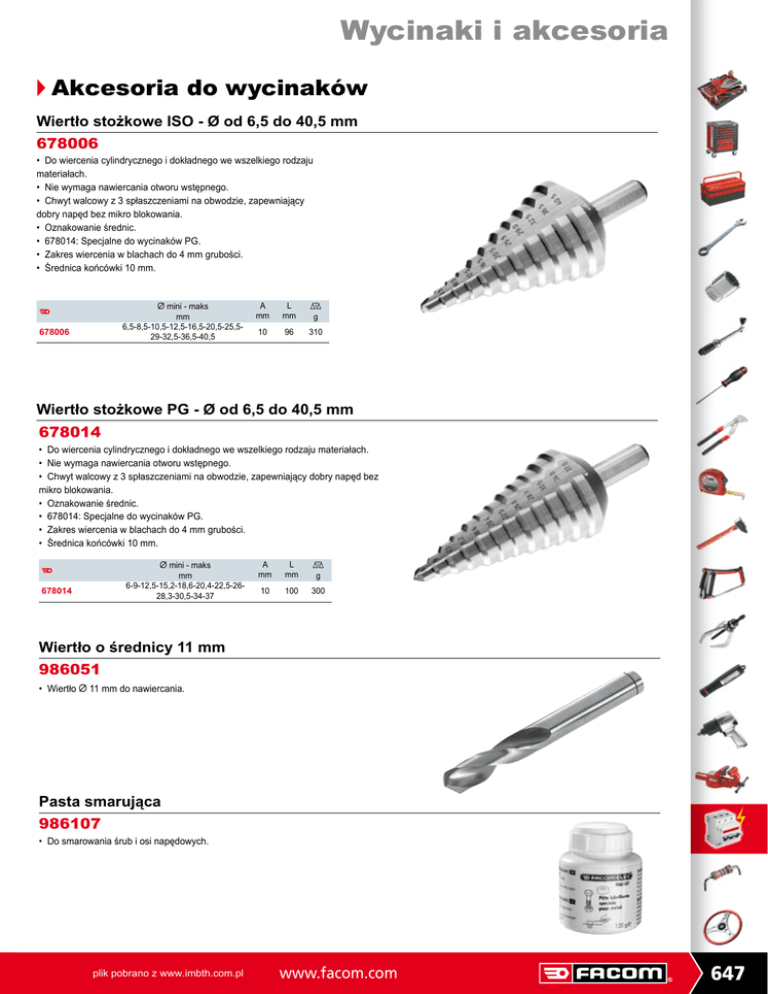 Wycinaki i akcesoria u Akcesoria do wycinaków Wiertło stożkowe ISO - Ø od 6,5 do 40,5 mm 678006 • Do wiercenia cylindrycznego i dokładnego we wszelkiego rodzaju materiałach. • Nie wymaga nawiercania otworu wstępnego. • Chwyt walcowy z 3 spłaszczeniami na obwodzie, zapewniający dobry napęd bez mikro blokowania. • Oznakowanie średnic. • 678014: Specjalne do wycinaków PG. • Zakres wiercenia w blachach do 4 mm grubości. • Średnica końcówki 10 mm. d mini - maks mm 6,5-8,5-10,5-12,5-16,5-20,5-25,529-32,5-36,5-40,5 F 678006 A mm L mm D g 10 96 310 Wiertło stożkowe PG - Ø od 6,5 do 40,5 mm 678014 • Do wiercenia cylindrycznego i dokładnego we wszelkiego rodzaju materiałach. • Nie wymaga nawiercania otworu wstępnego. • Chwyt walcowy z 3 spłaszczeniami na obwodzie, zapewniający dobry napęd bez mikro blokowania. • Oznakowanie średnic. • 678014: Specjalne do wycinaków PG. • Zakres wiercenia w blachach do 4 mm grubości. • Średnica końcówki 10 mm. mini -- maks maxi ddmini mm 6-9-12,5-15,2-18,6-20,4-22,5-266-9-12,5-15,2-18,6-20,4-22,5-2628,3-30,5-34-37 F 678014 678014 A mm L mm D g 10 100 300 Wiertło o średnicy 11 mm 986051 • Wiertło d 11 mm do nawiercania. Pasta smarująca 986107 • Do smarowania śrub i osi napędowych. plik pobrano z www.imbth.com.pl www.facom.com 647