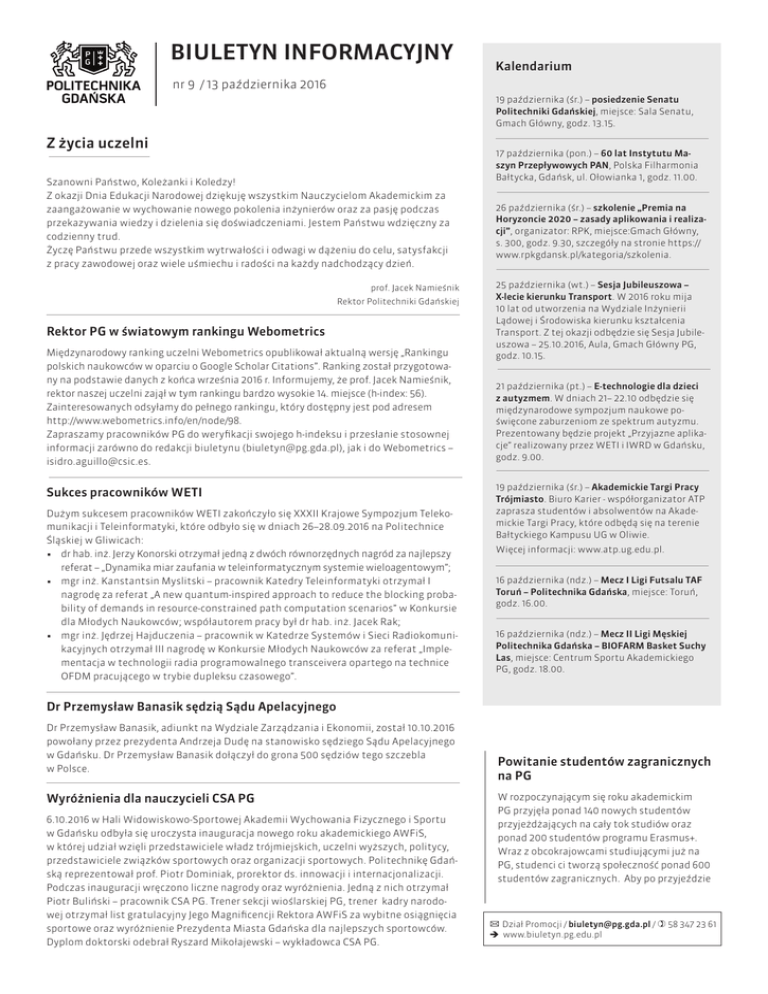 BIULETYN INFORMACYJNY Kalendarium nr 9 / 13 października 2016 19 października (śr.) – posiedzenie Senatu Politechniki Gdańskiej, miejsce: Sala Senatu, Gmach Główny, godz. 13.15. Z życia uczelni Szanowni Państwo, Koleżanki i Koledzy! Z okazji Dnia Edukacji Narodowej dziękuję wszystkim Nauczycielom Akademickim za zaangażowanie w wychowanie nowego pokolenia inżynierów oraz za pasję podczas przekazywania wiedzy i dzielenia się doświadczeniami. Jestem Państwu wdzięczny za codzienny trud. Życzę Państwu przede wszystkim wytrwałości i odwagi w dążeniu do celu, satysfakcji z pracy zawodowej oraz wiele uśmiechu i radości na każdy nadchodzący dzień. prof. Jacek Namieśnik Rektor Politechniki Gdańskiej Rektor PG w światowym rankingu Webometrics Międzynarodowy ranking uczelni Webometrics opublikował aktualną wersję „Rankingu polskich naukowców w oparciu o Google Scholar Citations”. Ranking został przygotowany na podstawie danych z końca września 2016 r. Informujemy, że prof. Jacek Namieśnik, rektor naszej uczelni zajął w tym rankingu bardzo wysokie 14. miejsce (h-index: 56). Zainteresowanych odsyłamy do pełnego rankingu, który dostępny jest pod adresem http://www.webometrics.info/en/node/98. Zapraszamy pracowników PG do weryfikacji swojego h-indeksu i przesłanie stosownej informacji zarówno do redakcji biuletynu ([email protected]), jak i do Webometrics – [email protected]. Sukces pracowników WETI Dużym sukcesem pracowników WETI zakończyło się XXXII Krajowe Sympozjum Telekomunikacji i Teleinformatyki, które odbyło się w dniach 26–28.09.2016 na Politechnice Śląskiej w Gliwicach: • dr hab. inż. Jerzy Konorski otrzymał jedną z dwóch równorzędnych nagród za najlepszy referat – „Dynamika miar zaufania w teleinformatycznym systemie wieloagentowym”; • mgr inż. Kanstantsin Myslitski – pracownik Katedry Teleinformatyki otrzymał I nagrodę za referat „A new quantum-inspired approach to reduce the blocking probability of demands in resource-constrained path computation scenarios” w Konkursie dla Młodych Naukowców; współautorem pracy był dr hab. inż. Jacek Rak; • mgr inż. Jędrzej Hajduczenia – pracownik w Katedrze Systemów i Sieci Radiokomunikacyjnych otrzymał III nagrodę w Konkursie Młodych Naukowców za referat „Implementacja w technologii radia programowalnego transceivera opartego na technice OFDM pracującego w trybie dupleksu czasowego”. 17 października (pon.) – 60 lat Instytutu Maszyn Przepływowych PAN, Polska Filharmonia Bałtycka, Gdańsk, ul. Ołowianka 1, godz. 11.00. 26 października (śr.) – szkolenie „Premia na Horyzoncie 2020 – zasady aplikowania i realizacji”, organizator: RPK, miejsce:Gmach Główny, s. 300, godz. 9.30, szczegóły na stronie https:// www.rpkgdansk.pl/kategoria/szkolenia. 25 października (wt.) – Sesja Jubileuszowa – X-lecie kierunku Transport. W 2016 roku mija 10 lat od utworzenia na Wydziale Inżynierii Lądowej i Środowiska kierunku kształcenia Transport. Z tej okazji odbędzie się Sesja Jubileuszowa – 25.10.2016, Aula, Gmach Główny PG, godz. 10.15. 21 października (pt.) – E-technologie dla dzieci z autyzmem. W dniach 21– 22.10 odbędzie się międzynarodowe sympozjum naukowe poświęcone zaburzeniom ze spektrum autyzmu. Prezentowany będzie projekt „Przyjazne aplikacje” realizowany przez WETI i IWRD w Gdańsku, godz. 9.00. 19 października (śr.) – Akademickie Targi Pracy Trójmiasto. Biuro Karier - współorganizator ATP zaprasza studentów i absolwentów na Akademickie Targi Pracy, które odbędą się na terenie Bałtyckiego Kampusu UG w Oliwie. Więcej informacji: www.atp.ug.edu.pl. 16 października (ndz.) – Mecz I Ligi Futsalu TAF Toruń – Politechnika Gdańska, miejsce: Toruń, godz. 16.00. 16 października (ndz.) – Mecz II Ligi Męskiej Politechnika Gdańska – BIOFARM Basket Suchy Las, miejsce: Centrum Sportu Akademickiego PG, godz. 18.00. Dr Przemysław Banasik sędzią Sądu Apelacyjnego Dr Przemysław Banasik, adiunkt na Wydziale Zarządzania i Ekonomii, został 10.10.2016 powołany przez prezydenta Andrzeja Dudę na stanowisko sędziego Sądu Apelacyjnego w Gdańsku. Dr Przemysław Banasik dołączył do grona 500 sędziów tego szczebla w Polsce. Wyróżnienia dla nauczycieli CSA PG 6.10.2016 w Hali Widowiskowo-Sportowej Akademii Wychowania Fizycznego i Sportu w Gdańsku odbyła się uroczysta inauguracja nowego roku akademickiego AWFiS, w której udział wzięli przedstawiciele władz trójmiejskich, uczelni wyższych, politycy, przedstawiciele związków sportowych oraz organizacji sportowych. Politechnikę Gdańską reprezentował prof. Piotr Dominiak, prorektor ds. innowacji i internacjonalizacji. Podczas inauguracji wręczono liczne nagrody oraz wyróżnienia. Jedną z nich otrzymał Piotr Buliński – pracownik CSA PG. Trener sekcji wioślarskiej PG, trener kadry narodowej otrzymał list gratulacyjny Jego Magnificencji Rektora AWFiS za wybitne osiągnięcia sportowe oraz wyróżnienie Prezydenta Miasta Gdańska dla najlepszych sportowców. Dyplom doktorski odebrał Ryszard Mikołajewski – wykładowca CSA PG. Powitanie studentów zagranicznych na PG W rozpoczynającym się roku akademickim PG przyjęła ponad 140 nowych studentów przyjeżdżających na cały tok studiów oraz ponad 200 studentów programu Erasmus+. Wraz z obcokrajowcami studiującymi już na PG, studenci ci tworzą społeczność ponad 600 studentów zagranicznych. Aby po przyjeździe ✉ Dział Promocji / [email protected] / 58 347 23 61 www.biuletyn.pg.edu.pl studenci zadomowili się na PG, uczelnia przy wsparciu ESN co roku organizuje dla nich Orientation Week, obejmujący m.in.: • spotkanie organizacyjne, w czasie którego studentom przedstawiane są najważniejsze informacje dotyczące uczelni; • imprezę we Wróblówce, w której tradycyjnie udział biorą studenci zagraniczni oraz przedstawiciele czterech uczelni gdańs