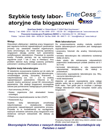 Szybkie testy laboratoryjne dla biogazowni EnerCess GmbHul. Robert-Bosch 732547 Bad Oeynhausen Niemcy tel.: 0049 - 5731 - 153 39 - 0 fax: 0049 - 5731 - 153 39 - 30 [email protected] www.enercess.de Pracownia Inwestycyjno-Projektowa INEKOul. Ostródzka 5314 - 200 Iława Polska tel.kom: 0048 - 694 – 49 96 24 tel./fax: 0048 - 89 - 648 71 - 51 [email protected] www.ineko.pl Wstęp Małe laboratorium Warunkiem efektywnej i stabilnej pracy biogazowni jest regularna kontrola najwaŜniejszych parametrów procesu (np. zawartość kwasów organicznych, azotu amonowego). Do chwili obecnej operatorzy biogazowni zlecają pomiar tych parametrów certyfikowanym laboratoriom. Powoduje to wysokie koszty. Ponadto pomiary nie są wykonywane regularnie (czyli 1 lub 2 razy w miesiącu). Inny problem stanowi duŜy odstęp czasowy pomiędzy pobraniem i analizą próbki (często parę dni). Do przeprowadzenia analizy metodą szybkich testów laboratoryjnych potrzebne jest następujące wyposaŜenie: • przenośny fotometr dla analizy fotometrycznej testów. • wirówka laboratoryjna dla oddzielenia substancji stałej od płynu. • dwie pipety dla odmierzania odpowiednich pojemności analizowanych próbek (średnio od 0.1 do 5 ml) • termostat laboratoryjny w celu zapewnienia odpowiedniej temperatury dla reakcji w probówkach. • róŜnorodne wyposaŜenie laboratoryjne (np. filtry, naczynia laboratoryjne etc.) • woda destylowana ZaleŜnie od jakości wyposaŜenia cena całego pakietu waha się w granicach od 6.000 do 9.000 EUR netto. Tam gdzie jest to moŜliwe z jednego małego laboratorium moŜe korzystać nawet parę biogazowni. Szybkie testy laboratoryjne W dziedzinie oczyszczania ścieków juŜ do wielu lat stosuje się standardowe szybkie testy laboratoryjne, umoŜliwiające prostą, korzystną finansowo i natychmiastową (ca. 0,5 – 2,0 h) analizę najwaŜniejszych parametrów. Obecnie w ten sposób moŜna pomierzyć ponad 60 róŜnorodnych parametrów. Dla obsługi biogazowni szczególnie celowe jest pomierzenie następujących parametrów: • Azot amonowy (N-NH4) • Kwasy organiczne (lub ekwiwalent kwasu octowego) • Chemiczne zapotrzebowanie na tlen (ChZT) • Kwasowość (kS) Szybkie testy laboratoryjne umoŜliwiają natychmiastowe i dostatecznie dokładne oznaczenie najwaŜniejszych parametrów procesu. Pozwala to w konsekwencji na wyciągniecie waŜnych wniosków odnośnie pracy biogazowni oraz dostarcza cennych wskazówek dla dalszej jej obsługi. Przenośny fotometr DR 2800 firmy HACH LANGE GmbH (Źródło: www.hach-lange.de) Skorzystajcie Państwo z naszych doświadczeń – Skontaktujcie się Państwo z nami! Przygotowanie próbek Kontrola jakości wyników analiz Wykonywanie szybkich testów laboratoryjnych jest nieskomplikowane. Ponadto dla uniknięcia błędów oraz zapewnienia wysokiej jakości wyników analiz zostały stworzone równieŜ proste procedury: • UŜytkownik moŜe za pomocą próbek o znanych zawartościach odpowiednich substancji sprawdzać poprawność wykonania poszczególnych kroków analizy. • Niektórzy producenci szybkich testów oferują specjalne, łatwe w uŜyciu programy (np. jako aplikacja dla Microsoft EXCEL) umoŜliwiające łatwe wykrywanie błędów i archiwizację wyników analiz. • Z uwagi na niski koszt jednostkowy testów Szybkie testy laboratoryjne moŜliwe jest regularne wykonywanie podwójnego Szybkie testy laboratoryjne są w porównaniu do oznaczenia. UmoŜliwia to prostą kontrolę wyników. tradycyjnych analiz laboratoryjnych bardzo korzystne cenowo. Przykład: • Szybki test LCK 365 „kwasy organiczne“ Polecamy: (25 testów, cena 70 EUR netto) Szczególnie polecamy produkty firmy: • Szybki test LCK 014 „ChZT“ HACH LANGE GmbH (25 testów, cena 64 EUR netto) Willstätterstraße 11 • Szybki test LCK 302 „azot amonowy“ 40549 Düsseldorf, Niemcy (25 testów, cena 64 EUR netto) 0049-211-5288-0/-143 Wykonanie jednego oznaczenia za pomocą testu Tel./fax.: [email protected] kosztuje więc jedynie około 3 EUR. Wydatki E-Mail: poniesione z tytułu kupna dodatkowego sprzętu np. Internet: www.hach-lange.de fotometru mogą się szybko zwrócić. Dzięki niskim kosztom testów laboratoryjnych, najwaŜniejsze parametry mogą być oznaczane duŜo częściej niŜ w Kontakt przypadku konwencjonalnych analiz laboratoryj- W razie pytań lub zamówień. Prosimy o kontakt z nych. nami Zalecamy następującą procedurę przy przygotowaniu próbek: • rozcieńczenie próbek wodą destylowaną (średnio 1:20) • odwirowanie rozcieńczonych próbek wirówką laboratoryjną (czas – 10 min. 13.000 obrotów na minutę) • filtrowanie odwirowanej części próbki filtrem o wielkości porów 1.2 µm (np. jednorazowe filtry nakładane na strzykawkę). • wykonywanie testów zgodnie z zaleceniami producenta Dr. Jürgen Wiese Działu badawczo-rozwojowy firmy EnerCess GmbH ul. Robert-Bosch 7 32547 Bad Oeynhausen, Niemcy Tel./fax.: 0049-6301-7986-79/-80 Komórka: 0049-160-96067997 Email: Juergen.Wiese@enercess,de Testy laboratoryjne firmy HACH LANGE dla oznaczania zawartości kwasów organicznych (Źródło: www.hach-lange.de) Jerzy Kujawski Pracownia inwestycyjno-projektowa INEKO ul.Ostródzka 53 14-200 Iława Tel./fax.: 0048-89-648-71-51 Komórka: 0048-694-499-624 Email: [email protected] Na Ŝyczenie stworzymy indywidualny program pomiarowy dla Państwa biogazowni ! © 2006 EnerCess GmbH, Bad Oeynhausen, Niemcy – firma konsorcjum M.A.X. Automation AG, Düsseldorf, Niemcy