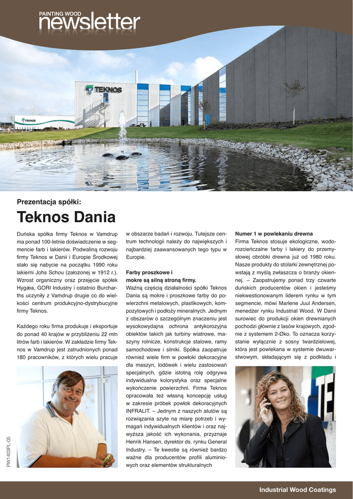Prezentacja spółki: Teknos Dania Duńska spółka firmy Teknos w Vamdrup ma ponad 100-letnie doświadczenie w segmencie farb i lakierów. Podwaliną rozwoju firmy Teknos w Danii i Europie Środkowej stało się nabycie na początku 1990 roku lakierni Johs Schou (założonej w 1912 r.). Wzrost organiczny oraz przejęcie spółek Hygæa, GORI Industry i ostatnio Burcharths uczyniły z Vamdrup drugie co do wielkości centrum produkcyjno-dystrybucyjne firmy Teknos. PW1403PL-05 Każdego roku firma produkuje i eksportuje do ponad 40 krajów w przybliżeniu 22 mln litrów farb i lakierów. W zakładzie firmy Teknos w Vamdrup jest zatrudnionych ponad 180 pracowników, z których wielu pracuje w obszarze badań i rozwoju. Tutejsze centrum technologii należy do największych i najbardziej zaawansowanych tego typu w Europie. Farby proszkowe i mokre są silną stroną firmy. Ważną częścią działalności spółki Teknos Dania są mokre i proszkowe farby do powierzchni metalowych, plastikowych, kompozytowych i podłoży mineralnych. Jednym z obszarów o szczególnym znaczeniu jest wysokowydajna ochrona antykorozyjna obiektów takich jak turbiny wiatrowe, maszyny rolnicze, konstrukcje stalowe, ramy samochodowe i silniki. Spółka zaopatruje również wiele firm w powłoki dekoracyjne dla maszyn, lodówek i wielu zastosowań specjalnych, gdzie istotną rolę odgrywa indywidualna kolorystyka oraz specjalne wykończenie powierzchni. Firma Teknos opracowała też własną koncepcję usług w zakresie próbek powłok dekoracyjnych INFRALIT. – Jednym z naszych atutów są rozwiązania szyte na miarę potrzeb i wymagań indywidualnych klientów i oraz najwyższa jakość ich wykonania, przyznaje Henrik Hansen, dyrektor ds. rynku General Industry. – Te kwestie są również bardzo ważne dla producentów profili aluminiowych oraz elementów strukturalnych Numer 1 w powlekaniu drewna Firma Teknos stosuje ekologiczne, wodorozcieńczalne farby i lakiery do przemysłowej obróbki drewna już od 1980 roku. Nasze produkty do stolarki zewnętrznej powstają z myślą zwłaszcza o branży okiennej. – Zaopatrujemy ponad trzy czwarte duńskich producentów okien i jesteśmy niekwestionowanym liderem rynku w tym segmencie, mówi Marlene Juul Andersen, menedżer rynku Industrial Wood. W Danii surowiec do produkcji okien drewnianych pochodzi głównie z lasów krajowych, zgodnie z systemem 2-Øko. To oznacza korzystanie wyłącznie z sosny twardzielowej, która jest powlekana w systemie dwuwarstwowym, składającym się z podkładu i Industrial Wood Coatings warstwy nawierzchniowej. W ofercie firmy Teknos znajdują się powłoki opracowane specjalnie na potrzeby systemu 2-Øko. Odbiorcami produktów marki Teknos do zastosowań wewnętrznych są głównie producenci paneli, listew i mebli. – Duński przemysł meblarski wyznacza standardy międzynarodowe i stawia surowe wymagania dotyczące jakości powłoki iw których obszarze nasz dział rozwoju produktów nieustannie wprowadza udoskonalenia, dodaje Marlene Juul Andersen. Znaczną część działalności firmy Teknos na tym polu stanowią wodorozcieńczalne i w 100% utwardzane promieniami UV powłoki. – Zaopatrujemy rynek produktów do zastosowań zewnętrznych, jak i wewnętrznych, w najnowocześniejsze, przyjazne dla środowiska i praktyczne systemy powłok, które na dobrą sprawę spełniają wszystkie wymagania. Zapewniamy również naszym klientom wsparcie merytoryczne z zakresu procesu aplikacji. Na tym budujemy sukces naszej marki w Danii, podsumowuje Marlene Juul Andersen. www.teknos.com Industrial Wood Coatings