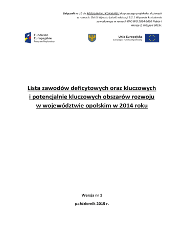 Załącznik nr 10 do REGULAMINU KONKURSU dotyczącego projektów złożonych w ramach: Osi IX Wysoka jakość edukacji 9.2.1 Wsparcie kształcenia zawodowego w ramach RPO WO 2014-2020 Nabór I Wersja 2, listopad 2015r. Lista zawodów deficytowych oraz kluczowych i potencjalnie kluczowych obszarów rozwoju w województwie opolskim w 2014 roku Wersja nr 1 październik 2015 r. Załącznik nr 10 do REGULAMINU KONKURSU dotyczącego projektów złożonych w ramach: Osi IX Wysoka jakość edukacji 9.2.1 Wsparcie kształcenia zawodowego w ramach RPO WO 2014-2020 Nabór I Wersja 2, listopad 2015r. Lp. Kod zawodu Nazwa zawodu Średnia miesięczna liczba ofert pracy zgłoszonych w roku Średnia miesięczna liczba zarejestrowanych bezrobotnych w roku Średnia miesięczna nadwyżka (deficyt) podaży siły roboczej w roku Wskaźnik intensywności nadwyżki (deficytu) zawodów 1 "235304" Lektor języka niemieckiego 3,1667 0,0833 -3,0833 38 2 "721206" Spawacz metodą TIG 19,4167 0,5833 -18,8333 33,2857 3 "411001" Administrator nieruchomości 2,5833 0,0833 -2,5 31 4 "242403" Specjalista do spraw szkoleń 2,3333 0,0833 -2,25 28 5 "422701" Ankieter 4,4167 0,1667 -4,25 26,5 6 "741104" Elektryk budowlany 2 0,0833 -1,9167 24 7 "816017" Operator urządzeń do produkcji wyrobów cukierniczych 15,0833 0,75 -14,3333 20,1111 8 "833202" Kierowca ciągnika siodłowego 16,3333 0,8333 -15,5 19,6 9 "311909" Technik automatyk 3,1667 0,1667 -3 19 10 "821204" Monter maszyn elektrycznych 2,6667 0,1667 -2,5 16 11 "811407" Operator urządzeń wytwórczych mieszanek betonowych 3,8333 0,25 -3,5833 15,3333 12 "722304" Operator maszyn do produkcji wyrobów z drutu, lin, siatek i kabli 40,4167 2,9167 -37,5 13,8571 13 "541308" Pracownik ochrony fizycznej I stopnia 12,6667 1,1667 -11,5 10,8571 14 "341202" Opiekun osoby starszej* 47,9167 4,9167 -43 9,7458 15 "816003" Operator maszyn i urządzeń przemysłu spożywczego* 15,0833 1,5833 -13,5 9,5263 16 "235301" Lektor języka angielskiego 5,5833 0,6667 -4,9167 8,375 17 "522302" Sprzedawca w branży mięsnej 6,5 0,8333 -5,6667 7,8 2 Załącznik nr 10 do REGULAMINU KONKURSU dotyczącego projektów złożonych w ramach: Osi IX Wysoka jakość edukacji 9.2.1 Wsparcie kształcenia zawodowego w ramach RPO WO 2014-2020 Nabór I Wersja 2, listopad 2015r. Operator wtryskarki 5,75 0,75 -5 7,6667 18 "814208" 19 "722313" Tokarz / frezer obrabiarek sterowanych numerycznie 4,0833 0,5833 -3,5 7 20 "721204" Spawacz metodą MAG 18,4167 2,8333 -15,5833 6,5 21 "241202" Doradca finansowy 14,3333 2,25 -12,0833 6,3704 22 "531202" Asystent nauczyciela przedszkola 7,5833 1,5833 -6 4,7895 23 "522304" Sprzedawca w branży spożywczej 10,9167 2,4167 -8,5 4,5172 24 "422201" Pracownik centrum obsługi telefonicznej (pracownik call center) 15,5833 3,5 -12,0833 4,4524 25 "722308" Operator obrabiarek sterowanych numerycznie 8,9167 2,0833 -6,8333 4,28 26 "541307" Pracownik ochrony fizycznej bez licencji 49 13,8333 -35,1667 3,5422 27 "524404" Telemarketer 11,5 3,4167 -8,0833 3,3659 28 "961302" Robotnik placowy 46,5833 15,5 -31,0833 3,0054 29 "833203" Kierowca samochodu ciężarowego 63,5833 26,1667 -37,4167 2,4299 30 "515303" Robotnik gospodarczy 381,6667 157,8333 -223,833 2,4182 *zawód szkolny (źródło:http://wup.opole.pl/dokumenty/Ranking_zawodow_deficytowych_i_nadwyzkowych_w_wojewodzt wie_opolskim_w_2014_roku.pdf, kwiecień 2015r.) W powyższej tabeli wyróżniono kolorem czerwonym zawody o bardzo wysokim deficycie, natomiast podkreślono zawody obecne w rankingu również w roku 2013. 3 Załącznik nr 10 do REGULAMINU KONKURSU dotyczącego projektów złożonych w ramach: Osi IX Wysoka jakość edukacji 9.2.1 Wsparcie kształcenia zawodowego w ramach RPO WO 2014-2020 Nabór I Wersja 2, listopad 2015r. Obszary rozwoju w województwie opolskim Skala Obszar SKALA OBSZAR Chemiczny Kluczowe obszary Obszary o dużym znaczeniu dla rozwoju Obszary rozwoju regionu rozwoju z uwzględnieniem technologii i wiedzy regionalnej Budowlany wraz z przemysłem mineralnym i usługami budowlanymi Maszynowy i elektromaszynowy Paliwowo-energetyczny Rolno-spożywczy Drzewno-papierniczy, w tym przemysł meblarski Metalowy i metalurgiczny Usługi medyczne i rehabilitacyjne Potencjalnie kluczowe Usługi turystyczne obszary rozwoju Transport i logistyka Usługi edukacyjne Przemysł lekki Usługi finansowe Handel Źródło: Strategia Rozwoju Województwa Opolskiego do 2020 r., załącznik do Uchwały Nr XXV/325/2012 Sejmiku Województwa Opolskiego z dnia 28 grudnia 2012 r. Kluczowe i potencjalnie kluczowe obszary rozwoju w województwie opolskim w podziale na zakresy działalności Kluczowe i potencjalnie Kluczowe i potencjalnie kluczowe obszary rozwoju Zakres działalności przemysł chemiczny Chemiczny poligrafia przemysł materiałów budowlanych i produkcja na rzecz Budowlany wraz z przemysłem 4 Załącznik nr 10 do REGULAMINU KONKURSU dotyczącego projektów złożonych w ramach: Osi IX Wysoka jakość edukacji 9.2.1 Wsparcie kształcenia zawodowego w ramach RPO WO 2014-2020 Nabór I Wersja 2, listopad 2015r. mineralnym i usługami budownictwa budowlanymi przemysł meblarski i wyposażenia wnętrz producenci okien i drzwi oraz żaluzji i rolet przemysł szklarski budowa konstrukcji stalowych usługi budowlane przemysł elektrotechniczny i elektroniczny Maszynowy i elektromaszynowy przemysł maszynowy i aparatury dla procesów przemysłowych przemysł precyzyjny produkcja na rzecz przemysłu środków transportu przemysł energetyczny Paliwowo-energetyczny energia „zielona” i ochrona środowiska przemysł spożywczy (produkcja i przetwórstwo żywności) Rolno-spożywczy rolnictwo i obsługa rolnictwa Drzewno-papierniczy, przemysł drzewny w tym przemysł meblarski przemysł papierniczy i opakowań (papierowych, szklanych i plastikowych) Metalowy i metalurgiczny przemysł metalowy i przetwarzania metali Usługi medyczne i rehabilitacyjne innowacyjny sektor opieki zdrowotnej i fizjoterapii Usługi turystyczne zintegrowany przestrze