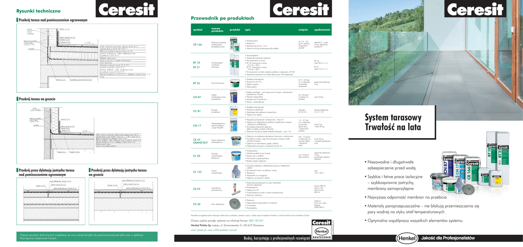 Rysunki techniczne Przewodnik po produktach Przekrój tarasu nad pomieszczeniem ogrzewanym , symbol nazwa produktu CR 166 Elastyczna powłoka wodoszczelna, dwuskładni-kowa BT 18 produkt Przekrój przez dylatację jastrychu tarasu nad pomieszczeniem ogrzewanym Przekrój przez dylatację jastrychu tarasu na gruncie zużycie opakowanie • • • • ok. 2,4 - 3,6 kg/m2 zależnie od grubości powłoki składnik A – worki 24 kg, składnik B – kanistry 8 l Wodoszczelna Elastyczna Mostkuje rysy do ok. 1 mm Stanowi ochronę antykorozyjną dla żelbetu • • • • Samoprzylepne Doskonała szczelność połączeń Do stosowania na zimno BT 18: stosowanie w temp. +5°C do +30°C BT 21: stosowanie w temp. – 5°C do +30°C • Do stosowania na lekko wilgotne podłoża w połączeniu z BT 26 • Możliwość stosowania na świeże betony (pon. 6% wilgotności) BT 21 Samoprzylepne membrany izolacyjne BT 26 Grunt bitumiczny • • • • CN 87 Szybko twardniejąca masa posadzkowa , Przekrój tarasu na gruncie opis Zwiększa przyczepność Stosowanie od -5°C Szybko wysycha Słaby zapach BT 18: rolka 20 m x 1 m BT 21: rolka 15 m x 1 m 0,15 - 0,3 kg/ m2 w zależności od sposobu stosowania pojemniki plastikowe 5 kg • Szybko twardnieje – ruch pieszy już po 3 godz., wykonywanie posadzek po 24 godz. • Wysoka wytrzymałość • Grubość od 10 do 80 mm • Mrozo- i wodoodporna ok. 2,0 kg/m2 na każdy mm grubości worki 25 kg CC 81 Emulsja kontaktowa • • • • obrzutka – 0,125 l/m2 kanistry plastikowe 2 l, 5 l i 10 l CM 17 Wysokoelastyczna zaprawa klejąca „Super Flexible” • Najwyższa przyczepność i elastyczność – klasa S1 • Odporna na odkształcenia podłoża na balkonach, tarasach i ogrzewaniu podłogowym • Do podłoży krytycznych (płyty g-k, płytka na płytkę, powłoki malarskie) • Zalecana również do płytek wielkoformatowych – pow. 1m2 1,5 - 3,7 kg/ m2 w zależności od wymiaru zębów pacy i nierówności podłoża torby 5 kg i worki 25 kg CE 43 GRAND’ELIT Spoina elastyczna, wodoodporna • Odporna na zwiększone obciążenia chemiczne i mechaniczne • Na balkony, tarasy, ciągi komunikacyjne, korytarze, klatki schodowe, baseny • Odporna na zabrudzenia, grzyby i pleśnie • Odpowiednia do spoin o szerokości do 20 mm 0,8 - 1,2 kg/m2 w zależności od wymiaru płytek i szerokości spoin worki 25 kg i wiaderka plastikowe 5 kg CL 50 Powłoka uszczelniająca, elastyczna • • • • • min. 1,6 kg/m2 (dwie warstwy) pojemniki plastikowe 10 kg, zawierające obydwa składniki Taśma uszczelniająca • Uszczelnia dylatacje i odkształcalne spoiny w okładzinach z płytek • Do łazienek, kuchni, na balkony i tarasy • Elastyczna • Wytrzymała na rozciąganie • Odporna na starzenie i alkalia rolki 10 m i 50 m Uszczelniacz poliuretanowy • Doskonała przyczepność do wielu materiałów (również wilgotnych) • Wodoodporny • Odporny na UV • Trwale elastyczny nawet w niskich temperaturach • Może być malowany kartusz 300 ml, rękaw z folii aluminiowej 600 ml Sznur dylatacyjny • • • • średnica 6-25 mm, rolka długość 2500-200 m CL 152 CS 29 CS 40 Zwiększa przyczepność Poprawia urabialność Zapobiega zbyt szybkiemu przesychaniu Odporna na alkalia Wodoszczelna Układanie płytek już po 2 godz. Kryjąca rysy w podłożu Nie zawiera rozpuszczalników Bardzo wysoka wydajność Elastyczny Odpowiednia wytrzymałość na ściskanie Uniwersalny Nienasiąkliwy System tarasowy Trwałość na lata • Niezawodne i długotrwałe zabezpieczenie przed wodą • Szybkie i łatwe prace izolacyjne – szybkosprawne jastrychy, membrany samoprzylepne • Najwyższa odporność membran na przebicia • Materiały paroprzepuszczalne – nie blokują przemieszczania się pary wodnej na styku stref temperaturowych Chcesz uzyskać poradę: zadzwoń na infolinię! Numer: 800 120 241 Henkel Polska Sp. z o.o., ul. Domaniewska 41, 02-672 Warszawa www.ceresit.pl, www.cr90crystaliser.com/pl Więcej rysunków technicznych znajdziesz na www.ceresit.pl/pliki-do-pobrania/autocad-pliki oraz w aplikacji Rozwiązania Systemowe Ceresit. Buduj, korzystając z profesjonalnych rozwiązań Ceresit/WP/BT/G3/04.2012 Wszystkie szczegółowe dane dotyczące właściwości produktów, sposobu użycia, a także zużycia znajdziecie Państwo w kartach technicznych produktów Ceresit. • Optymalna współpraca wszystkich elementów systemu Krok po kroku System tarasowy Ceresit 7. Instrukcja wykonania fachowej hydroizolacji tarasu nad pomieszczeniem ogrzewanym Taras nad pomieszczeniem ogrzewanym Taras nad pomieszczeniem ogrzewanym jest szczególnie narażony na różnice temperatur i związane z tym odkształcenia materiałów – płyta betonowa o boku długości 6 m w wyniku różnic temperatury może zmieniać swe wymiary nawet o 6 mm. Dlatego system Ceresit składa się z dwóch elastycznych warstw hydroizolacyjnych: Izolacja główna – samoprzylepna membrana izolacyjna Ceresit BT 18 lub BT 21 • zapobiega zawilgoceniu, widocznemu jako brudne zacieki i pleśń na suficie znajdującego się poniżej pomieszczenia, • uniemożliwia penetrację pary wodnej poprzez strop w wyższe warstwy tarasu. Izolacja podpłytkowa – elastyczna, dwuskładnikowa powłoka wodoszczelna Ceresit CR 166 • stanowi skuteczną ochronę przed wodą opadową, zapobiegając zawilgoceniu warstwy dociskowej i izolacji termicznej. W szczeliny dylatacyjne wciska się polipropylenowy sznur dylatacyjny, który stanowi podparcie oraz gwarantuje odpowiednią głębokość spoiny. 1. Nachylenie warstw tarasu, które optymalnie wynosi 2-2,5% (np. 4-5 cm/2 m), należy kształtować już na poziomie płyty stropowej. Uzyskuje się je poprzez wykonanie na niej warstwy spadkowej z szybko twardniejącej masy posadzkowej Ceresit CN 87, ułożonej na warstwie kontaktowej z tej samej masy z dodatkiem emulsji Ceresit CC 81. Minimalna grubość warstwy spadkowej w najcieńszym miejscu musi być większa 