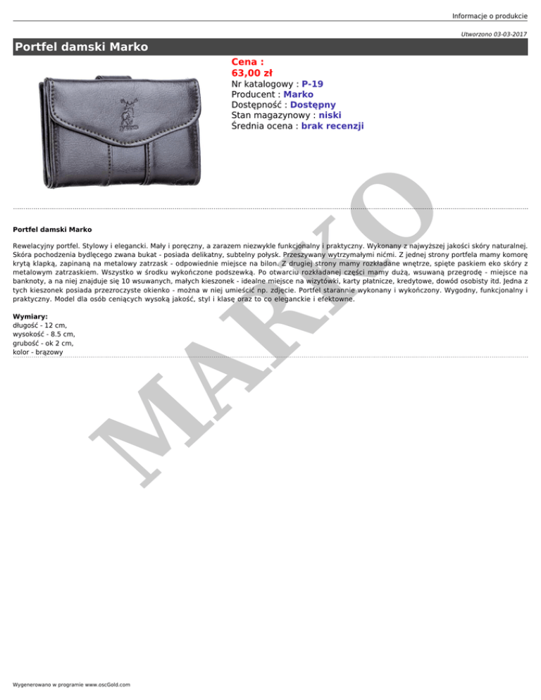 Informacje o produkcie Utworzono 03-03-2017 Portfel damski Marko Cena : 63,00 zł K O Nr katalogowy : P-19 Producent : Marko Dostępność : Dostępny Stan magazynowy : niski Średnia ocena : brak recenzji Portfel damski Marko M Wymiary: długość - 12 cm, wysokość - 8.5 cm, grubość - ok 2 cm, kolor - brązowy AR Rewelacyjny portfel. Stylowy i elegancki. Mały i poręczny, a zarazem niezwykle funkcjonalny i praktyczny. Wykonany z najwyższej jakości skóry naturalnej. Skóra pochodzenia bydlęcego zwana bukat - posiada delikatny, subtelny połysk. Przeszywany wytrzymałymi nićmi. Z jednej strony portfela mamy komorę krytą klapką, zapinaną na metalowy zatrzask - odpowiednie miejsce na bilon. Z drugiej strony mamy rozkładane wnętrze, spięte paskiem eko skóry z metalowym zatrzaskiem. Wszystko w środku wykończone podszewką. Po otwarciu rozkładanej części mamy dużą, wsuwaną przegrodę - miejsce na banknoty, a na niej znajduje się 10 wsuwanych, małych kieszonek - idealne miejsce na wizytówki, karty płatnicze, kredytowe, dowód osobisty itd. Jedna z tych kieszonek posiada przezroczyste okienko - można w niej umieścić np. zdjęcie. Portfel starannie wykonany i wykończony. Wygodny, funkcjonalny i praktyczny. Model dla osób ceniących wysoką jakość, styl i klasę oraz to co eleganckie i efektowne. Wygenerowano w programie www.oscGold.com