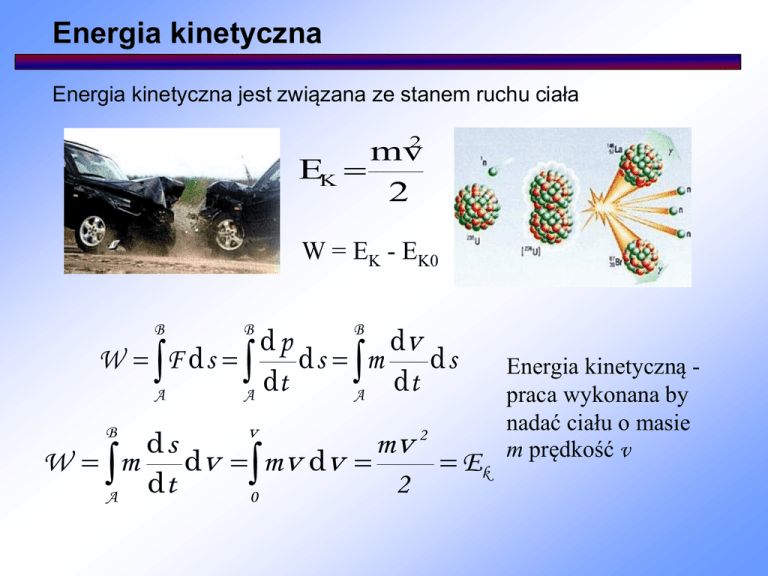 Energia kinetyczna Energia kinetyczna jest związana ze stanem ruchu ciała mv2 EK 2 W = EK - EK0 dp dv W F d s d s m ds dt dt A A A B B v B ds mv 2 W m dv m v dv Ek dt 2 A 0 B Energia kinetyczną praca wykonana by nadać ciału o masie m prędkość v Energia kinetyczna Energia kinetyczna jest związana ze stanem ruchu ciała mv2 EK 2 W = EK - EK0 Energia kinetyczna Zasady zachowania: energia mechaniczna EP(r)+EK(v)=0 E k E p const. W układzie zachowawczym odosobnionym całkowita energia mechaniczna, czyli suma energii potencjalnej, Ep, zarówno grawitacyjnej jak i sprężystości, oraz energii kinetycznej, Ek, ciała jest wielkością stałą. Zasady zachowania: energia mechaniczna Ecałałkowit a const. Zasady zachowania: energia mechaniczna mv mgh 2 2 Zasady zachowania: energia mechaniczna
