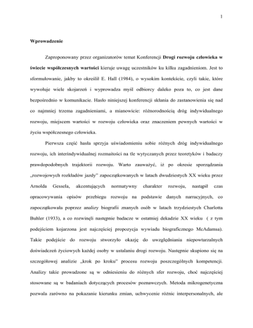 1 Wprowadzenie Zaproponowany przez organizatorów temat Konferencji Drogi rozwoju człowieka w świecie współczesnych wartości kieruje uwagę uczestników ku kilku zagadnieniom. Jest to sformułowanie, jakby to określił E. Hall (1984), o wysokim kontekście, czyli takie, które wywołuje wiele skojarzeń i wyprowadza myśl odbiorcy daleko poza to, co jest dane bezpośrednio w komunikacie. Hasło niniejszej konferencji skłania do zastanowienia się nad co najmniej trzema zagadnieniami, a mianowicie: różnorodnością dróg indywidualnego rozwoju, miejscem wartości w rozwoju człowieka oraz znaczeniem pewnych wartości w życiu współczesnego człowieka. Pierwsza część hasła sprzyja uświadomieniu sobie różnych dróg indywidualnego rozwoju, ich interindywidualnej rozmaitości na tle wytyczanych przez teoretyków i badaczy prawdopodobnych trajektorii rozwoju. Warto zauważyć, iż po okresie sporządzania „rozwojowych rozkładów jazdy” zapoczątkowanych w latach dwudziestych XX wieku przez Arnolda Gessela, akcentujących normatywny charakter rozwoju, nastąpił czas opracowywania opisów przebiegu rozwoju na podstawie danych narracyjnych, co zapoczątkowała poprzez analizy biografii znanych osób w latach trzydziestych Charlotta Buhler (1933), a co rozwinęli następnie badacze w ostatniej dekadzie XX wieku ( z tym podejściem kojarzona jest najczęściej propozycja wywiadu biograficznego McAdamsa). Takie podejście do rozwoju stworzyło okazję do uwzględniania niepowtarzalnych doświadczeń życiowych każdej osoby w ustalaniu drogi rozwoju. Następnie skupiono się na szczegółowej analizie „krok po kroku” procesu rozwoju poszczególnych kompetencji. Analizy takie prowadzone są w odniesieniu do różnych sfer rozwoju, choć najczęściej stosowane są w badaniach dotyczących procesów poznawczych. Metoda mikrogenetyczna pozwala zarówno na pokazanie kierunku zmian, uchwycenie różnic interpersonalnych, ale 2 przede wszystkim służy odkryciu indywidualnej drogi postępów rozwojowych, poznaniu stosowanych przez każdą osobę, właściwych jej strategii postępowania. Próby wykorzystania takiego analitycznego podejścia w badaniach nad rozwojem stosowane są także przez polskich badaczy, a rezultaty takiego podejścia będziemy mogli poznać na tej konferencji. Można powiedzieć, iż w sposobie podejścia do badania zmian rozwojowych ujawnia coraz wyraźniej zaznaczający się analityczny i eksplikacyjny charakter prowadzonych badań rozwojowych, przy zachowaniu ich idiograficzności. Po drugie, hasło konferencji prowadzi nasze myśli ku zagadnieniom aksjologicznym. W badaniach nad rozwojem człowieka system wartości stanowi zarówno przedmiot badania (w tym zakresie dokonują się wyraźne zmiany w toku życia, zwłaszcza w okresie wchodzenia w dorosłość), jak i czynnik wywołujący zmiany rozwojowe w wielu sferach: poznawczej, emocjonalnej, społecznej, osobowości. Skłonni jesteśmy widzieć powiązania sfery wartości, rozwoju moralnego z innymi sferami rozwoju, na co zwracał J. Piaget, pokazując związek moralnego rozwoju ze sferą poznawczą. Badania psychologiczne starają się pokazać, co jest cenne, godne pożądania, wyboru dla osób znajdujących się w różnych momentach życia; czy preferowane wartości są czynnikiem różnicującym grupy wieku, płci, role rodzinne, zawodowe; czy system wartości przyjęty w środowisku, w którym żyje dana osoba ma znaczenie dla jej rozwoju. Niektórzy ludzie kierują się przy podejmowaniu decyzji wartościami, uważając je za obiektywne, a więc niezależne od punktu widzenia, a raczej uwarunkowane naturą ludzką, związane z Bogiem czy jakimś autorytetem. Inni uważają, że wartości mają subiektywny charakter, nie podlegają racjonalnej dyskusji i są zależne od subiektywnego stanowiska każdego człowieka. Psychologiczne badania nad światem wartości mają interdyscyplinarny charakter, włączając rozważania na ten temat prowadzone przez filozofów, socjologów czy pedagogów. 3 Po trzecie, hasło Konferencji skłania do zastanowienia się, czy w świecie XXI wieku, w epoce ponowoczesności i globalizmu mówienie o wartościach ma jakiś sens? W kontekście dokonujących się przemian cywilizacyjnych pewne wartości. zasługują na szczególne wyróżnienie. Zwróćmy uwagę na dwie wartości, a mianowicie: samotność i jej dopełnienie – braterstwo oraz tolerancję. Samotność, zdaniem J. Attali (2002), jest dla współczesnego człowieka luksusem. Człowiek XXI wieku to koczownik przemieszczający się z miejsca na miejsce z powodu luksusu lub nędzy. Właśnie dla osób, które wiodą życie koczownika z luksusu samotność jest luksusową wartością. Osiąganie tej wartości nie jest to łatwe, bowiem życie koczownika polega na pozostawaniu w ciągłej łączności z innymi członkami plemienia: ma być otwarty, gościnny, braterski, gotowy do podzielania terenu (w szerokim rozumieniu tego słowa) z innymi. Każdy koczownik dąży do zapewnienia sobie samotności. W efekcie coraz wyraźniej zarysowuje się obraz świata, w którym mamy do czynienia z „sąsiadującymi samotnościami”. Z jednej strony człowiek współczesny „narażony” na ciągłe kontakty z członkami szeroko pojętego plemienia potrzebuje samotności, a z drugiej coraz bardziej potrzebuje braterstwa, by przeżyć w wywołującym coraz większe poczucie zagrożenia w świecie. J. Attali przewiduje, że w XXI wieku w połowie przypadków zgonu nikt nie pójdzie w kondukcie pogrzebowym zmarłej osoby. Wartością cenną staje się zatem braterstwo wyrażające się w uznaniu, że innej osobie nie można narzucać tego, czego samemu się nie chce. Braterstwo jest wyrazem solidarności, uczuciowych więzi spajających jednostki. Ujawnia się szczególnie wyraźnie w sytuacjach zagrożenia ludzkiego bytu, wypływa z zatroskania losem bliźniego, wyraża się w gotowości do oferowania i udzielania pomo