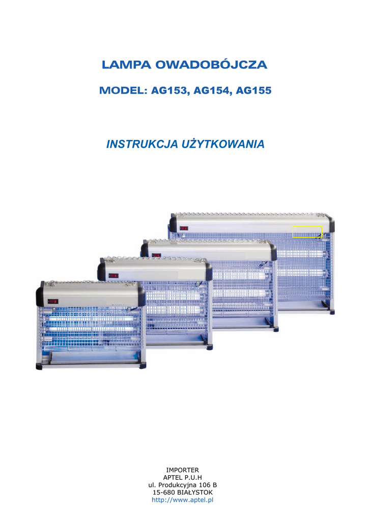 LAMPA OWADOBÓJCZA MODEL: AG153, AG154, AG155 INSTRUKCJA UŻYTKOWANIA IMPORTER APTEL P.U.H ul. Produkcyjna 106 B 15-680 BIAŁYSTOK http://www.aptel.pl E0003390WZ UWAGA: Przed pierwszym użyciem urządzenia należy dokładnie zapoznać się z instrukcją obsługi. Instrukcję należy przechowywać w bezpiecznym oraz dostępnym dla personelu miejscu. Producent zastrzega sobie prawo do zmiany parametrów technicznych urządzeń bez zapowiedzi. Zdjęcia, rysunki oraz opisy urządzeń mają charakter poglądowy. 1. PRZEPISY BEZPIECZEŃSTWA •• Nieprawidłowa obsługa i niewłaściwe użytkowanie może spowodować poważne uszkodzenie urządzenia lub zranienie osób. •• Urządzenie może być stosowane wyłącznie w celu, do którego zostało zaprojektowane. Producent nie ponosi żadnej odpowiedzialności za szkody spowodowane nieprawidłową obsługą i niewłaściwym użytkowaniem urządzenia. •• W czasie użytkowania zabezpiecz urządzenie i wtyczkę kabla zasilającego przed kontaktem z wodą lub innymi płynami. W przypadku, gdyby przez nieuwagę urządzenie wpadło do wody, należy natychmiast wyciągnąć wtyczkę z kontaktu, a następnie zlecić kontrolę urządzenia specjaliście. Nieprzestrzeganie tej instrukcji może spowodować zagrożenie życia. •• Nigdy nie otwieraj samodzielnie obudowy urządzenia. •• Nie wtykaj żadnych przedmiotów w obudowę urządzenia. •• Nie dotykaj wtyczki kabla zasilającego wilgotnymi rękami. •• Regularnie kontroluj stan wtyczki i kabla. W przypadku wykrycia uszkodzenia wtyczki lub kabla, zleć naprawę w wyspecjalizowanym punkcie naprawczym. •• W przypadku, gdy urządzenie spadnie lub ulegnie uszkodzeniu w inny sposób, przed dalszym użytkowaniem zawsze zleć przeprowadzenie kontroli i ewentualną naprawę w wyspecjalizowanym punkcie naprawczym. •• Nigdy nie naprawiaj urządzenia samodzielnie - może to spowodować zagrożenie życia. •• Chroń kabel zasilający przed kontaktem z ostrymi lub gorącymi przedmiotami i chroń go z dala od otwartego ognia. Jeżeli chcesz odłączyć urządzenie z kontaktu, zawsze chwytaj za wtyczkę, nigdy nie ciągnij za kabel. •• Zabezpiecz kabel (lub przedłużacz), aby nikt przez omyłkę nie wyciągnął go z kontaktu lub aby się o niego nie potknął. •• Lampa owadobójcza wykorzystując zakres promieniowania ultrafioletowego wabi owady latające. Przyciągane owady takie jak muchy, ćmy, komary i inne owady latające są rażone prądem przez naładowaną elektrycznie metalową siatkę. •• Kontroluj funkcjonowanie urządzenia w czasie użytkowania. •• Dzieci nie uświadamiają sobie zagrożeń, jakie może spowodować użytkowanie urządzeń elektrycznych. Nigdy nie pozwalaj dzieciom posługiwać się elektrycznymi urządzeniami gospodarstwa domowego bez nadzoru. •• Jeżeli urządzenie nie jest w danej chwili użytkowane lub jest właśnie czyszczone, zawsze odłącz je od źródła zasilania, wyciągając wtyczkę z kontaktu. •• Uwaga niebezpieczeństwo! Jeżeli wtyczka kabla zasilającego jest podłączona do kontaktu, urządzenie cały czas pozostaje pod napięciem. •• Wyłącz urządzenie, zanim wyciągniesz wtyczkę z kontaktu. •• Nigdy nie ciągnij urządzenia za kabel zasilający. 2. OSTRZEŻENIA •• •• •• •• •• •• •• •• Nie stosuj żadnych dodatkowych środków oprócz tych, które zostały dostarczone wraz z urządzeniem. Nigdy nie ustawiaj urządzenia w pobliżu źródeł ciepła (np. kuchenki lub pieca). Wysokie napięcie! Należy wyłączyć urządzenie z zasilania przed naprawą lub czyszczeniem. Podczas pracy urządzenia nie wolno wkładać w siatkę metalowych przedmiotów. Trzymać z dala od przedmiotów łatwopalnych. Należy sprawdzić lokalne napięcie przed uruchomieniem. Powiesić lub umieścić w miejscu niedostępnym dla dzieci. W przypadku zniszczenia, przewód zasilający musi być naprawiony lub wymieniony przez specjalistę w serwisie. — 2 — • Lampa owadobójcza nie może być użyta w garażu, stajni lub w podobnych miejscach w których wilgotność powietrza przekracza 60%. • Należy często czyścić zasobnik z owadami 3. BUDOWA Lampa owadobójcza wykorzystuje zakres promieniowania ultrafioletowego, którego fale jak dowiedziono są najskuteczniejszym wabikiem na owady latające. Przyciągane owady takie jak muchy, ćmy, komary i inne owady latające są rażone prądem przez naładowaną elektrycznie metalową siatkę. UWAGA!! Wytwarzane napięcie na siatce elektrycznej równa się 1800 VOLT W urządzeniu nie zastosowano środków chemicznych, ponadto nie wydziela ono zapachów, nie wymaga sterylizacji, nie brudzi. Urządzenie nie stanowi zagrożenia dla środowiska, a także jest bezpieczne dla ludzi i zwierząt. Znajduje idealne zastosowanie w domu, fabrykach, sklepach spożywczych, sklepach mięsnych, szpitalach i innych pomieszczeniach. 4. OPTYMALNE MIEJSCE MONTAŻU • • • • • Nie bezpośrednio przy oknach lub drzwiach, z uwagi na przeciąg oraz światło dzienne. W miejscu obróbki lub podawania żywności. W pobliżu miejsca, przez które wlatują owady, jednak nie w przeciągu lub na wiatrze. W miejscu, w którym urządzenie może być włączone 24 godziny na dobę. Wyłącznie w pomieszczeniach; urządzenie nie jest przeznaczone do użytku na zewnątrz (urządzenie nie jest wodoodporne). • Powyżej wysokości oczu i tak, aby uniknąć uderzeń. • Z dala od łatwopalnych przedmiotów, takich jak zasłony, firanki itd. 5. CZYSZCZENIE • Przed czyszczeniem zawsze wyciągnąć wtyczkę z gniazdka! • W przypadku intensywnego korzystania z urządzenia pamiętać o regularnym usuwaniu owadów z metalowej siatki i usuwaniu owadów z rynienki. • Urządzenie czyścić suchym pędzelkiem lub szczotką. • Uważać, aby elementy elektryczne urządzenia nie wchodziły w kontakt z wodą. 6. DANE TECHNICZNE Model Napięcie Częstotliwość Moc Zasięg działani