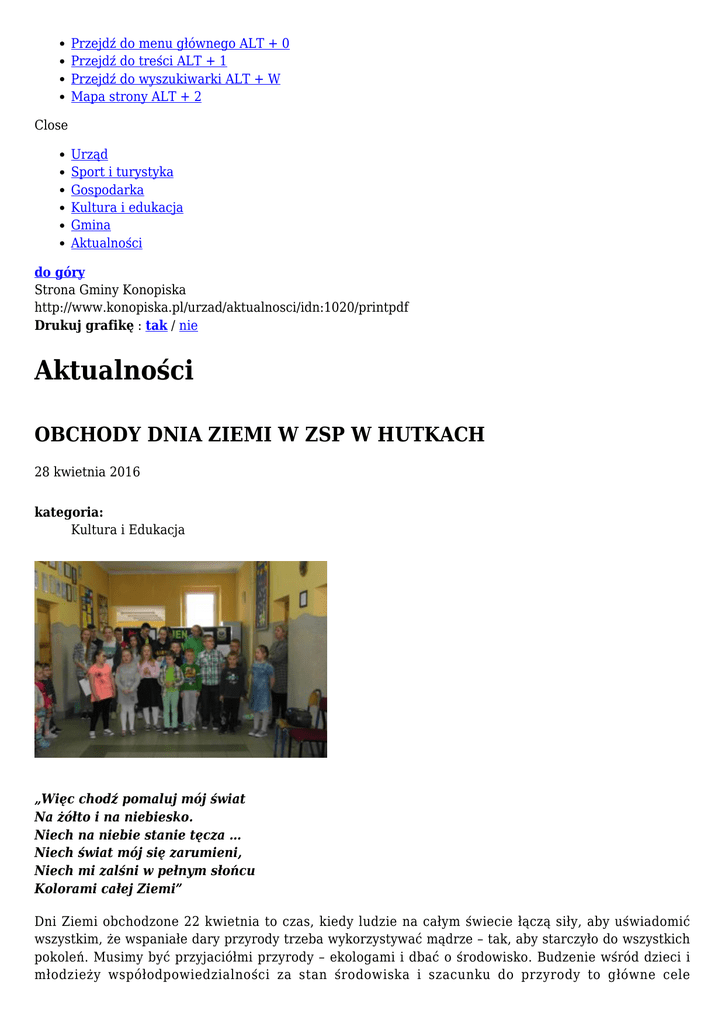 Przejdź do menu głównego ALT + 0 Przejdź do treści ALT + 1 Przejdź do wyszukiwarki ALT + W Mapa strony ALT + 2 Close Urząd Sport i turystyka Gospodarka Kultura i edukacja Gmina Aktualności do góry Strona Gminy Konopiska http://www.konopiska.pl/urzad/aktualnosci/idn:1020/printpdf Drukuj grafikę : tak / nie Aktualności OBCHODY DNIA ZIEMI W ZSP W HUTKACH 28 kwietnia 2016 kategoria: Kultura i Edukacja „Więc chodź pomaluj mój świat Na żółto i na niebiesko. Niech na niebie stanie tęcza … Niech świat mój się zarumieni, Niech mi zalśni w pełnym słońcu Kolorami całej Ziemi” Dni Ziemi obchodzone 22 kwietnia to czas, kiedy ludzie na całym świecie łączą siły, aby uświadomić wszystkim, że wspaniałe dary przyrody trzeba wykorzystywać mądrze – tak, aby starczyło do wszystkich pokoleń. Musimy być przyjaciółmi przyrody – ekologami i dbać o środowisko. Budzenie wśród dzieci i młodzieży współodpowiedzialności za stan środowiska i szacunku do przyrody to główne cele tegorocznych obchodów Dnia Ziemi w naszej szkole, które odbyły się 27 kwietnia 2016r. Uczniowie II klasy gimnazjum i II klasy szkoły podstawowej pod kierunkiem Pań Wioletty Warwas i Krystyny Badory zwrócili uwagę , że każdy wykorzystany dziś przedmiot za jakiś czas może stać się bezużyteczny i będziemy musieli go wyrzucić. Tylko selektywna zbiórka odpadów, czyli ich sortowanie na papier, szkło, metale, plastik oraz ich przerób pozwoli oszczędzać surowce takie jak: woda, energia, rudy, drewno czy piasek. Segregacja zmniejsza też ilość odpadów na wysypisku, co wydłuża czas eksploatacji oraz zmniejsza koszty utrzymania i zabezpieczenia. W trakcie występu usłyszeliśmy piosenkę , której treść należy dać każdemu pod rozwagę: „ Co się dzieje, co się dzieje , wszystko zaśmiecone. Nic nie widać, nic nie widać miasta zadymione. Co z tym zrobić, co z tym zrobić Bierzmy się do pracy I zadbajmy o tę Polskę Proszę was rodacy. Ref. Bo my jesteśmy pokolenie nowe na ekologię już postawić czas, nie pozwolimy nas zaśmiecać, ani zadymiać naszych pięknych miast. Uczniowie II klasy szkoły podstawowej zwrócili uwagę na to, że: 35 plastikowych butelek wystarczy, aby wyprodukować bluzę z polaru. przetopiona szklana butelka pozwala na oszczędzenie energii, która wystarcza do oświetlenia pokoju przez 4 godziny, stos makulatury , który ma wysokość siedmioletniego dziecka pozwala uratować sześciometrowe drzewo, dzięki przetopieniu jednej aluminiowej puszki oszczędzamy energię potrzebną do zasilenia telewizora przez 3 godziny. Na zakończenie wszyscy zostali zaproszeni na wystawę prac uczniów II klasy szkoły podstawowej , które powstały z wtórnego wykorzystania opakowań. powrót do listy aktualności
