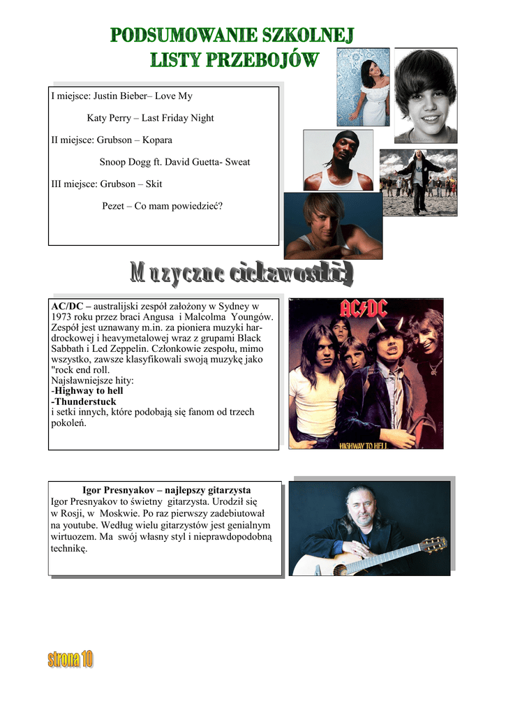 I miejsce: Justin Bieber– Love My Katy Perry – Last Friday Night II miejsce: Grubson – Kopara Snoop Dogg ft. David Guetta- Sweat III miejsce: Grubson – Skit Pezet – Co mam powiedzieć? AC/DC – australijski zespół założony w Sydney w 1973 roku przez braci Angusa i Malcolma Youngów. Zespół jest uznawany m.in. za pioniera muzyki hardrockowej i heavymetalowej wraz z grupami Black Sabbath i Led Zeppelin. Członkowie zespołu, mimo wszystko, zawsze klasyfikowali swoją muzykę jako "rock end roll. Najsławniejsze hity: -Highway to hell -Thunderstuck i setki innych, które podobają się fanom od trzech pokoleń. Igor Presnyakov – najlepszy gitarzysta Igor Presnyakov to świetny gitarzysta. Urodził się w Rosji, w Moskwie. Po raz pierwszy zadebiutował na youtube. Według wielu gitarzystów jest genialnym wirtuozem. Ma swój własny styl i nieprawdopodobną technikę.