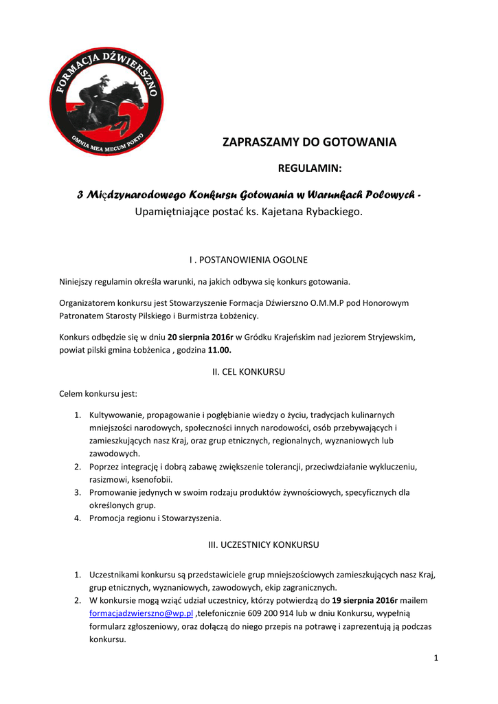 ZAPRASZAMY DO GOTOWANIA REGULAMIN: 3 Międzynarodowego Konkursu Gotowania w Warunkach Polowych Upamiętniające postad ks. Kajetana Rybackiego. I . POSTANOWIENIA OGOLNE Niniejszy regulamin określa warunki, na jakich odbywa się konkurs gotowania. Organizatorem konkursu jest Stowarzyszenie Formacja Dźwierszno O.M.M.P pod Honorowym Patronatem Starosty Pilskiego i Burmistrza Łobżenicy. Konkurs odbędzie się w dniu 20 sierpnia 2016r w Gródku Krajeoskim nad jeziorem Stryjewskim, powiat pilski gmina Łobżenica , godzina 11.00. II. CEL KONKURSU Celem konkursu jest: 1. Kultywowanie, propagowanie i pogłębianie wiedzy o życiu, tradycjach kulinarnych mniejszości narodowych, społeczności innych narodowości, osób przebywających i zamieszkujących nasz Kraj, oraz grup etnicznych, regionalnych, wyznaniowych lub zawodowych. 2. Poprzez integrację i dobrą zabawę zwiększenie tolerancji, przeciwdziałanie wykluczeniu, rasizmowi, ksenofobii. 3. Promowanie jedynych w swoim rodzaju produktów żywnościowych, specyficznych dla określonych grup. 4. Promocja regionu i Stowarzyszenia. III. UCZESTNICY KONKURSU 1. Uczestnikami konkursu są przedstawiciele grup mniejszościowych zamieszkujących nasz Kraj, grup etnicznych, wyznaniowych, zawodowych, ekip zagranicznych. 2. W konkursie mogą wziąd udział uczestnicy, którzy potwierdzą do 19 sierpnia 2016r mailem [email protected] ,telefonicznie 609 200 914 lub w dniu Konkursu, wypełnią formularz zgłoszeniowy, oraz dołączą do niego przepis na potrawę i zaprezentują ją podczas konkursu. 1 3. W konkursie mogą wziąd udział max 3 osobowe reprezentacje, dowolna ilośd dopingujących. 4. Uczestnik konkursu zobowiązany jest do przygotowania, zaprezentowania i podania ocenie jury potrawy wraz z przepisem podczas trwania konkursu. IV. PRZEDMIOT KONKURSU Przedmiotem konkursu jest potrawa ugotowana w warunkach polowych. V. PRZEBIEG KONKURSU Konkurs przebiegad będzie w dwóch etapach II etap to gotowanie potrawy i jej prezentacja 1. I etap to zapis, wypełnienie formularza, przygotowanie na piśmie przepisu potrawy. 2. Przygotowanie materiałów do utworzenia stoiska ( flaga, strój, akcesoria kuchenne) 3. II etap to gotowanie potrawy i jej prezentacja. VI. REGULY PRZEPROWADZENIA KONKURSU 1. Każde stanowisko konkursowe wyposażone zostanie przez organizatora w cegły do utworzenia paleniska, kamienie , drewno, woda, stolik, krzesło. 2. Każda z ekip zabezpiecza we własnym zakresie produkty do przygotowania potrawy, drobny sprzęt kuchenny do wykonania dao konkursowych, deski, miski, noże, zastawę potrzebną do podania potrawy. 3. Gotowanie potrawy rozpoczyna się o godz. 11.oo 4. Czas przeznaczony na gotowanie to 130 min Ekipy przygotowują 6 porcji -5 do oceny jury, 1 na stół prezentacyjny. Pozostałe porcje zostaną wydane publiczności do degustacji 5. Komisja konkursowa oceni potrawę każdej z ekip do godz. 14.oo 6. Wszystkie stanowiska zostaną ustawione na polu, przed publicznością zaproszoną na konkurs w celu zaprezentowania pełnego kunsztu przedstawicieli poszczególnych grup i lepszej integracji. Dlatego też każda ekipa powinna zadbad o efektowne zaprezentowanie się zarówno, jeśli chodzi o wygląd kucharzących, jak i stanowiska, które punktowane będzie przez jury od 1-5 pkt. Natomiast danie konkursowe od 1-10 pkt. VII .POSTANOWIENIA KOOCOWE 1. Komisja konkursowa wyłoni zwycięzcę, (z najwyższą ilością punktów) któremu zostanie 2. 3. 4. 5. przyznany Puchar Starosty oraz Talon na pieczone prosię (80 posiłków) z dowozem we wskazane miejsce w Polsce, oraz dla pozostałych 2 drużyn nagrody rzeczowe. Dla wszystkich uczestników przewidziane są drobne upominki i dyplomy za udział. Decyzje komisji są wiążące i ostateczne. Komisja konkursowa zostanie powołana przez organizatorów konkursu. Organizatorzy nie zwracają kosztów podróży oraz kosztów produktów potrzebnych do wykonania dao konkursowych. 2