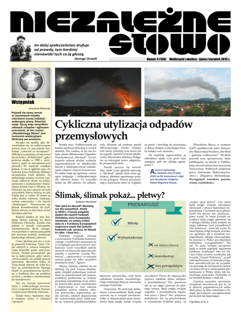 Im dalej społeczeństwo dryfuje od prawdy, tym bardziej nienawidzi tych co ją głoszą. George Orwell Numer 3 (109) Wałbrzych i okolice: Lipiec/sierpień 2015 r. Wstępniak Jerzy Jacek Pilchowski Pojawił się nowy temat w rozmowach między członkami naszej redakcji: wakacyjne plany. Również moje. Życzę więc wszystkim udanych urlopów i ogłaszam uroczyście, że ten numer „Niezależnego Słowa” jest numerem wakacyjnym. Wrócimy we wrześniu. Szczęka mi opadła, gdy dowiedziałem się, że wałbrzyszanie mówią teraz na prezydenta Szełemeja „człowiek ze styropianu”. (Młodym wyjaśniam, że tak mówi się na ludzi z „Solidarności”, gdyż podczas strajku w 1980 r. stoczniowcy spali na styropianowych płytach.) Po namyśle uznałem jednak, że ma to głęboki sens. Za kadencji pana Szełemeja oklejono styropianem wiele domów. Ta technologia ociepla, wycisza i pozwala malować domy na kolory sprzeczne z marksizmem i leninizmem. Jestem więc w 100 proc. za. Odcinam się tym samym od tych wszystkich, którzy mówią, że cała Polska jest w ruinie. W ruinie są tylko służba zdrowia, edukacja, system emerytalny i sto innych „drobiazgów”. Przyszywam się jednak konsekwentnie do tych, którzy mówią, że zbyt dużo za ten styropian płacimy. Krążyła plotka, że pan Szełemej będzie jedynką na liście Platformy Obciachu. Została ona jednak w sposób wiarygodny zdementowana. Bycie szeregowym posłem w opozycyjnej partii jest bowiem poniżej oczekiwań niedoszłego ministra zdrowia. Coraz głośniej jest też o tym, że panowie Szełemej, Tutaj i Orpel założyli w ratuszu konspiracyjną komórkę partii antysystemowej. Trudno przewidzieć, jak się to dalej potoczy, gdyż taśmy z tych rozmów nie zostały jeszcze ujawnione. Słyszałem tylko, że Tutaj chciał dotrzeć do ucha Kukiza za pośrednictwem Stonogi, Orpel za pośrednictwem Korwina, a Szełemej chce się podobno zwrócić z prośbą o rekomendacje do narodowców. Tak czy inaczej, nerwowość ludzi z wałbrzyskiego towarzystwa wzajemnej adoracji finansowej jest coraz bardziej widoczna. Dzięki temu, będziemy mieli mniejsze straty w ludziach i sprzęcie! Cykliczna utylizacja odpadów przemysłowych Środek nocy. Wałbrzyszanie po bardzo upalnym dniu śpią w swoich domach. Nie wiedzą, że po raz kolejny płonie Składowisko Odpadów Przemysłowych „Mo-bruk”. Co kilkanaście sekund słychać wybuchy nagromadzonych na składowisku beczek z niebezpiecznymi substancjami, olejami i innymi świństwami. Po niebie snuje się ogromny, czarny ogon trującego i niebezpiecznego dla zdrowia dymu. To wszystko dzieje się 300 metrów od zabudo- wań, kilometr od centrum ponad 100-tysięcznego miasta. Kolejny wóz straży pożarnej, tym razem już na sygnale, wjeżdża na teren składowiska. Mieszkańcy dzielnicy Podgórze są ostrzegani przez megafony, by pozamykali okna. Powoli zaczyna się rozwidniać, ptaki coraz głośniej śpiewają, a „Mo-bruk” płonie, dym coraz gęściejszy, płomień ogromnego pożaru nie przygasa. Znowu przypominają o zamykaniu okien ze względu na pożar i nawołują do pozostaniu w domu. Kolejne wybuchające beczki, kolejny wóz strażacki... Na niedzielę zapowiadane są rekordowe upały. Czy grozi nam następny, jeśli ten zdołają ugasić, pożar ? A utorem napisanego w niedzielę rano (5 lipiec 2015) na FB, komentarza i zdjęć jest mieszkaniec Podgórza Robert Bogusław Nowak. Ślimak, ślimak pokaż... płetwy? Radosław Mechliński Taki tytuł to absurd? Niestety, nie dla wszystkich. Kiedy w 2010 r. Francja zażądała dopłat do swoich hodowli ślimaków, Unia Europejska wiedziała, co należy zrobić. Jako że z Funduszy Europejskich wspierana może być jedynie hodowla ryb, uznano, że ślimak to ryba. I kasa leci... Podobnie wygląda sytuacja z orzeczeniem Trybunału Konstytucyjnego o możliwości zrzeszania się w związkach zawodowych tzw. prekariuszy. Czyli wszystkich zatrudnionych na umowach śmieciowych. Zapiała z zachwytu „Gazeta Wyborcza”: „»pracownicy« to znacznie szersza grupa niż tylko szczęśliwi posiadacze etatu”. Zgroza. Muszę, niestety, odnieść się do definicji. Za prof. Guyem Standingiem (Anglia) prekariusze (zatrudnieni na śmieciówkach lub samozatrudnieni) pozbawieni są siedmiu gwarancji zatrudnienia, m.in: ochrony pracownika przed zwolnieniem i stosowaniem w tym zakresie przepisów prawa, ochrony zdrowia pracownika, zapewnienia nauki zawodu, szkoleń, dopasowanej do wykonywanej pracy stałej pensji czy wreszcie przedstawicielstwa interesów pracownika, czyli bycia członkiem związku zawodowego. I tego ostatniego dotyczy orzeczenie naszego Trybunału. Orzeczenie TK zrównuje prekariuszy z pracownikami. Będą mogli zrzeszać się w związki zawodowe. Tylko w obronie jakich praw prekariuszy będą mogły stanąć związki zawodowe? Prawa do odpoczynku poprzez ustalenie planu urlopów z przedsiębiorcą? Nie, ponieważ nie są oni objęci prawem do płatnego urlopu. Będą mogły związki uzgodnić z przedsiębiorcą regulamin pracy i płacy? Nie, ponieważ prekariusze nie są pracownikami w rozumieniu Kodeksu pracy, są [Niezależne Słowo, w numerze 1(107) opublikowało tekst Aleksandry Makowskiej-Prochera „Mo-Bruk – gehenna wałbrzyszan”. Mo-Bruk przysłał nam sprostowanie, które publikujemy na stronie 6. Publikujemy również pismo stowarzyszenia Nowoczesny Wałbrzych podpisane przez Aleksandrę Makowską-Prochera i Zbigniewa Michurskiego. Wyciągnięcie wniosków pozostawiamy czytelnikom.] „wyjęci spod prawa”. Czy może będą mogły związki zawodowe skorzystać z prawa konsultacji wypowiedzeń i zwolnień dyscyplinarnych? Na pewno nie, ponieważ... patrz wyżej. To może związki zawodowe będą mogły upomnieć się o takiego członka, jeżeli zostanie na niego nałożona kara porządkowa? Nie, ponieważ... znów jak wyżej. To może będzie mógł związek zawodowy upomnieć się o wysokość wynagrodzeni