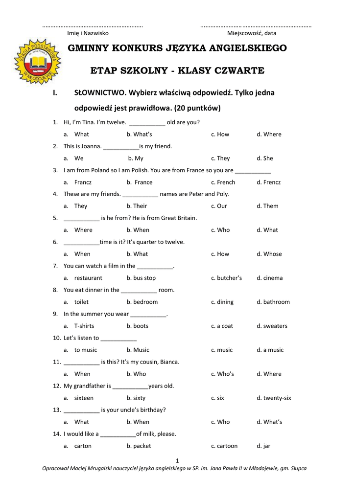 ............................................................. Imię i Nazwisko ................................................................... Miejscowośd, data GMINNY KONKURS JĘZYKA ANGIELSKIEGO ETAP SZKOLNY - KLASY CZWARTE I. SŁOWNICTWO. Wybierz właściwą odpowiedź. Tylko jedna odpowiedź jest prawidłowa. (20 puntków) 1. Hi, I’m Tina. I’m twelve. ___________ old are you? a. What b. What’s c. How d. Where c. They d. She 2. This is Joanna. ___________is my friend. a. We b. My 3. I am from Poland so I am Polish. You are from France so you are ___________ a. Francz b. France c. French d. Frencz 4. These are my friends. ___________ names are Peter and Poly. a. They b. Their c. Our d. Them c. Who d. What c. How d. Whose c. butcher’s d. cinema c. dining d. bathroom c. a coat d. sweaters c. music d. a music c. Who’s d. Where c. six d. twenty-six c. Who d. What’s c. cartoon d. jar 5. ___________ is he from? He is from Great Britain. a. Where b. When 6. ___________time is it? It’s quarter to twelve. a. When b. What 7. You can watch a film in the ___________. a. restaurant b. bus stop 8. You eat dinner in the ___________ room. a. toilet b. bedroom 9. In the summer you wear ___________. a. T-shirts b. boots 10. Let’s listen to ___________ a. to music b. Music 11. ___________ is this? It’s my cousin, Bianca. a. When b. Who 12. My grandfather is ___________years old. a. sixteen b. sixty 13. ___________ is your uncle’s birthday? a. What b. When 14. I would like a ___________of milk, please. a. carton b. packet 1 Opracował Maciej Mrugalski nauczyciel języka angielskiego w SP. im. Jana Pawła II w Młodojewie, gm. Słupca ............................................................. Imię i Nazwisko ................................................................... Miejscowośd, data 15. ___________ is my favourite fruit. a. watermelon b. carrot c. peas d. potato c. cartons d. packets c. niece d. nephew c. forks d. ears c. cooker d. sink c. apple juice d. potato juice 16. There are two ___________ of cola in the fridge. a. can b. bottles 17. Your ___________is your mother’s or father’s sister. b. uncle b. aunt 18. Have you got any ___________ in your schoolbag? a. tables b. notebooks 19. In my bedroom there is a ___________. a. upstairs b. wardrobe 20. My favourite juice is ___________. a. water II. b. cucumber juice GRAMATYKA. Wybierz właściwą odpowiedź. Tylko jedna odpowiedź jest prawidłowa. (20 puntków) 1. In my class there are fourteen ___________. a. child b. childs c. children d. childrens c. be d. are c. can d. musn’t 2. They ___________ my friends. b. am b. is 3. Mum, ___________ I go to the cinema, please? b. can’t b. would 4. These are my friends. ___________ names are Richard and Poly. b. They b. Their c. Our d. Them c. have d. has got c. are d. is c. be d. to be c. it d. them c. doges d. dog 5. She ___________got something for you! It’s a ruler. a. has b. have got 6. He ___________beautiful but his sister is fat. a. has got b. have got 7. There ___________ two hotels in Slupca. a. is b. are 8. Look at Aldona. Look at ___________! a. her b. him 9. This food is not ours. This is the ___________ food. a. dog’s b. dogs 10. Jacek is ___________ the guitar at the moment. 2 Opracował Maciej Mrugalski nauczyciel języka angielskiego w SP. im. Jana Pawła II w Młodojewie, gm. Słupca ............................................................. Imię i Nazwisko a. playing ................................................................... Miejscowośd, data b. plays c. is playing d. is plays c. walk d. walks b. Do c. Would d. Can’t b. These c. Those d. Dat c. always d. an c. drink d. make c. run d. swimming c. goes d. gos c. father ’ d. father’s c. next to d. in c. between d. in 11. We are ___________ in the park. a. walking b. walkking 12. ___________ I wear your sweater, please? a. Can 13. ___________ is my cat. a. This 14. I have got ___________apple. a. ten b. a 15. I would like to ___________ some milk, please. a. eat b. cook 16. I like ___________. What about you? Do you like it? a. play games b. walk 17. I never ___________ to school on Sunday. a. go b. going 18. What colour is your ___________ car? a. father b. fathers 19. I’m sitting ___________ a chair. a. under b. on 20. The clock is ___________the wall. a. under III. b. on CZYTANIE ZE ZROZUMIENIEM. a. Przeczytaj tekst i odpowiedz na pytania w języku angielskim. (5 punktów) Dear Mum and Dad, London is great! We go out every day and we usually eat lunch at a nice restaurant. Bob likes eating fish and I love eating spaghetti! Today, it is raining so we are staying in the hotel. Bob is watching TV and I am listening to music. See you soon, James 3 Opracował Maciej Mrugalski nauczyciel języka angielskiego w SP. im. Jana Pawła II w Młodojewie, gm. Słupca ............................................................. Imię i Nazwisko ................................................................... Miejscowośd, data 1. Where’s James? _______________________________________ 2. Where do they usually eat lunch? _______________________________________ 3. What does Bob like eating? _______________________________________ 4. What does James like eating? _______________________________________ 5. What is Bob doing now? _______________________________________ IV. PISANIE. Napisz e-mail do kolegi, którego poznałeś na wakacjach. Przy użyciu czasowników „to be” oraz „have got” napisz kilka zdao na swój temat. Napisz: jak masz na imię; skąd pochodzisz oraz opisz swój wygląd. Nie zapomnij się podpisad. (8 punktów) Hello ………………………………., _________________________________________________________________ _________________________________________________________________ _________________________________________________________________ _________________________________________________________________ _______________________________________________