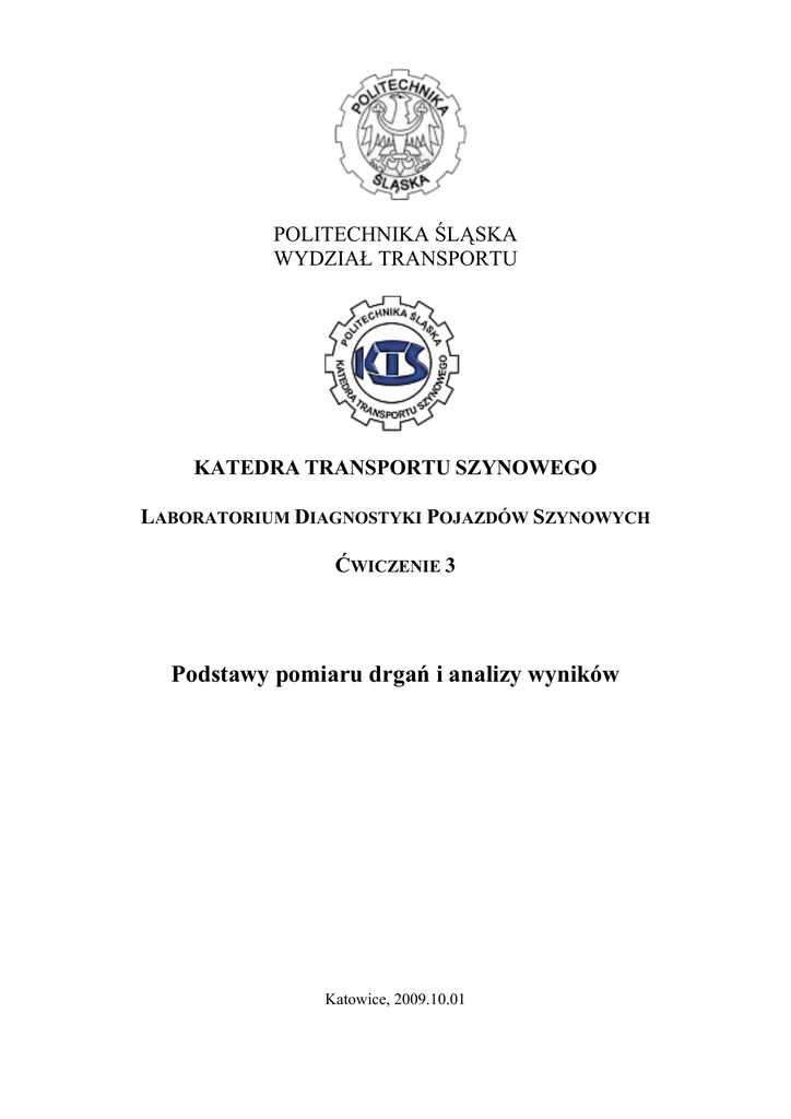 POLITECHNIKA ŚLĄSKA WYDZIAŁ TRANSPORTU KATEDRA TRANSPORTU SZYNOWEGO LABORATORIUM DIAGNOSTYKI POJAZDÓW SZYNOWYCH ĆWICZENIE 3 Podstawy pomiaru drgań i analizy wyników Katowice, 2009.10.01 1. CEL ĆWICZENIA Celem ćwiczenia laboratoryjnego jest zapoznanie studentów z podstawową metodyką przygotowania i prowadzenia pomiarów drgań elementów pojazdów szynowych. Istotnym elementem prowadzonych zajęć jest przedstawienie metod analizy uzyskanych wyników pomiaru drgań. Stanowisko laboratoryjne umożliwia dokonanie pomiaru i rejestracji drgań maszyn i urządzeń w trzech wzajemnie prostopadłych kierunkach. Podstawowym elementem stanowiska jest silnik zasilany prądem stałym o napięciu znamionowym 12 [V]. Zasilanie układu napędowego odbywa się poprzez zasilacz laboratoryjny z regulowanym napięciem od 0 do 30 [V] i regulacji prądu od 0 do 2.5 [A]. Obciążenie silnika na danym stanowisku jest znikome i wynika jedynie z konieczności pokonania momentu bezwładności mas umieszczonych na jego osi i oporu powietrza wirujących elementów. Dlatego też możliwa jest płynna regulacja prędkości obrotowej silnika poprzez regulację napięciem zasilania. Stanowisko to umożliwia zamodelowanie pracy silnika jako niewyważonej maszyny z mechanizmami wirującymi. W tym celu na osi silnika umieszczono dwie wywarzone tarcze. Na osi umieszczono również tarczę z naciętymi rowkami i sprzężono ją z czujnikiem fotorezystancyjnym w celu umożliwienia precyzyjnego pomiaru przemieszczeń kątowych wirnika wraz z tarczami. Schemat stanowiska pomiarowego przedstawiony został na rys. 1. Prowadzący ćwiczenie laboratoryjne prezentuje działanie wyważonego układu w czasie pracy przy różnych prędkościach obrotowych, rejestrując jednocześnie przy pomocy oscyloskopu cyfrowego drgania i przemieszczenie kątowe wirnika. Następnie celowo wprowadza niesymetryczne obciążenie na jednej z wirujących tarcz. Tarczę tą zamyka w obudowie z tworzywa sztucznego uniemożliwiając tym samym wzrokową lokalizację miejsca wyważenia. Zadaniem studentów jest korzystając z możliwości pomiaru drgań w funkcji czasu i przemieszczenia kątowego rejestrowanych na oscyloskopie cyfrowym, wyznaczyć miejsce na drugiej równoległej tarczy, w którym dodanie tej samej masy, spowoduje wyważenie układu. Wyważenie to można potwierdzić poprzez rejestrację drgań na oscyloskopie. Wykonane ćwiczenie laboratoryjne pozwoli zapoznać studentów z możliwościami diagnostyki technicznej opartej o pomiar drgań i możliwości eliminacji jej niekorzystnych skutków. Pozwoli to również przybliżyć studentom teoretyczne i praktyczne informacje w zakresie drgań, wyważania statycznego i dynamicznego maszyn wirujących. 4 3 2 5 5 6 1 8 9 10 RS 232 LPT 7 Rys. 1. Schemat stanowiska pomiarowego: 1 - silnik prądu stałego, 2 – tarcza do zadawania niewyważenia, 3 – tarcza do wyważania, 4 – tarcza czujnika przemieszczeń kątowych, 5 – czujnik drgań względnych ADXL, 6 – czujnik drgań bezwzględnych, 7 – fotorezystancyjny czujnik przemieszczeń kątowych wirnika, 8 – rejestrator drgań MRP, 9 – oscyloskop cyfrowy, 10 – komputer PC 2 2. PODSTAWY TEORETYCZNE ĆWICZENIA Diagnostyka techniczna - dziedzina wiedzy (dział teorii niezawodności), zajmująca się zagadnieniami kontroli stanu złożonych obiektów technicznych i lokalizacji (wykrywania) uszkodzonych elementów tych obiektów złożonych (wg. Encyklopedii Techniki). Diagnostyka techniczna, to technika badawcza pozwalająca na określenie stanu technicznego urządzeń oraz lokalizacji ewentualnych nieprawidłowości dokonywana najczęściej w trakcie pracy urządzenia bez konieczności demontażu jego zespołów. Bazuje ona na wykorzystaniu różnych zjawisk zachodzących w technice (magnetyzm, drgania, hałas, optyka, zmiany pola elektrycznego, zmiany pojemności, zmiany indukcyjności), pomiarze tych wielkości i analizie uzyskanych wyników. Dziedzina ta jest silnie powiązana z teorią pomiaru i analizy uzyskanych wyników. Uzyskane wyniki pozwalają niejednokrotnie, oprócz informacji o stanie technicznym maszyn i urządzeń, na podjęcie automatycznych działań korygujących prawidłowość ich funkcjonowania, a coraz częściej przy wykorzystaniu zaawansowanych technik i metod sztucznej inteligencji. Istnieje kilka ogólnych podziałów diagnostyki technicznej. Pierwszy podział zależy od stanu technicznego eksploatowanych maszyn: - diagnostyka profilaktyczna maszyn, - diagnostyka przedremontowa maszyn , - diagnostyka poremontowa maszyn. Często stosuje się również podział diagnostyki ze względu na rodzaj zjawisk wykorzystywanych do pomiarów, zjawisk mierzonych oraz rodzaju stosowanych czujników. Podział ten wyróżnia diagnostykę: - cieplną, - emisyjną, - rentgenotelewizyjną, - ultradźwiękową, - magnetyczną, - wibroakustyczną, - magnetyczną. Diagnostyka profilaktyczna maszyn wykonywana jest w celu poznania aktualnego stanu technicznego maszyny lub urządzenia i szacowania jego zmian w najbliższym okresie pracy. Posiadana wiedza stanu technicznego maszyn pozwala na bardziej racjonalne ich wykorzystanie, zaplanowanie niezbędnych remontów i postojów na konserwacje a także pozwala zrezygnować z planowych, corocznych i nie zawsze skutecznych remontów czy przeglądów zalecanych przez producenta. Współczesne techniki pomiarowe pozwalają na takie oprzyrządowanie maszyn, które umożliwiają śledzenie ich parametrów w czasie niemal rzeczywistym. Wymaga to jednak podjęcia szeregu przedsięwzięć mających na celu przygotowanie maszyn, kadry pracowniczej zajmującej się eksploatacją, opracowanie instrukcji i procedur. Głównym zadaniem diagnostyki przedremontowej maszyn jest kwalifikacja i weryfikacja zakresu remontu. Zadaniem tej diagnostyki jest określenie stopnia zużycia elementów maszyn, określenie przyczyn pogorszonej ich pracy oraz nadmiernego zużycia. Wiedza ta stanowi podstawę dobr