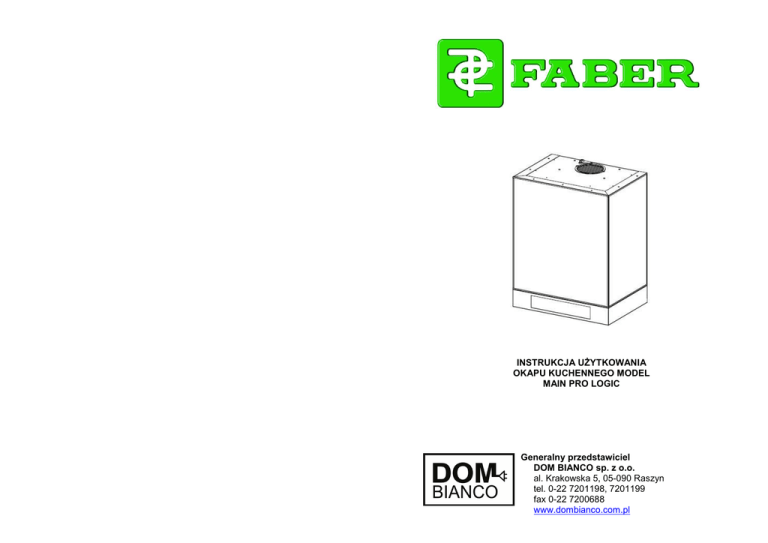 INSTRUKCJA UśYTKOWANIA OKAPU KUCHENNEGO MODEL MAIN PRO LOGIC Generalny przedstawiciel DOM BIANCO sp. z o.o. al. Krakowska 5, 05-090 Raszyn tel. 0-22 7201198, 7201199 fax 0-22 7200688 www.dombianco.com.pl -1- - 16 Spis treści 1. Rady i zalecenia 2. Opis urządzenia 3. Instalacja 4. UŜytkowanie 5. Obsługa bieŜąca 2 4 6 10 12 -2- 1. RADY I ZALECENIA Instrukcja dotyczy kilku wersji urządzenia. W związku z tym moŜna w niej znaleźć fragmenty, które nie mają zastosowania w przypadku konkretnego modelu. Instalacja Producent i Generalny Przedstawiciel nie ponoszą Ŝadnej odpowiedzialności prawnej i/lub materialnej za szkody powstałe w wyniku niewłaściwej instalacji okapu. Minimalna bezpieczna odległość między najwyŜszym punktem płyty grzewczej a dolną powierzchnią okapu wynosi 650 mm (niektóre modele mogą być instalowane niŜej – prosimy zapoznać się z zapisami dotyczącymi wymiarów roboczych i instalacji). NaleŜy sprawdzić, czy parametry prądu w domowej instalacji elektrycznej odpowiadają wartościom podanym na tabliczce znamionowej urządzenia umieszczonej wewnątrz korpusu. Dla urządzeń klasy I naleŜy skontrolować, czy domowa instalacja elektryczna zapewnia odpowiednie uziemienie okapu. Okap w wersji wyciąg naleŜy łączyć z kanałem wentylacyjnym za pomocą rur o minimalnej średnicy 120 mm. Dukt powietrzny powinien być moŜliwie krótki. Nie wolno podłączać okapu do kanałów, którymi są odprowadzane spaliny z innych urządzeń (np. term gazowych i olejowych, kominków itp.). JeŜeli okap jest instalowany w pomieszczeniu, w którym znajdują się urządzenia zasilane energią inna niŜ elektryczna, to naleŜy zapewnić odpowiednie przewietrzanie pomieszczenia w celu zapobiegnięcia nawrotowi spalin. Kuchnia musi być wyposaŜona w otwór ścienny wychodzący na zewnątrz budynku gwarantujący dopływ świeŜego powietrza. UŜytkowanie Okap został zaprojektowany do stosowania wyłącznie w indywidualnych gospodarstwach domowych do eliminowania zapachów powstających w kuchni. - 15 - - 14 - -3Nie wolno uŜywać okapu do celów innych, niŜ te, do których został zaprojektowany. Nie wolno pozostawiać otwartego płomienia pod okapem podczas jego pracy. Wysokość płomienia naleŜy regulować tak, aby nie wychodził on poza obrys dna naczynia. Podczas smaŜenia w głębokim tłuszczu proces gotowania musi być stale nadzorowany, gdyŜ przegrzany tłuszcz moŜe ulec zapaleniu. Nie wolno pod okapem przyrządzać potraw flambowanych („płonących”) – zagroŜenie poŜarem. Okap nie moŜe być obsługiwany przez osoby (łącznie z dziećmi) o ograniczonych moŜliwościach fizycznych, czuciowych oraz psychicznych oraz przez osoby nie mające odpowiedniego doświadczenia o ile nie znajdują się one pod nadzorem lub nie zostały odpowiednio poinstruowane przez osoby odpowiedzialne za ich bezpieczeństwo. NaleŜy uwaŜać, aby dzieci nie bawiły się okapem. Obsługa bieŜąca Przed przystąpieniem do jakichkolwiek prac związanych z obsługą bieŜącą okap naleŜy odłączyć od instalacji elektrycznej. Filtry naleŜy czyścić i/lub wymieniać po upływie czasu podanego w niniejszej instrukcji. Do czyszczenia okapu naleŜy uŜywać wilgotnej szmatki i roztworu neutralnego płynnego detergentu w wodzie. Symbol na wyrobie lub jego opakowaniu oznacza, Ŝe zuŜyte urządzenie nie moŜe być traktowane jako odpad komunalny. NaleŜy je przekazać do odpowiedniej zbiornicy zuŜytego sprzętu elektrycznego i elektronicznego zgodnie z wymaganiami dyrektywy 2002/96 WG (w Polsce ustawa z dnia 19 lipca 2005 r. w sprawie zuŜytego sprzętu elektrycznego i elektronicznego wraz z późniejszymi zmianami i uzupełnieniami). Zapewnienie prawidłowej utylizacji zuŜytego wyrobu pomaga zapobieganiu -4potencjalnego jego negatywnego wpływu na środowisko naturalne oraz zdrowie ludzi. Szczegółowych informacji w tym zakresie udzielają właściwe organy samorządowej i państwowej administracji terytorialnej, zakłady oczyszczania miast i osiedli oraz sprzedawcy. 2. OPIS URZĄDZENIA 2.1. Elementy składowe Poz. 1 Ilość 1 Opis Korpus okapu z oświetleniem, panelem sterowania, zespołem silnikowym, filtrami i dolnym segmentem maskownicy komina Rura z PCW (zainstalowana) Kierownica nawiewu (zainstalowana) Kołnierz redukcyjny Ø 150/120 mm Kołnierz Szklane lub meblowe panele boczne (dostarcza producent mebli) Czołowy panel szklany lub meblowy (dostarcza producent mebli) Uchwyty paneli szklanych 7 1 8 1 9 1 10 11 1 2 12 1 13 2 Poz. 7.1a 7.1b 7.1c 11a 12p Ilość 1 1 1 2 10 Opis Lewy zacisk panelu Środkowy zacisk panelu Prawy zacisk panelu Kołki rozporowe SB 12/10 Śruby M4x10 Poz. Ilość 1 Opis Instrukcja uŜytkowania W przypadku problemów z panelami prosimy o kontakt z dostawcą mebli kuchennych - 13 Wymiana filtrów węglowych Resetowanie alarmu • Wyłączyć silnik i oświetlenie. • Nacisnąć przycisk G na czas 2 s. Wymiana filtrów • Otworzyć panel Comfort. • Zdemontować metalowe filtry przeciw tłuszczowe. • Wyjąć filtry węglowe w sposób pokazany na rysunku obok. • ZałoŜyć nowe filtry. • Zamontować filtry metalowe. 5.5. Oświetlenie Składa się z 20 W lampek halogenowych. Wykręcić dwa wkręty mocujące oprawkę lampki wyjąć oprawkę. Wyjąć lampkę z gniazda. ZałoŜyć nową lampkę tego samego typu upewniając się, czy dwa druciki zostały prawidłowo umieszczone w gnieździe. ZałoŜyć oprawkę i przymocować ją dwoma wkrętami. - 12 5.3. Metalowe filtry przeciw tłuszczowe Mogą być czyszczone takŜe w zmywarkach do naczyń. NaleŜy je czyścić zawsze po zapaleniu się symbolu kropli na wyświetlaczu i nie rzadziej, niŜ raz na dwa miesiące. W przypadku intensywnego wykorzystywania okapu naleŜy je myć częściej. Resetowanie alarmu Nacisnąć przycisk G na czas około 2 s. Czyszczenie • Otworzyć panel Comfort. • Wyjąć kolejno filtry metalowe naciskając do tyłu płytkę blokady i jednocześnie pocią