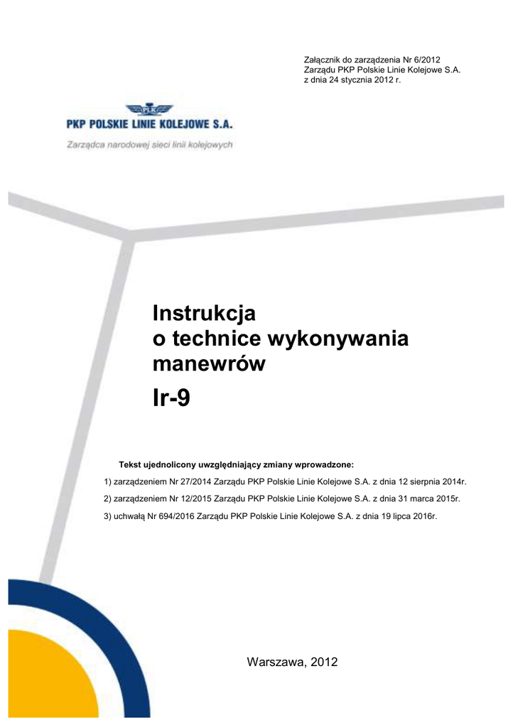 Załącznik do zarządzenia Nr 6/2012 Zarządu PKP Polskie Linie Kolejowe S.A. z dnia 24 stycznia 2012 r. Instrukcja o technice wykonywania manewrów Ir-9 Tekst ujednolicony uwzględniający zmiany wprowadzone: 1) zarządzeniem Nr 27/2014 Zarządu PKP Polskie Linie Kolejowe S.A. z dnia 12 sierpnia 2014r. 2) zarządzeniem Nr 12/2015 Zarządu PKP Polskie Linie Kolejowe S.A. z dnia 31 marca 2015r. 3) uchwałą Nr 694/2016 Zarządu PKP Polskie Linie Kolejowe S.A. z dnia 19 lipca 2016r. Warszawa, 2012 PKP POLSKIE LINIE KOLEJOWE S.A. Regulacja wewnętrzna spełnia wymagania określone w ustawie z dnia 28 marca 2003r. o transporcie kolejowym (Dz. U. z 2015r., poz. 1297, z późn. zm.) w zakresie zapewnienia bezpieczeństwa ruchu kolejowego. Właściciel: PKP Polskie Linie Kolejowe S.A. Wydawca: PKP Polskie Linie Kolejowe S.A. Centrala Biuro Eksploatacji ul. Targowa 74, 03-734 Warszawa tel. (+48 22) 47 320 16, fax. (+48 22) 47 324 76 www.plk-sa.pl, e-mail: [email protected] Wszelkie prawa zastrzeżone. Modyfikacja, wprowadzenie do obrotu, publikacja, kopiowanie i dystrybucja w celach komercyjnych całości lub części instrukcji bez uprzedniej zgody PKP Polskie Linie Kolejowe S.A. – są zabronione. 2 PKP POLSKIE LINIE KOLEJOWE S.A. SPIS TREŚCI Rozdział I POSTANOWIENIA OGÓLNE .....................................................5 § 1. Cel i zakres stosowania instrukcji .....................................................5 § 2. Podstawowe definicje .........................................................................5 § 3. Cel manewrów .....................................................................................8 § 4. Sposoby wykonywania manewrów ...................................................8 § 5. Pracownicy zatrudnieni przy manewrach ........................................9 § 6. Udział pracowników posterunków nastawczych w wykonywaniu manewrów ............................................................. 10 § 7. Obowiązki kierownika manewrów ................................................... 11 § 8. Obowiązki manewrowego ................................................................14 § 9. Obowiązki prowadzącego pojazd kolejowy z napędem .............. 16 Rozdział II TECHNIKA WYKONYWANIA MANEWRÓW .......................19 § 10. Wykonywanie manewrów i podawanie sygnałów przy manewrach ................................................................................ 19 § 11. Odrzucanie i staczanie pojazdów oraz stosowane ograniczenia .......................................................................................26 § 12. Hamowanie pojazdów .......................................................................31 § 13. Sprzęganie i rozprzęganie pojazdów kolejowych ......................... 33 § 14. Zabezpieczanie pojazdów kolejowych przed zbiegnięciem ........35 § 15. Manewry na torach głównych .......................................................... 36 § 16. Manewry przez przejazdy kolejowo – drogowe i przejścia2)3) ..... 39 § 17. Manewry z wagonami z ludźmi, wagonami zawierającymi towary niebezpieczne lub przesyłki nadzwyczajne, pojazdami kolejowymi grożącymi wykolejeniem ......................... 39 § 18. Manewrowanie pojazdami kolejowymi bez użycia pojazdu trakcyjnego ......................................................................................... 40 § 19. Prowadzenie manewrów przy obsłudze punktów ładunkowych .41 § 20. Posługiwanie się płozami hamulcowymi ........................................43 Rozdział III ZESTAWIANIE POCIĄGÓW ..................................................47 § 21. Zasady zestawiania pociągów ......................................................... 47 § 22. Długość i masa pociągu ...................................................................49 Rozdział IV PODSTAWOWE WYMAGANIA W ZAKRESIE BEZPIECZEŃSTWA PRACY ................................................ 51 § 23. Wyposażenie pracowników zatrudnionych przy manewrach ..... 51 § 24. Poruszanie się po torach ..................................................................51 § 25. Jazda na pojazdach kolejowych ...................................................... 52 § 26. Zachowanie ostrożności na torach zelektryfikowanych ...............53 Załącznik 1. Karta rozrządowa ..................................................................55 Załącznik 2. Oznaczenia na wagonach ................................................... 61 3 PKP POLSKIE LINIE KOLEJOWE S.A. 4 PKP POLSKIE LINIE KOLEJOWE S.A. Rozdział I POSTANOWIENIA OGÓLNE § 1. Cel i zakres stosowania instrukcji 1. Instrukcja o technice wykonywania manewrów, zwana dalej instrukcją Ir-9 podaje zasady i sposób wykonywania manewrów na liniach kolejowych zarządzanych przez PKP Polskie Linie Kolejowe S.A. 2. Celem instrukcji Ir-9 jest określenie zasad zapewniających bezpieczeństwo osób, pojazdów kolejowych i ładunków przy wykonywaniu manewrów. 3. Postanowienia instrukcji Ir-9 należy wykorzystać przy opracowywaniu regulaminów technicznych i regulaminów pracy bocznicy kolejowej. 4. Zasady wykonywania manewrów pojazdami kolejowymi wyposażonymi w urządzenia pokładowe systemu ERTMS/ETCS poziomu 1, zarówno na torach objętych systemem ERTMS/ETCS poziomu 1, jak również na torach nie objętych tym systemem, należy wykonywać według postanowień określonych w „Instrukcji o prowadzeniu ruchu pociągów z wykorzystaniem systemu ERTMS/ETCS poziomu 1 Ir-1a”.1) § 2. Podstawowe definicje 1. Bocznica kolejowa - droga kolejowa połączona z linią kolejową i służąca do wykonywania załadunku i wyładunku wagonów lub wykonywania czynności utrzymaniowych pojazdów kolejowych lub postoju pojazdów kolejowych oraz przemieszczania i włączania pojazdów kolejowych do ruchu po sieci kolejowej; w skład bocznicy kolejowej wchodzą również urządzenia sterowania ruchem kolejowym oraz inne urządzenia związane z bezpi
