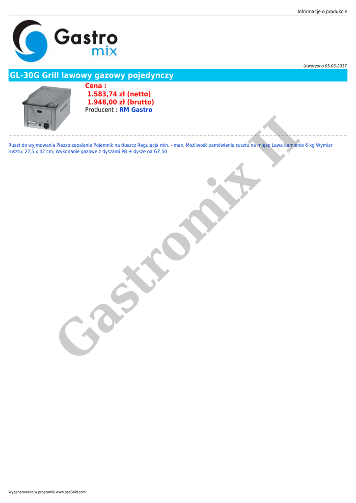 Informacje o produkcie Utworzono 03-03-2017 GL-30G Grill lawowy gazowy pojedynczy Cena : 1.583,74 zł (netto) 1.948,00 zł (brutto) II Producent : RM Gastro G as tr o m ix Ruszt do wyjmowania Piezzo zapalanie Pojemnik na tłuszcz Regulacja min. - max. Możliwość zamówienia rusztu na mięso Lawa kamienie 6 kg Wymiar rusztu: 27,5 x 42 cm; Wykonanie gazowe z dyszami PB + dysze na GZ 50 Wygenerowano w programie www.oscGold.com