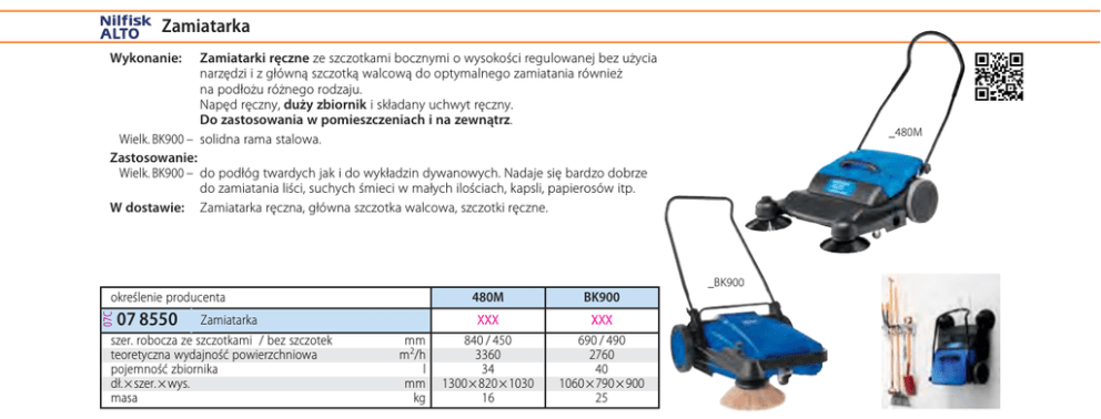 Zamiatarka Wykonanie: Zamiatarki ręczne ze szczotkami bocznymi o wysokości regulowanej bez użycia narzędzi i z główną szczotką walcową do optymalnego zamiatania również na podłożu różnego rodzaju. Napęd ręczny, duży zbiornik i składany uchwyt ręczny. Do zastosowania w pomieszczeniach i na zewnątrz. Wielk. BK900 – solidna rama stalowa. Zastosowanie: Wielk. BK900 – do podłóg twardych jak i do wykładzin dywanowych. Nadaje się bardzo dobrze do zamiatania liści, suchych śmieci w małych ilościach, kapsli, papierosów itp. W dostawie: Zamiatarka ręczna, główna szczotka walcowa, szczotki ręczne. _480M _BK900 określenie producenta 07C 07 8550 Zamiatarka szer. robocza ze szczotkami / bez szczotek teoretyczna wydajność powierzchniowa pojemność zbiornika dł.×szer.×wys. masa mm m2/h l mm kg 480M BK900 XXX 840 / 450 3360 34 1300×820×1030 16 XXX 690 / 490 2760 40 1060×790×900 25