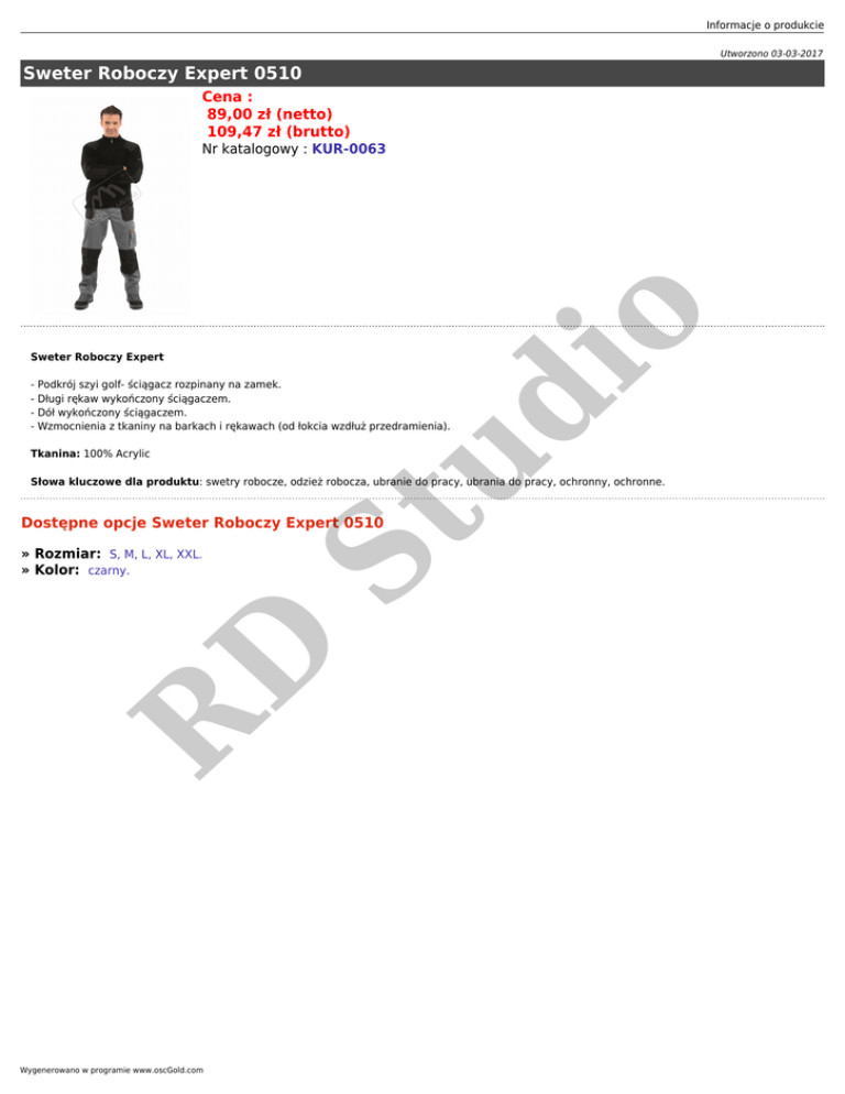 Informacje o produkcie Utworzono 03-03-2017 Sweter Roboczy Expert 0510 Cena : 89,00 zł (netto) 109,47 zł (brutto) Sweter Roboczy Expert Tkanina: 100% Acrylic St ud - Podkrój szyi golf- ściągacz rozpinany na zamek. - Długi rękaw wykończony ściągaczem. - Dół wykończony ściągaczem. - Wzmocnienia z tkaniny na barkach i rękawach (od łokcia wzdłuż przedramienia). io Nr katalogowy : KUR-0063 Słowa kluczowe dla produktu: swetry robocze, odzież robocza, ubranie do pracy, ubrania do pracy, ochronny, ochronne. Dostępne opcje Sweter Roboczy Expert 0510 R D » Rozmiar: S, M, L, XL, XXL. » Kolor: czarny. Wygenerowano w programie www.oscGold.com