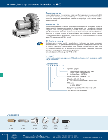 wentylatory boczno-kanałowe SC Zastosowanie Urządzenia do transportu pneumatycznego, maszyny graficzne, poczta pneumatyczna, podnośniki pneumatyczne, wielostopniowe urządzenia filtracyjne o bardzo wysokim stopniu separacji pyłów, odkurzacze przemysłowe, napowietrzanie basenów w biologicznych oczyszczalniach ścieków, galwanizerniach, etc. Konstrukcja Wentylator bocznokanałowy o napędzie bezpośrednim przeznaczony do bezolejowego transportu nieagresywnych i niewybuchowych gazów lub do wytwarzania nad i podciśnienia. Obudowa wentylatora, wirnik (wyważany dynamicznie wg ISO 1940) oraz obudowa tłumika dźwięku wykonane są ze stopów aluminium. Wentylator przystosowany jest do pracy w pozycji poziomej lub pionowej. Wentylatory o napędzie pasowym o charakterystykach dostosowanych do potrzeb klientów wykonywane są na życzenie. Na zamówienie urządzenie może być dostarczone w dowolnym kolorze z palety RAL (standardowo RAL 7042 – szary). Silnik elektryczny Silnik elektryczny wykonany zgodnie z obowiązującymi Dyrektywami oraz klasami sprawności, oznaczony znakiem CE. W wybranych modelach silnik wyposażony w zabezpieczenie termiczne (TP lub TP i PTC). Klasa izolacji - F. stopień ochrony - IP55. Zasilanie - trójfazowe 230/400V 50Hz, 400V 50Hz lub jednofazowe 230V 50Hz (w zależności od modelu wentylatora i mocy silnika). Wentylatory z silnikami w wersji specjalnej: tabela wykonań specjalnych. Schemat podłączenia elektrycznego: rys. 11, 12, str. 851. Uwaga! Transport gazów wybuchowych i agresywnych lub gazów zanieczyszczonych, zawierających cząstki stałe jest niedozwolony. Oznaczenia SC 2 0 A 110 T wykonania specjalne T S silnik trójfazowy 220-240/380-420V, 50Hz lub 380-420/660-690V ponad 3 kW silnik jednofazowy 230V, 50Hz współczynnik mocy 1,1 kW x 100 = 110 Charakterystyka A, B, C... etc. K charakterystyka dostosowana do potrzeb klienta Wykonanie 0 - napęd bezpośredni 5 - napęd pasowy Bezwymiarowy współczynnik wielkości 1, 2, 3, 4, 5 Typ - Wentylator boczno-kanałowy Akcesoria filtr tłumik króciec str. 836 str. 836 str. 836 kołnierz do spawania str. 836 kołnierz gwintowany str. 836 filtr kanałowy str. 837 810 Venture Industries Sp. z o.o. ul. Mokra 27, 05-092 Łomianki - Kiełpin tel. +48 22 751 95 50, 751 20 31 fax +48 22 751 22 59, 751 12 02 e-mail: [email protected] wentylatory boczno-kanałowe SC Dane techniczne moc znam. [kW] silnik napięcie znam. [V] SC10A 037T 0,37 400Y 1,02Y 110 71 15,0 46511010 SC10A 055T 0,55 400Y 1,35Y 110 72 16,0 46511030 SC10C 075T 0,75 400Y 1,90Y 110 73 18,5 46511050 Typ natężenie znam. [A] wydajność max. poziom ciśnienia akustycznego** masa [m3/h] [dB(A)] [kg] nr artykułu Wentylatory boczno-kanałowe trójfazowe SC20A 110T 1,10 400Y 2,50Y 190 75 22,0 46511070 SC20A 150T 1,50 400Y 3,40Y 190 77 24,5 46511100 SC20C 110T 1,10 400Y 2,50Y 190 75 22,0 46511090 SC20C 150T 1,50 400Y 3,40Y 190 77 24,5 46511110 SC30A 220T 2,20 400Y 4,60Y 320 78 36,0 46511130 SC30A 300T1 3,00 400Y 6,50Y 320 80 40,0 46511150 SC30C 220T 2,20 400Y 4,60Y 320 78 36,0 46511160 SC30C 300T1 3,00 400Y 6,50Y 320 81 40,0 46511170 SC40A 400T2 4,00 400D 7,80D 650 82 67,0 46511180 SC40A 550T3 5,50 400D 10,60D 650 84 70,0 46511190 SC40A 750T3 7,50 400D 14,00D 650 85 73,0 46511200 SC40C 550T3 5,50 400D 10,60D 650 84 70,0 46511220 SC40C 750T3 7,50 400D 14,00D 650 86 73,0 46511230 SC46A 750T 7.5 400D 14.0 750 82 105 426511240 SC46A 1100T 11.0 400D 21.2 750 84 120 426511242 SC46C 750T 7.5 400D 14.0 800 84 105 426511244 SC46C 1100T 11.0 400D 21.2 800 86 120 426511246 SC50A 750T3 7,50 400D 14,00D 1100 82 126,0 46511250 SC50A 1100T3 11,00 400D 21,20D 1100 84 128,0 46511260 SC50A 1500T3 15,00 400D 27,20D 1100 87 155,0 46511270 SC50C 750T3 7,50 400D 14,00D 1100 84 126,0 46511280 SC50C 1100T3 11,00 400D 21,20D 1100 86 128,0 46511290 SC50C 1500T3 15,00 400D 27,20D 1100 Wentylatory boczno-kanałowe jednofazowe 88 155,0 46511300 SC10A 037S 0,37 230 2,90 110 70 18,0 46511020 SC10A 055S2 0,55 230 4,00 110 72 19,0 46511040 SC10C 075S2 0,75 230 5,20 110 73 21,5 46511060 SC20A 110S2 1,10 230 7,90 190 75 25,0 46511080 SC20A 150S2 1,50 230 8,70 190 77 26,0 46511115 SC20C 110S2 1,10 230 7,90 190 75 25,0 46511095 SC20C 150S2 1,50 230 8,70 190 77 26,0 46511120 SC30A 220S 2,20 230 14,00 320 78 39,0 46511135 ** z tłumikiem 1 - czujnik TP; 2 - łożysko temperaturowe od strony N napędowej; 3 - czujnik TPC i czujnik TP; www.venture.pl 811 wentylatory boczno-kanałowe SC Wymiary [mm] Typ A B C D E F G H I J K max. L M N P OR S T W V SC10 296 170 45 80 68 90 220 250 12 330 290 120 150 66 60 141 15 11 M5 117 SC20 360 200 45 80 68 90 220 250 12 360 348 120 150 66 60 157 15 11 M5 129,5 SC30 395 225 55 100 85 125 310 350 12 445 415 160 200 72 80 175 20 13 M6 140 172 SC40 480 275 75 130 110 145 365 420 12 530 510 260 300 34 80 230 30 14 M8 SC46 540 303 100 150 130 160 400 450 20 660 600 370 430 50 - - 30 20 M8 - SC50 580 336 100 150 130 160 400 450 25 690 650 370 430 50 95 258 30 20 M8 202 812 Venture Industries Sp. z o.o. ul. Mokra 27, 05-092 Łomianki - Kiełpin tel. +48 22 751 95 50, 751 20 31 fax +48 22 751 22 59, 751 12 02 e-mail: [email protected] wentylatory boczno-kanałowe SC Montaż opcja I 2 lub 3 opcja III lub 4 7 6 1 8 5 2 lub 3 lub 4 11 7 1 2 lub 3 11 lub 4 9 9 opcja II 2 lub 3 lub 4 1 10 11 2 lub 3 lub 4 7 Typ wentylatora 1 kołnierz kołnierz do spawania gwintowany 2 3 króciec ssawny 4 króciec do filtra 5 7 8 9 filtr 6 króciec przyłączeniowy 7 tłumik 8 zawór filtr przeciążeniowy kanałowy 9 10 kolano 11 SC10 45516500 45516600 46515210 46515110 46515010 46515250 46525310 46515520 46515070 46515285 SC20 45516500 45516600 46515210 46515110 46515010 46515250 46525310 46515520 46515075 46515285 SC/DSC/PSC30 45516510 45516610 46515220 46515120 46515020 46515260 46525320 46515530 46515080 46515286 SC/DSC/PSC40 45516520 45516620 46515230 46515130 46515030 46515270 46525330 46515540 46515085 46515287 SC50/SC46 45516530 45516630 46515240 46515140 46515032 46515280 4