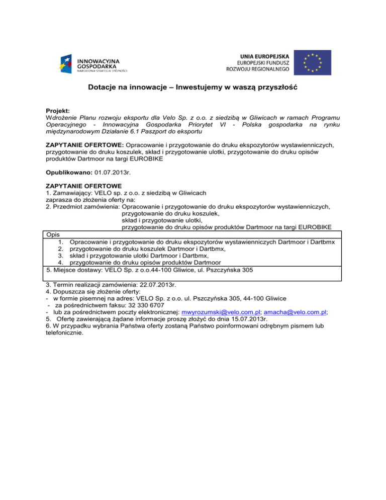 Dotacje na innowacje – Inwestujemy w waszą przyszłość Projekt: Wdrożenie Planu rozwoju eksportu dla Velo Sp. z o.o. z siedzibą w Gliwicach w ramach Programu Operacyjnego - Innowacyjna Gospodarka Priorytet VI - Polska gospodarka na rynku międzynarodowym Działanie 6.1 Paszport do eksportu ZAPYTANIE OFERTOWE: Opracowanie i przygotowanie do druku ekspozytorów wystawienniczych, przygotowanie do druku koszulek, skład i przygotowanie ulotki, przygotowanie do druku opisów produktów Dartmoor na targi EUROBIKE Opublikowano: 01.07.2013r. ZAPYTANIE OFERTOWE 1. Zamawiający: VELO sp. z o.o. z siedzibą w Gliwicach zaprasza do złożenia oferty na: 2. Przedmiot zamówienia: Opracowanie i przygotowanie do druku ekspozytorów wystawienniczych, przygotowanie do druku koszulek, skład i przygotowanie ulotki, przygotowanie do druku opisów produktów Dartmoor na targi EUROBIKE Opis 1. Opracowanie i przygotowanie do druku ekspozytorów wystawienniczych Dartmoor i Dartbmx 2. przygotowanie do druku koszulek Dartmoor i Dartbmx, 3. skład i przygotowanie ulotki Dartmoor i Dartbmx, 4. przygotowanie do druku opisów produktów Dartmoor 5. Miejsce dostawy: VELO Sp. z o.o.44-100 Gliwice, ul. Pszczyńska 305 3. Termin realizacji zamówienia: 22.07.2013r. 4. Dopuszcza się złożenie oferty: - w formie pisemnej na adres: VELO Sp. z o.o. ul. Pszczyńska 305, 44-100 Gliwice - za pośrednictwem faksu: 32 330 6707 - lub za pośrednictwem poczty elektronicznej: [email protected]; [email protected]; 5. Ofertę zawierającą żądane informacje proszę złożyć do dnia 15.07.2013r. 6. W przypadku wybrania Państwa oferty zostaną Państwo poinformowani odrębnym pismem lub telefonicznie.