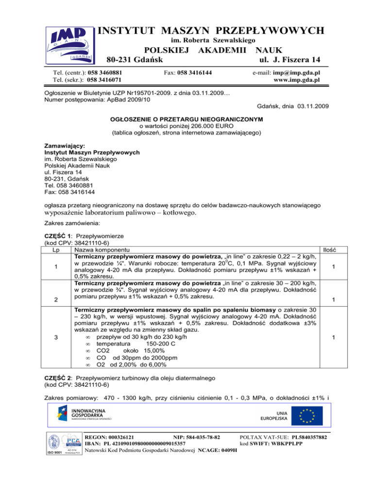 INSTYTUT MASZYN PRZEPŁYWOWYCH im. Roberta Szewalskiego POLSKIEJ AKADEMII NAUK 80-231 Gdańsk ul. J. Fiszera 14 Tel. (centr.): 058 3460881 Tel. (sekr.): 058 3416071 Fax: 058 3416144 e-mail: [email protected] www.imp.gda.pl Ogłoszenie w Biuletynie UZP Nr195701-2009. z dnia 03.11.2009… Numer postępowania: ApBad 2009/10 Gdańsk, dnia 03.11.2009 OGŁOSZENIE O PRZETARGU NIEOGRANICZONYM o wartości poniŜej 206.000 EURO (tablica ogłoszeń, strona internetowa zamawiającego) Zamawiający: Instytut Maszyn Przepływowych im. Roberta Szewalskiego Polskiej Akademii Nauk ul. Fiszera 14 80-231, Gdańsk Tel. 058 3460881 Fax: 058 3416144 ogłasza przetarg nieograniczony na dostawę sprzętu do celów badawczo-naukowych stanowiącego wyposaŜenie laboratorium paliwowo – kotłowego. Zakres zamówienia: CZĘŚĆ 1: Przepływomierze (kod CPV: 38421110-6) Lp Nazwa komponentu Termiczny przepływomierz masowy do powietrza, „in line” o zakresie 0,22 – 2 kg/h, 0 w przewodzie ¼''. Warunki robocze: temperatura 20 C, 0,1 MPa. Sygnał wyjściowy 1 analogowy 4-20 mA dla przepływu. Dokładność pomiaru przepływu ±1% wskazań + 0,5% zakresu. Termiczny przepływomierz masowy do powietrza „in line” o zakresie 30 – 200 kg/h, w przewodzie ¾''. Sygnał wyjściowy analogowy 4-20 mA dla przepływu. Dokładność pomiaru przepływu ±1% wskazań + 0,5% zakresu. 2 3 Ilość Termiczny przepływomierz masowy do spalin po spaleniu biomasy o zakresie 30 – 230 kg/h, w wersji wpustowej. Sygnał wyjściowy analogowy 4-20 mA. Dokładność pomiaru przepływu ±1% wskazań + 0,5% zakresu. Dokładność dodatkowa ±3% wskazań ze względu na zmienny skład gazu. • przepływ od 30 kg/h do 230 kg/h • temperatura 150-200 C • CO2 około 15,00% • CO od 30ppm do 2000ppm • O2 od 2,00% do 6,00% CZĘŚĆ 2: Przepływomierz turbinowy dla oleju diatermalnego (kod CPV: 38421110-6) Zakres pomiarowy: 470 - 1300 kg/h, przy ciśnieniu ciśnienie 0,1 - 0,3 MPa, o dokładności ±1% i REGON: 000326121 NIP: 584-035-78-82 POLTAX VAT-5UE: PL5840357882 IBAN: PL 42109010980000000009015357 kod SWIFT: WBKPPLPP Natowski Kod Podmiotu Gospodarki Narodowej NCAGE: 0409H 1 1 1 INSTYTUT MASZYN PRZEPŁYWOWYCH im. Roberta Szewalskiego POLSKIEJ AKADEMII NAUK 80-231 Gdańsk ul. J. Fiszera 14 Tel. (centr.): 058 3460881 Tel. (sekr.): 058 3416071 Fax: 058 3416144 e-mail: [email protected] www.imp.gda.pl powtarzalności 0,1%. Temperatura pracy do 350°C. Dane oleju diatermalnego: • gęstość 732 kg/m3 • lepkość: • 20 C - 97cP • 200 C - 1,19cP • 250 C – 0,777cP CZĘŚĆ 3: Termopary (kod CPV 38417000-1) Lp Nazwa komponentu 0 Głowicowe czujnik temperatury o zakresie od 0 do 1300 C z termoelementem typu S klasy 1, o średnicy termoelementu równej 0,5mm. Spoina pomiarowa odizolowana od 1 osłony. Materiał osłony typu korund, o średnicy 15mm i długości 600mm. Długość tulei nośnej 150mm. 0 Głowicowe czujniki temperatury o zakresie od 0 do 1000 C z termoelementem typu K 2 klasy 1. Spoina pomiarowa odizolowana od osłony. 0 Termopary płaszczowe typu S klasy 1, do temperatury 1300 C, długość czujnika L = 3 150mm, o średnicy 3mm. 0 Termopary płaszczowe typu K klasy 1, do temperatury 1000 C, długość czujnika L = 4 150mm, o średnicy 3mm. 5 Termopary płaszczowe typu K, spoina izolowana, średnica φ0.5, klasa 1, maksymalna 0 temperatura pomiaru 900 C, długość termopary 100mm, przewód kompensacyjny 2500mm, świadectwo wzorcowania CZĘŚĆ 4: Przetworniki róŜnicy ciśnień (kod CPV 31711120-0) Lp. Nazwa komponentu Przetwornik róŜnicy ciśnień z separatorami odległościowymi do pracy przy wysokich temperaturach medium do 250°C (zakres podstawowy -50 ÷ 50 kPa, zakres nastawiony 0÷50 kPa, dopuszczalne ciśnienie statyczne/przeciąŜenie 4MPa, dopuszczalny błąd 1 podstawowy 0.1%, separatory odległościowe kompaktowe, przeciwkołnierze z króćcem M20x1,5, wyjście prądowe 4-20 mA + Hart, wyświetlacz, sprawdzenie ch-ki metrologicznej). Przetwornik róŜnicy ciśnień z separatorami odległościowymi do pracy przy wysokich temperaturach medium do 250°C (zakres podstawowy -16 ÷ 16 kPa, zakres nastawiony 0÷16 kPa, dopuszczalne ciśnienie statyczne/przeciąŜenie 4MPa, dopuszczalny błąd 2 podstawowy 0.1%, separatory odległościowe kompaktowe, przeciwkołnierze z króćcem M20x1,5, wyjście prądowe 4-20 mA + Hart, wyświetlacz, sprawdzenie ch-ki metrologicznej). REGON: 000326121 NIP: 584-035-78-82 POLTAX VAT-5UE: PL5840357882 IBAN: PL 42109010980000000009015357 kod SWIFT: WBKPPLPP Natowski Kod Podmiotu Gospodarki Narodowej NCAGE: 0409H ilość 3 5 6 3 5 Ilość 1 1 INSTYTUT MASZYN PRZEPŁYWOWYCH im. Roberta Szewalskiego POLSKIEJ AKADEMII NAUK 80-231 Gdańsk ul. J. Fiszera 14 Tel. (centr.): 058 3460881 Tel. (sekr.): 058 3416071 Fax: 058 3416144 e-mail: [email protected] www.imp.gda.pl CZĘŚĆ 5: Przetworniki ciśnienia (kod CPV 31711120-0) Nazwa komponentu Lp. 1 2 Przetwornik ciśnienia absolutnego (0-6 bar, dokładność temperatura medium 125°C, wyjście prądowe 4-20 mA, przyłącze męskim G1/4”, świadectwo wzorcowania) Przetwornik ciśnienia względnego (0-40 bar, dokładność temperatura medium 125°C, wyjście prądowe 4-20 mA, przyłącze męskim G1/4, świadectwo wzorcowania) Ilość 0.15%, maksymalna montaŜowe z gwintem 2 0.15%, maksymalna montaŜowe z gwintem 2 CZĘŚĆ 6: Dwa Pompo-zespoły do przetłaczania oleju termalnego w instalacjach laboratoryjnych w IMPPAN z falownikami (kod CPV 42122500-5) Wymagania techniczne dla pompo-zespołów: Czynnik roboczy: olej termalny o lepkości 0.55 mPas i gęstości 710 kg/m3 (w temp.250ºCnormalny stan pracy), lepkości 40 mPas i gęstości 860 kg/m3 (w temp.20ºC- stan rozruchowy) Wydatek (objętościowe natęŜenie przepływu): 14 l/min Max. róŜnica ciśnień między ssaniem a tłoczeniem: 0.3 bara Ciągła praca pompy w temperaturze do 250ºC Zwarta, kompaktowa konstrukcja pompo-zespołu (długość pompo-zespołu nie przekraczająca 450mm