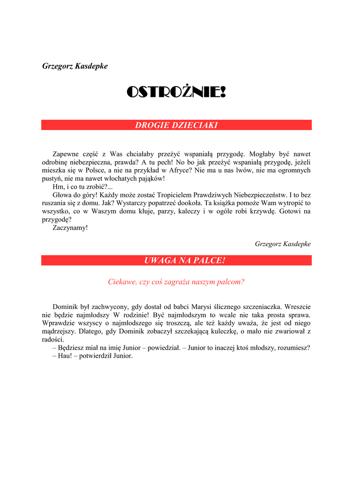Grzegorz Kasdepke OSTROŻNIE! DROGIE DZIECIAKI Zapewne część z Was chciałaby przeżyć wspaniałą przygodę. Mogłaby być nawet odrobinę niebezpieczna, prawda? A tu pech! No bo jak przeżyć wspaniałą przygodę, jeżeli mieszka się w Polsce, a nie na przykład w Afryce? Nie ma u nas lwów, nie ma ogromnych pustyń, nie ma nawet włochatych pająków! Hm, i co tu zrobić?... Głowa do góry! Każdy może zostać Tropicielem Prawdziwych Niebezpieczeństw. I to bez ruszania się z domu. Jak? Wystarczy popatrzeć dookoła. Ta książka pomoże Wam wytropić to wszystko, co w Waszym domu kłuje, parzy, kaleczy i w ogóle robi krzywdę. Gotowi na przygodę? Zaczynamy! Grzegorz Kasdepke UWAGA NA PALCE! Ciekawe, czy coś zagraża naszym palcom? Dominik był zachwycony, gdy dostał od babci Marysi ślicznego szczeniaczka. Wreszcie nie będzie najmłodszy W rodzinie! Być najmłodszym to wcale nie taka prosta sprawa. Wprawdzie wszyscy o najmłodszego się troszczą, ale też każdy uważa, że jest od niego mądrzejszy. Dlatego, gdy Dominik zobaczył szczekającą kuleczkę, o mało nie zwariował z radości. – Będziesz miał na imię Junior – powiedział. – Junior to inaczej ktoś młodszy, rozumiesz? – Hau! – potwierdził Junior. Dominik pokraśniał z zadowolenia. I zaraz postanowił podzielić się z Juniorem swoim bogatym życiowym doświadczeniem. – Życie jest fajne – powiedział z powagą. – Ale nawet w domu należy uważać. Na przykład na palce. Wiesz, co to są palce? Junior zamachał ogonem na znak, że owszem, wie. – Za nic w świecie – mówił dalej Dominik – nie wkładaj ich między drzwi a fra... – przerwał i spojrzał z wahaniem na babcię Marysię, która wniosła właśnie miseczkę z wodą. – Framugę – podpowiedziała babcia. – Właśnie, framugę! – zgodził się Dominik. – Słuchasz mnie? Ale Junior wydawał się bardziej zainteresowany miseczką z wodą niż słowami Dominika. – Nie no, on jest niepoważny... – jęknął Dominik, zupełnie tak samo jak mama, gdy stara się przestrzec Dominika przed niektórymi niebezpieczeństwami. – Naprawdę? – zachichotała babcia Marysia i poszła do kuchni. – Naprawdę – zasapał Dominik. – Junior, słuchaj mnie! Palców nie można pchać też z tej strony drzwi, gdzie są zawiasy. Ani w zbyt wąskie szpary między szczebelkami krzeseł. Ani do butelek. Ani do szafki z nożami. Uważaj też na zapałki i gorące garnki. Zapamiętasz? – Hau! – zaszczekał Junior. A potem capnął Dominika za rękę. Oho – pomyślał Dominik umykając do babci Marysi. – Na psie zęby też należy uważać. Człowiek uczy się przez całe życie. A teraz usiądźcie ze swoimi rodzicami i porozmawiajcie o innych miejscach, w które raczej nie należy pchać palców. KLOCEK W NOSIE Niektóre zabawy są bardzo niemądre – na przykład wpychanie sobie czegoś do ucha... Opieka nad ruchliwym kilkulatkiem nie jest łatwa, ale prawdziwe wyzwanie to opieka nad ruchliwym kilkulatkiem oraz jego psem. Do takich wniosków doszła babcia Marysia po tygodniu zajmowania się Dominikiem. – Ja chyba zwariuję... – jęknęła na widok rozsypanego w kuchni grochu. – Co to ma znaczyć?! – Że Junior to jeszcze szczeniak... – westchnął Dominik. – Hau! – zaprotestował Junior. – A kto chciał sobie wepchnąć groch do ucha?! – Dominik spojrzał na pieska z potępieniem. – I fasolę?! – Ty – wtrąciła babcia Marysia. – Przedwczoraj, o ile dobrze pamiętam! – Ale nie z głupoty – zaczerwienił się Dominik. – To były przygotowania do kolejnej lekcji. Chciałem sprawdzić, czego jeszcze nie należy pchać do uszu. – I do nosa – przypomniała babcia. – Tak, i do nosa – zasapał ze złością Dominik. Babcia Marysia pokiwała głową. Do końca życia nie zapomni tego widoku: zapłakany Dominik ze sterczącymi z nozdrzy klockami lego. – Przecież nie robiłem tego dla zabawy! – naburmuszył się Dominik. – Tak czy siak mądre to nie było – odparła babcia Marysia. – Pewnych rzeczy nie robi się, i już! Chyba że chcesz trafić do szpitala. Nie można sobie wkładać do uszu lub do nosa kulek, zabawek, ołówków, cukierków, patyków czy czegokolwiek! – Powiedz to mamie – mruknął Dominik. – Dlaczego? – zdziwiła się babcia Marysia. – Chyba mama nie jest aż tak niemądra, żeby... – Nie?! – przerwał jej Dominik. – To poczekaj chwilę! Babcia Marysia i Junior wymienili zdumione spojrzenia. Tymczasem Dominik pobiegł do łazienki. Po sekundzie był z powrotem. – No i co?! – zapytał triumfalnie. – Przecież to są patyczki do czyszczenia uszu – roześmiała się babcia Marysia. – No właśnie – przytaknął Dominik. – Do uszu! Czyli mama może, a ja nie! – No tak – pokiwała głową babcia Marysia. – Bo nawet takimi patyczkami można sobie zrobić krzywdę. Dominik zagryzł wargi. – Podsumujmy – powiedziała łagodnie babcia Marysia. – Nie wpychamy niczego do uszu, oczu, buzi i nosa. – A do... – zaczął niepewnie Dominik. – Nigdzie – powiedziała z naciskiem babcia Marysia. – Zrozumiano?! – Zrozumiano – mruknął z urazą Dominik. Ta babcia chyba naprawdę myśli, że on jest dzieckiem! No to jeszcze raz: czego i gdzie nie należy wpychać? AŁŁA, GORĄCE! Uwaga, sprawdzamy, co może nas oparzyć! Pomimo że Dominik każdą wolną chwilę poświęcał wychowywaniu swego pieska, Juniora, efekty były mizerne. Junior nie tylko nie stosował się do rad Dominika, ale czasami wręcz demonstrował znudzenie jego słowami; drapał się wówczas za uchem, ziewał, a raz – nie wytrzymawszy do końca wykładu – zrobił siusiu na oczach osłupiałego z oburzenia Dominika. Cóż, wychowawcy mają ciężkie życie. Szczególnie, jeżeli sami nie są jeszcze zbyt duzi. – Ile razy mam ci powtarzać – Dominik patrzył srogo na Juniora – żebyś nie dotykał piekarnika, bo można się poparzyć? – Hau!