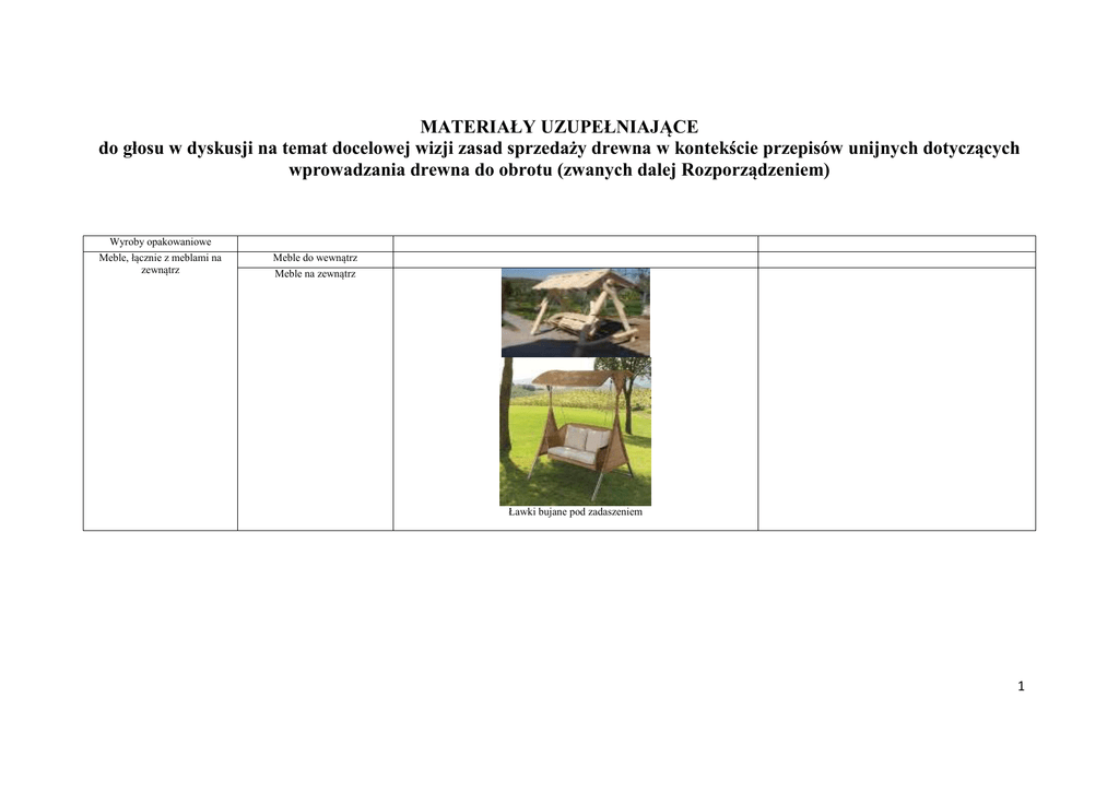 MATERIAŁY UZUPEŁNIAJĄCE do głosu w dyskusji na temat docelowej wizji zasad sprzedaży drewna w kontekście przepisów unijnych dotyczących wprowadzania drewna do obrotu (zwanych dalej Rozporządzeniem) Wyroby opakowaniowe Meble, łącznie z meblami na zewnątrz Meble do wewnątrz Meble na zewnątrz Ławki bujane pod zadaszeniem 1 Stoły i ławki ogrodowe 2 Stoły i ławy na otwartej powierzchni Wyroby przemysłu celulozowo – papierniczego Wyroby energetyczne Inne wyroby z drewna (z wyłączeniem urządzeń nieruchomych o konstrukcji drewnianej oraz wyodrębnionych funkcjonalnie drewnianych części tych urządzeń Urządzenia nieruchome z drewna lub, wytworzone z drewna, wyodrębnione funkcjonalnie części tych nieruchomości Do późniejszego właściwego zaklasyfikowania Mostek ogrodowy 3 Domek dla ptaków Imitacja studni Budy dla psów 4 Imitacja wozu drabiniastego Imitacja wiatraka 5 Huśtawki, hamaki, podobne ruchomości Wieżyczka ze zjeżdżalnią 6 Piaskownica Piaskownica z ławką 7 Donica z drewna (3) Donice z drewna (4) Donice z drewna (5) Donice z drewna (6) 8 Płot osłonowy (4) Płot osłonowy - przęsło (5) Płot osłonowy - przęsło (6) 9 Płot osłonowy - przęsło (7) Płot osłonowy - przęsło(8) Płot osłonowy z cienkich desek - przęsło (9) 10 Płot osłonowy - przęsło (10) Płot osłonowy - przęsło(11) Płot osłonowy – przęsło(12) 11 Płot osłonowy- z desek „boazeryjnych”- przęsło (13) Element obrzeża służącego wewnętrznemu rozgraniczaniu i wyodrębnianiu funkcjonalnych części nieruchomości (zwykle ogrodów) (1) Element obrzeża (imitacja płotu) służącego wewnętrznemu rozgraniczaniu i wyodrębnianiu funkcjonalnych części nieruchomości (zwykle ogrodów) (2) Regał ogrodowy 12 Stolik ogrodowy Obudowa drewniana na pojemniki na odpady komunalne Obudowa drewniana śmietnika (2) Skrzynia - kompostownik 13 Elementy ogrodzeń drewnianych sztachetowych (1) Elementy ogrodzeń drewnianych sztachetowych (2) Elementy ogrodzeń drewnianych sztachetowych (3) Przęsło drewnianych zasłon przeciwśnieżnych Płotki drewniane wykonywane są z desek lub króciaków i okorków grubości 12÷18 mm. Szerokość desek wynosi 9 cm, a odstęp pomiędzy nimi 10 cm. Wymiary przęsła wynoszą 1,50 m (wysokość) x 2,0÷2,5 m (długość). Żaluzja z drewna 14 Koła drewniane Przykład rękojeści z drewna 15 Linijka składana (stolarska) Przymiar z drewna bukowego Linijka szkolna z drewna Drewniane kości do modelowania w glinie 16 Młotek drewniany (sędziowski, licytacyjny itp.) Drabina drewniana rozstawna Schody drewniane rozkładane Drewniana obudowa kominka 17 Koziołek z drewna Ul wykonany z drewna Prefabrykat z lignofolu 18 Półfabrykat – rękojeść wytworzona z lignofolu 19 20