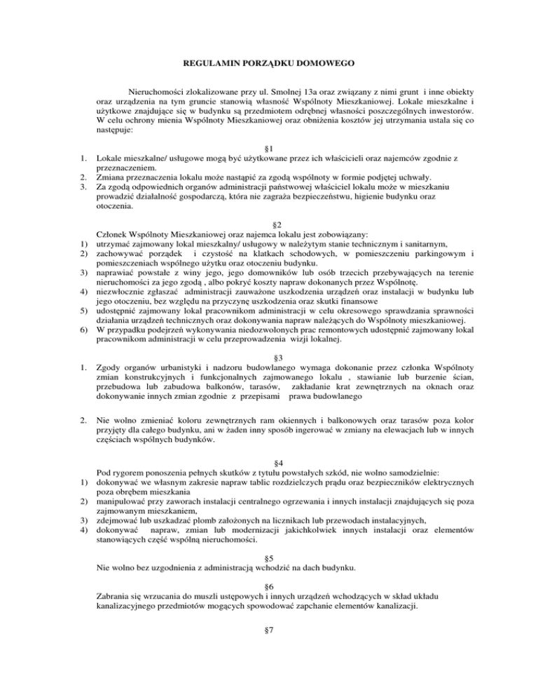 Regulamin porządku domowego - Opis nieruchomości Smolna 13A