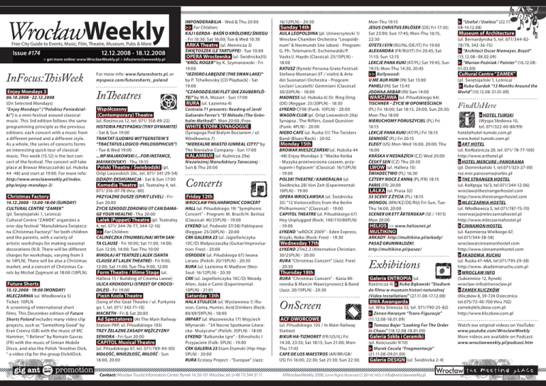 WrocławWeekly Free City Guide to Events, Music, Film, Theatre, Museum, Pubs & More Issue #174 12.12.2008 - 18.12.2008 > get more online: www.WroclawWeekly.pl > [email protected] InFocus:ThisWeek Enjoy Mondays 3 06.10.2008 - 22.12.2008 (On Selected Mondays) “Enjoy Mondays” (“Polubisz Poniedziałki”) is a mini-festival around classical music. This 3rd edition follows the same programming principle as the previous editions: each concert with a music from a different period and a different style. As a whole, the series of concerts forms an interesting quick tour of classical music. This week (15.12) is the last concert of the festival. The concert will take place at Browar Mieszczański (ul. Hubska 44 -48) and start at 19:00. For more info: http://www.wroclawweekly.pl/index. php/enjoy-mondays-3/ Christmas Factory 14.12.2008 - 13:00-18:00 (Sunday) Cultural Centre “ZAMEK" (pl. Świętojański 1, Leśnica) Cultural Centre “ZAMEK" organizes a one-day festival “Manufaktura Świąteczna (Christmas Factory)" for both children and the parents, with a variety of artistic workshops for making seasonal decorations (N.B. There will be different charges for workshops, varying from 5 to 14PLN). There will be also a Christmas market, and a concert of Christmas Carols by Michał Zygmunt at 18:00 (10PLN). Future Shorts 15.12.2008 - 19:00 (Monday) MLECZARNIA (ul. Włodkowica 5) Ticket: 10PLN A screening of international short films. This December edition of Future Shorts Poland includes many video clip projects, such as “Something Good" by Eran Creevy (GB) with the music of MC Hammer, “I Believe" by Romain Gavras (FR) with the music of Simian Mobile Disco, and also the Polish “Another Dick, “ a video clip for the group Dick4Dick. For more info: www.futureshorts.pl, or myspace.com/futureshorts_poland InTheatres Współczesny (Contemporary) Theatre (ul. Rzeźnicza 12, tel. 071/ 358-89-22) Historia przypadku (Tiny Dynamite) - Sat & Sun 19:00 Traktat (Ludwig Wittgenstein’s “Tractatus logico-philosophicus") - Tue & Wed 19:00 ...np Majakowski (...for instance, Mayakovsky) - Thu 19:15 Polski Theatre / Świebodzki (pl. Orląt Lwowskich 20c, tel. 071/ 341-29-54) Dziady: Ekshumacja - Sat & Sun 17:00 Komedia Theatre (pl. Teatralny 4, tel. 071/ 316-07-78 thru -80) Przyjazne Dusze (Spirit Level) - FriSun 20:00 Życie szkodzi zdrowiu (It Can Damage Your Health) - Thu 20:00 Lalek (Puppet) Theatre (pl. Teatralny 4, tel. 071/ 344-76-77, 344-12-16) >> For Children: Calineczka (Thumbelina) with Santa Clause - Fri 10:00; Sat 11:00, 14:00; Sun 12:00, 14:00; Tue-Thu 10:00 Mikołaj at Teatrze Lalek (Santa Clause at Lalek Theatre) - Fri 9:00, 12:00; Sat 11:00; Tue-Thu 9:00, 12:00 Form Theatre / Mime Stage (ul. Hallera 15 / Building of Cinema Lwow) Ulica Krokodyli (Street of Crocodiles) - Fri 19:00 Pieśń Kozła Theatre (Song of the Goat Theatre / ul. Purkynie go 1, tel. 071/ 342-71-10) Macbeth - Fri & Sat 20:00 Ad Spectatores (At The Main Railway Station PKP, ul. Piłsudskiego 103) Trzy żelazne zasady mężczyzny seniora - Fri-Sun 20:00 CAPITOL Musical Theatre (ul. Piłsudskiego 67, tel. 071/789-04-00) Mdłość, Mniezłość, Miłość - Sun 18:00, 20:00 Imponderabilia - Wed & Thu 20:00 >> For Children: Kaj i Gerda - baśń o Królowej Śniegu - Fri 10:30; Sat 16:00; Tue & Wed 10:30 ARKA Theatre (ul. Mennicza 3) Świętoszek (le Tartuffe) - Tue 10:00 OPERA Wrocławska (ul. Świdnicka35) “Król Roger" by K. Szymanowski - Fri 19:00 “Jezioro łabędzie (The Swan Lake)" by P. Tchaikovsky [CD Playback] - Sat 19:00 “Czarodziejski flet (Die Zauberflöte)" by W.A. Mozart - Sun 17:00 RURA (ul. Łazienna 4) Centrala 71 presents: Reading of Jordi Galcerán Ferrer’s “El Método (The Grönholm Method)"- Mon 20:00 /Free WHITE STORK SYNAGOGUE (Synagoga Pod Białym Bocianem / ul. Włodkowica 7) “Nierealne miasto (Unreal City)" by The Nierealne Company - Sun 17:00 KALAMBUR (ul. Kuźnicza 29a) Niezależnej Manufaktury Tanecznej Sun & Thu 20:00 Concerts Sunday 14th AULA LEOPOLDINA (pl. Uniwersytecki 1) Wrocław Chamber Orchestra “Leopoldinum" & Normunds Sne (oboe) - Program: G. Ph. Telemann/E. Eschenwalds/P. Vasks/J. Haydn (Classical: 25/15PLN) 18:00 RATUSZ (Rynek) Persona Grata Festival: Stefano Montanari (IT / violin) & Arte dei Suonatori Orchestra - Program: Leclair/ Locatelli/ Geminiani (Classical: 30/20PLN) - 18:00 MADNESS (ul. Hubska 6) Dr. Ring Ding (DE) (Reggae: 25/20PLN) - 18:30 ŁYKEND CF98 (Punk: 10PLN) - 20:00 WAGON CLUB (pl. Orląt Lwowskich 20a) Synapsa , The Riffers, Good Question (Punk: 4PLN) - 20:00 NIEBO CAFE (ul. Ruska 51) The Twisters Band (Blues/Rock) - 20:02 Monday 15th Friday 12th WROCŁAW PHILHARMONIC CONCERT HALL (ul. Piłsudskiego 19) “Symphonic Concert" - Program: M. Bruch/H. Berlioz (Classical: 40/25PLN) - 19:00 ŁYKEND (ul. Podwale 37/38) Pablopavo (Reggae: 25/20PLN) - 20:00 CRK GALERIA 23 (ul. Jagiellończyka 10C/D) Małpoczaszka (Guitar/Improvisation: Free) - 20:00 OŚRODEK (ul. Piłudskiego 67) Iwona Loranc (Polish: 20/15PLN) - 20:30 RURA (ul. Łazienna 4) Madlove (NeoSoul: 16/12PLN) - 20:30 CRK (ul. Jagiellończyka 10C/D) Woody Alien, João e Camii (Experimental: 10PLN) - 21:01 Saturday 13th HALA STULECIA (ul. Wystawowa 1) Illusion, Coma, Hunter, Acid Drinkers (Rock: 80/69/59PLN) - 18:00 IMPART (ul. Mazowiecka 17) Wojciech Młynarski - “34 Nocne Spotkanie Literacko- Muzyczne" (Polish: 35PLN) - 18:00 ŁYKEND “Balkanske Igre" - Ethnoholic I Przyjaciele (Folk: 5PLN) - 19:00 CRK GALERIA 23 Etam Etamski (Hip-Hop: 5PLN) - 20:00 RURA Ecstasy Project - “Europae" (Jazz: Contact: Wrocław Tourist Information Center, Rynek 14, 50-101 Wrocław, tel. (+48 71) 344 31 11 16/12PLN) - 20:30 BROWAR MIESZCZAŃSKI (ul. Hubska 44 -48) Enjoy Mondays 3: “Maćko Korba - Muzyka przetworzona czasem, przytupem i figlasem" (Classical: 16/13PLN) - 19:00 POLSKI THEATRE / KAMERALNA (ul. Świdnicka 28) Von Zeit (Experimental: 10PLN) - 19:00 OPERA WROCŁAWSKA (ul. Świdnicka 35) “12 Violoncellist