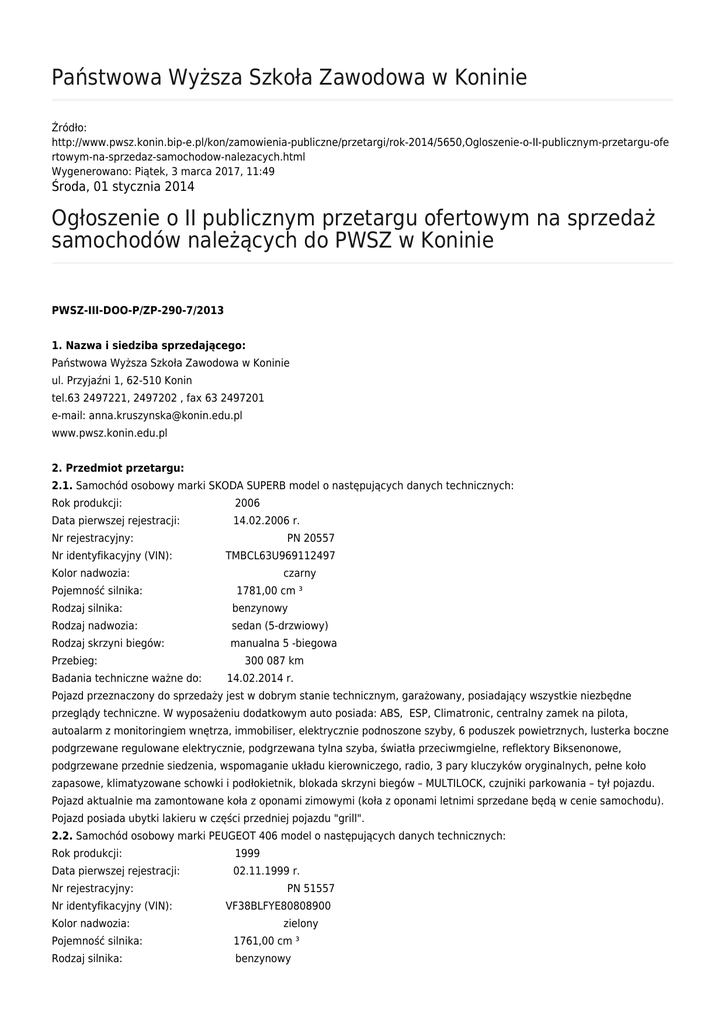 Państwowa Wyższa Szkoła Zawodowa w Koninie Źródło: http://www.pwsz.konin.bip-e.pl/kon/zamowienia-publiczne/przetargi/rok-2014/5650,Ogloszenie-o-II-publicznym-przetargu-ofe rtowym-na-sprzedaz-samochodow-nalezacych.html Wygenerowano: Piątek, 3 marca 2017, 11:49 Środa, 01 stycznia 2014 Ogłoszenie o II publicznym przetargu ofertowym na sprzedaż samochodów należących do PWSZ w Koninie PWSZ-III-DOO-P/ZP-290-7/2013 1. Nazwa i siedziba sprzedającego: Państwowa Wyższa Szkoła Zawodowa w Koninie ul. Przyjaźni 1, 62-510 Konin tel.63 2497221, 2497202 , fax 63 2497201 e-mail: [email protected] www.pwsz.konin.edu.pl 2. Przedmiot przetargu: 2.1. Samochód osobowy marki SKODA SUPERB model o następujących danych technicznych: Rok produkcji: 2006 Data pierwszej rejestracji: 14.02.2006 r. Nr rejestracyjny: Nr identyfikacyjny (VIN): PN 20557 TMBCL63U969112497 Kolor nadwozia: Pojemność silnika: czarny 1781,00 cm ³ Rodzaj silnika: benzynowy Rodzaj nadwozia: sedan (5-drzwiowy) Rodzaj skrzyni biegów: manualna 5 -biegowa Przebieg: Badania techniczne ważne do: 300 087 km 14.02.2014 r. Pojazd przeznaczony do sprzedaży jest w dobrym stanie technicznym, garażowany, posiadający wszystkie niezbędne przeglądy techniczne. W wyposażeniu dodatkowym auto posiada: ABS, ESP, Climatronic, centralny zamek na pilota, autoalarm z monitoringiem wnętrza, immobiliser, elektrycznie podnoszone szyby, 6 poduszek powietrznych, lusterka boczne podgrzewane regulowane elektrycznie, podgrzewana tylna szyba, światła przeciwmgielne, reflektory Biksenonowe, podgrzewane przednie siedzenia, wspomaganie układu kierowniczego, radio, 3 pary kluczyków oryginalnych, pełne koło zapasowe, klimatyzowane schowki i podłokietnik, blokada skrzyni biegów – MULTILOCK, czujniki parkowania – tył pojazdu. Pojazd aktualnie ma zamontowane koła z oponami zimowymi (koła z oponami letnimi sprzedane będą w cenie samochodu). Pojazd posiada ubytki lakieru w części przedniej pojazdu "grill". 2.2. Samochód osobowy marki PEUGEOT 406 model o następujących danych technicznych: Rok produkcji: 1999 Data pierwszej rejestracji: 02.11.1999 r. Nr rejestracyjny: Nr identyfikacyjny (VIN): Kolor nadwozia: PN 51557 VF38BLFYE80808900 zielony Pojemność silnika: 1761,00 cm ³ Rodzaj silnika: benzynowy Rodzaj nadwozia: sedan (5-drzwiowy) Rodzaj skrzyni biegów: manualna 5 -biegowa Przebieg: Badania techniczne ważne do: 259 757 km 25.11.2014 r. Pojazd przeznaczony do sprzedaży jest w dobrym stanie technicznym, garażowany, posiadający wszystkie niezbędne przeglądy techniczne. W wyposażeniu dodatkowym auto posiada: ABS, klimatyzację (niesprawna), centralny zamek na pilota, immobiliser, elektrycznie podnoszone szyby z przodu, 2 poduszki powietrzne, podgrzewana tylna szyba, wspomaganie układu kierowniczego, radio, 2 pary kluczyków oryginalnych. Pojazd aktualnie ma zamontowane koła z oponami zimowymi (koła z oponami letnimi sprzedane będą w cenie samochodu). 2.3. Samochód osobowy marki FS-LUBLIN ŻUK A0701B model o następujących danych technicznych: Rok produkcji: 1992 Data pierwszej rejestracji: 28.06.1993 r. Nr rejestracyjny: Nr identyfikacyjny (VIN): PKO F867 SUL070111N0560447 Kolor nadwozia: szary Pojemność silnika: 2120,00 cm ³ Rodzaj silnika: benzynowy Rodzaj skrzyni biegów: manualna 4 - biegowa Przebieg: Badania techniczne ważne do: 32 036 km (licznik biegnie drugi raz) 27.03.2014 r. Pojazd przeznaczony do sprzedaży wykazuje znaczny stopień zużycia, posiada liczne ślady korozji, przedstawia średni stan techniczny. Posiada sprawne wszystkie mechanizmy. Pojazd sprzedawany bez akumulatora, garażowany. Posiada radio oraz 2 pary oryginalnych kluczyków. 3. Tryb przetargu: pisemny przetarg ofertowy Oferta pod rygorem nieważności, powinna być sporządzona w formie pisemnej i musi zawierać następujące dane oferenta: 3.1. imię i nazwisko lub nazwę firmy, 3.2. miejsce zamieszkania (siedziba), 3.3. numer telefonu, 3.4. numer PESEL w przypadku podatników będących osobami fizycznymi objętymi rejestrem PESEL nieprowadzących działalności gospodarczej lub niebędących zarejestrowanymi podatnikami podatku od towarów i usług, NIP w przypadku pozostałych podmiotów podlegających obowiązkowi ewidencyjnemu, 3.5. datę sporządzenia oferty, 3.6. oferowaną cenę, 3.7. oświadczenie oferenta, że zapoznał się ze stanem technicznym pojazdu i warunkami przetargu. 4. Cena wywoławcza samochodów, stanowi ¾ ceny szacunkowej samochodu: 4.1. Cena wywoławcza samochodu marki SKODA SUPERB wynosi 16 368,75 zł (słownie złotych: szesnaście tysięcy trzysta sześćdziesiąt osiem zł 75/100). Cenę szacunkową ustalono na podstawie opinii o wartości rynkowej pojazdu sporządzonej przez uprawnionego rzeczoznawcę majątkowego. 4.2. Cena wywoławcza samochodu marki PEUGEOT 406 wynosi 3 324,75 zł (słownie złotych: trzy tysiące trzysta dwadzieścia cztery zł 75/100). Cenę szacunkową ustalono na podstawie opinii o wartości rynkowej pojazdu sporządzonej przez uprawnionego rzeczoznawcę majątkowego. 4.3. Cena wywoławcza samochodu marki FS-LUBLIN ŻUK A0701B wynosi 1 125,00 zł (słownie złotych: jeden tysiąc sto dwadzieścia pięć zł 00/100). Cenę szacunkową ustalono na podstawie opinii o wartości rynkowej pojazdu sporządzonej przez uprawnionego rzeczoznawcę majątkowego. Przedmiot przetargu jest zwolniony z podatku od towarów i usług na podstawie art. 43 ust.1, pkt 2 oraz ust. 2 Ustawy z dnia 11 marca 2004 roku o podatku od towarów i usług (Dz.U. z 2011, nr 177, poz.1054). Warunkiem przystąpienia do przetargu jest wniesienie wadium w wysokości: - Dla samochodu marki SKODA SUPERB – 1 636,88 zł (słownie złotych: jeden tysiąć sześćset trzydzieści sześć zł 88/100), - Dla samochodu marki PEUGEOT 406 – 332,48 zł (słownie złotych: trzysta trzydzieści dwa zł 48/100) - Dla samochodu marki FS-LUBLIB ŻUK A0701B – 112,50 zł (słownie złotych: sto dwanaście zł 50/100). Wadium n