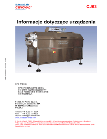 CJ63 © Sealed Air Corporation 2011, CJ63, EI_CJ63_PL_0108.fm Informacje dotyczące urządzenia SPIS TREŚCI: OPIS I PODSTAWOWE CECHY SCHEMAT ROZMIESZCZENIOWY DANE TECHNICZNE ZNAMIONOWE KONFIGURACJA Sealed Air Polska Sp.zo.o. Duchnice, ul. Ożarowska 28A 05-850 Ożarów Mazowiecki POLSKA Telefon: +48 (0)22 731 5901 Fax: +48 (0)22 722 4606 [email protected] www.sealedair-emea.com ® Reg. U.S. Pat. & TM Off. © Sealed Air Corporation 2011. Wszystkie prawa zastrzeżone. Wydrukowano w Szwajcarii. “9 Dot Logo” oraz “Sealed Air” są zarejestrowanymi znakami towarowymi Sealed Air Corporation (US). Żadna część niniejszej publikacji nie może być powielana lub przekazywana stronom trzecim bez uprzedniej pisemnej zgody Sealed Air Corporation. 1 Opis i podstawowe cechy 1.1 Opis CRYOVAC® CJ63 stanowi obkurczarkę tunelową wykorzystującą gorące powietrze, skonstruowaną specjalnie do eksploatacji w trybie pracy in-line z wyspecjalizowanymi maszynami pakującymi i zgrzewającymi w technice HFFS (horizontal-form-fillseal) pracującymi z foliami termokurczliwymi barierowymi typu BDF. Maszyna CJ63 zapewnia optymalny wygląd opakowań o zmodyfikowanej atmosferze wewnętrznej wykorzystujących folię termokurczliwą barierową CRYOVAC BDF®, a także folie termokurczliwe niebarierowe, np. stosowane przy pakowaniu pizzy. Na obkurczarce CJ63 dostępne są dwa różne profile kołpaka zależnie od zastosowań: – - jeden specjalnie do produktów na tackach – - jeden specjalnie do produktów bez tacek Produkty są transportowane do tunelu na przenośniku wałkowym wyposażonym w wałki z powłoką silikonową, co zapewnia równomierne doprowadzanie gorącego powietrza do spodu produktów, gwarantując jednolity wynik obkurczania na całej powierzchni produktu. Połączenie przepływu gorącego powietrza w obrębie każdego stanowiska nadmuchowego z regulowaną prędkością przenośnika zapewnia jednolite wyniki obkurczania z uzyskaniem opakowań o wymaganym, estetycznym wyglądzie. Wentylator chłodzący usytuowany na wlocie i wylocie tunelu tworzy kurtynę powietrzną, co zapobiega uwalnianiu gorącego powietrza z tunelu obkurczającego do pomieszczenia produkcyjnego. Wylotowy wentylator chłodzący usytuowany przy końcu tunelu zapewnia chłodzenie opakowań, umożliwiając ich szybkie i bezpieczne odbieranie. Konstrukcja maszyny jest prosta i solidna. Wszystkie krytyczne części maszyny zostały zabezpieczone przed środowiskiem o działaniu korozyjnym, często występującym w pomieszczeniach mieszczących instalacje przetwórcze i linie pakowania produktów spożywczych. Maszyna została skonstruowana w sposób ergonomiczny, z myślą o bezpieczeństwie i higienie, jest prosta w obsłudze, łatwa do utrzymania w czystości i niekłopotliwa w konserwacji. Spełnia ona także wszystkie istotne wymagania zawarte w przepisach Unii Europejskiej, dotyczących bezpieczeństwa i higieny. 2 © Sealed Air Corporation 2011, CJ63, EI_CJ63_PL_0108.fm Obkurczarka CJ63 dostosowana do szerokiego zakresu produktów jest wyposażona w trzy niezależne stanowiska nadmuchu powietrza (kołpaki), w których można uzyskać różne poziomy temperatury powietrza, od temperatury otoczenia do 220°C. 1.2 Główne cechy • • • • • • • • © Sealed Air Corporation 2011, CJ63, EI_CJ63_PL_0108.fm • • • • Maszyna nie wymaga obsługi przez operatora (wymagana jest jedynie obecność osoby nadzorującej pracę maszyny) Proces ciągły Elektroniczna regulacja temperatury zapewniająca uzyskanie stałych i powtarzalnych wyników Regulowany przepływ powietrza dla dostosowania do różnorodnych zastosowań Lampka ostrzegawcza wskazująca wystąpienie nieprawidłowości w pracy silnika napędzającego przenośnik lub silnika wentylatora – wczesne ostrzeganie o możliwości wystąpienia awarii Przenośnik o regulowanej prędkości Doskonałe osiągi obkurczania przez zastosowanie trzech oddzielnych stanowisk (kołpaków) nadmuchu gorącego powietrza Funkcja zatrzymania – z chwilą zakończenia produkcji, kurtyny powietrzne zostają wyłączone, podczas gdy przenośnik pracuje nadal dla zapewnienia lepszego i szybszego chłodzenia (zanim przenośnik taśmowy zatrzyma się musi upłynąć czas chłodzenia) Pokrywa z blokadą oraz system sterowania odporny na uszkodzenia o kategorii bezpieczeństwa 1, zapewniający bezpieczeństwo systemu zgodne z aktualnym stanem techniki Konstrukcja uwzględniająca wymogi higieniczne dla zapewnienia łatwości i skuteczności czyszczenia Dobry dostęp umożliwiający wygodne wykonanie czynności konserwacji, np. pokrywa na zawiasach umożliwiająca dostęp do wnętrza tunelu oraz zdejmowane płyty osłonowe. Solidna konstrukcja wysokiej jakości wykonana całkowicie z materiałów dopuszczonych do wykorzystania w praktyce przetwórstwa spożywczego 3 Schemat rozmieszczeniowy © Sealed Air Corporation 2011, CJ63, EI_CJ63_PL_0108.fm 2 Rys. 2-1, Schemat rozmieszczeniowy 4 3 Dane techniczne znamionowe 3.1 Wymiary maszyny Długość, szerokość i wysokość 3.2 patrz schemat rozmieszczeniowy maszyny Masa ok. 350 kg Media robocze 3.3.1 Zasilanie elektryczne © Sealed Air Corporation 2011, CJ63, EI_CJ63_PL_0108.fm 3.3 Zasilanie Liczba faz Częstotliwość Godzinowe zużycie energii elektrycznej (średnie) Moc zainstalowana Zabezpieczenie prądowe 3.4 Charakterystyki robocze 3.4.1 Wymiary produktu Długość Maks. szerokość Maks. wysokość Masa 3.4.2 Wersja na kraje Europy 400 V 3 + ziemia 50 Hz 10 kWh Wersja US (na życzenie) 440 V 3 + ziemia 60 Hz 10 kWh 18 kW 32 A 18 kW 32 A nieograniczona 370 mm 150 mm od 0,05 kg do 15 kg Dane funkcjonalne Temperatura obkurczania folii Czas nagrzewania Szybkość robocza Poziom hałasu Liczba operatorów 5 do 220°C 20 - 30 min od 15° do temperatury roboczej 7 m/min - 28 m/min 72 dB (A) na stanowisku pracy operatora 1 operator do nadzoru pracy maszyny 4 Konfiguracja 4.1 Standard • • • • • • 4.2 Wersje • • • 