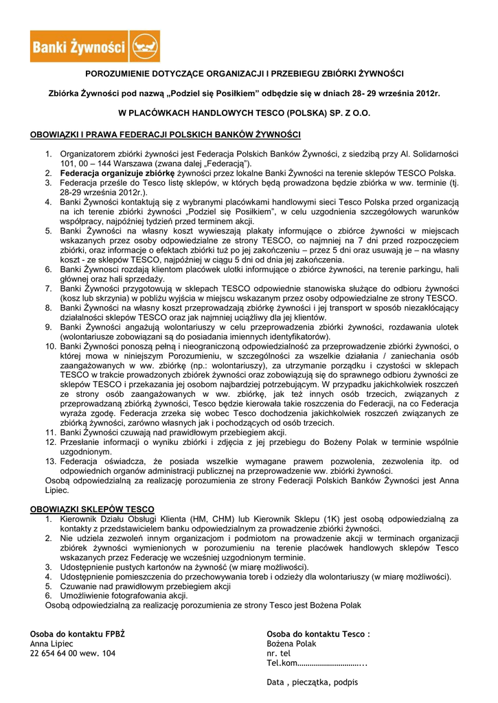 POROZUMIENIE DOTYCZĄCE ORGANIZACJI I PRZEBIEGU ZBIÓRKI ŻYWNOŚCI Zbiórka Żywności pod nazwą „Podziel się Posiłkiem” odbędzie się w dniach 28- 29 września 2012r. W PLACÓWKACH HANDLOWYCH TESCO (POLSKA) SP. Z O.O. OBOWIĄZKI I PRAWA FEDERACJI POLSKICH BANKÓW ŻYWNOŚCI 1. Organizatorem zbiórki żywności jest Federacja Polskich Banków Żywności, z siedzibą przy Al. Solidarności 101, 00 – 144 Warszawa (zwana dalej „Federacją”). 2. Federacja organizuje zbiórkę żywności przez lokalne Banki Żywności na terenie sklepów TESCO Polska. 3. Federacja prześle do Tesco listę sklepów, w których będą prowadzona będzie zbiórka w ww. terminie (tj. 28-29 września 2012r.). 4. Banki Żywności kontaktują się z wybranymi placówkami handlowymi sieci Tesco Polska przed organizacją na ich terenie zbiórki żywności „Podziel się Posiłkiem”, w celu uzgodnienia szczegółowych warunków współpracy, najpóźniej tydzień przed terminem akcji. 5. Banki Żywności na własny koszt wywieszają plakaty informujące o zbiórce żywności w miejscach wskazanych przez osoby odpowiedzialne ze strony TESCO, co najmniej na 7 dni przed rozpoczęciem zbiórki, oraz informacje o efektach zbiórki tuż po jej zakończeniu – przez 5 dni oraz usuwają je – na własny koszt - ze sklepów TESCO, najpóźniej w ciągu 5 dni od dnia jej zakończenia. 6. Banki Żywnosci rozdają klientom placówek ulotki informujące o zbiórce żywności, na terenie parkingu, hali głównej oraz hali sprzedaży. 7. Banki Żywności przygotowują w sklepach TESCO odpowiednie stanowiska służące do odbioru żywności (kosz lub skrzynia) w pobliżu wyjścia w miejscu wskazanym przez osoby odpowiedzialne ze strony TESCO. 8. Banki Żywności na własny koszt przeprowadzają zbiórkę żywności i jej transport w sposób niezakłócający działalności sklepów TESCO oraz jak najmniej uciążliwy dla jej klientów. 9. Banki Żywności angażują wolontariuszy w celu przeprowadzenia zbiórki żywności, rozdawania ulotek (wolontariusze zobowiązani są do posiadania imiennych identyfikatorów). 10. Banki Żywności ponoszą pełną i nieograniczoną odpowiedzialność za przeprowadzenie zbiórki żywności, o której mowa w niniejszym Porozumieniu, w szczególności za wszelkie działania / zaniechania osób zaangażowanych w ww. zbiórkę (np.: wolontariuszy), za utrzymanie porządku i czystości w sklepach TESCO w trakcie prowadzonych zbiórek żywności oraz zobowiązują się do sprawnego odbioru żywności ze sklepów TESCO i przekazania jej osobom najbardziej potrzebującym. W przypadku jakichkolwiek roszczeń ze strony osób zaangażowanych w ww. zbiórkę, jak też innych osób trzecich, związanych z przeprowadzaną zbiórką żywności, Tesco będzie kierowała takie roszczenia do Federacji, na co Federacja wyraża zgodę. Federacja zrzeka się wobec Tesco dochodzenia jakichkolwiek roszczeń związanych ze zbiórką żywności, zarówno własnych jak i pochodzących od osób trzecich. 11. Banki Żywności czuwają nad prawidłowym przebiegiem akcji. 12. Przesłanie informacji o wyniku zbiórki i zdjęcia z jej przebiegu do Bożeny Polak w terminie wspólnie uzgodnionym. 13. Federacja oświadcza, że posiada wszelkie wymagane prawem pozwolenia, zezwolenia itp. od odpowiednich organów administracji publicznej na przeprowadzenie ww. zbiórki żywności. Osobą odpowiedzialną za realizację porozumienia ze strony Federacji Polskich Banków Żywności jest Anna Lipiec. OBOWIĄZKI SKLEPÓW TESCO 1. Kierownik Działu Obsługi Klienta (HM, CHM) lub Kierownik Sklepu (1K) jest osobą odpowiedzialną za kontakty z przedstawicielem banku odpowiedzialnym za prowadzenie zbiórki żywności. 2. Nie udziela zezwoleń innym organizacjom i podmiotom na prowadzenie akcji w terminach organizacji zbiórek żywności wymienionych w porozumieniu na terenie placówek handlowych sklepów Tesco wskazanych przez Federację we wcześniej uzgodnionym terminie. 3. Udostępnienie pustych kartonów na żywność (w miarę możliwości). 4. Udostępnienie pomieszczenia do przechowywania toreb i odzieży dla wolontariuszy (w miarę możliwości). 5. Czuwanie nad prawidłowym przebiegiem akcji 6. Umożliwienie fotografowania akcji. Osobą odpowiedzialną za realizację porozumienia ze strony Tesco jest Bożena Polak Osoba do kontaktu FPBŻ Anna Lipiec 22 654 64 00 wew. 104 Osoba do kontaktu Tesco : Bożena Polak nr. tel Tel.kom…………………………... Data , pieczątka, podpis