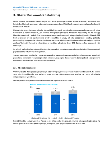 Grupa BRE Banku SA Raport roczny 2012 Sprawozdanie Zarządu z działalności Grupy BRE Banku w 2012 roku X. Obszar Bankowości Detalicznej Model biznesu bankowości detalicznej w 2012 roku oparty był na kilku markach (mBank, MultiBank oraz Private Banking), ale począwszy od początku 2012 roku mBank i MultiBank prezentowane są jako „Bankowość Detaliczna w Polsce”. Historycznie, grupę docelową mBanku stanowili ludzie młodzi, samodzielni, poszukujący alternatywnych usług bankowych o niskich kosztach, jak również mikroprzedsiębiorstwa. MultiBank nastawiony był na obsługę klientów zamożnych i małych firm, poszukujących spersonalizowanych usług najwyższej jakości. Obecnie BRE Bank prowadzi proces ujednolicenia oferty produktów i usług, tak aby zaspokojone zostały potrzeby poszczególnych segmentów klientów detalicznych w ramach jednej marki bankowości detalicznej pod szyldem „mBank” (więcej informacji o rebrandingu w rozdziale „Strategia Grupy BRE Banku na lata 2012-2016 i jej realizacja”). Co więcej, najbardziej zamożnym klientom oferowana jest szeroka gama produktów i strategii inwestycyjnych poprzez spółkę BRE Wealth Management. Szeroki asortyment produktów i usług oferowany jest poprzez zintegrowaną platformę internetową. Model taki pozwala na oferowanie różnym segmentom klientów usług lepiej dopasowanych do ich potrzeb i jest głównym czynnikiem wspierającym stały wzrost liczby klientów. X.1. Klienci detaliczni detaliczni Od kilku lat BRE Bank pozostaje rynkowym liderem w pozyskiwaniu nowych klientów detalicznych. Na koniec 2012 roku liczba klientów była wyższa o 209,4 tys. (+5,3%) w stosunku do grudnia 2011 roku, a ich liczba osiągnęła ponad 4,1 miliona. Wykres przedstawia przyrost liczby klientów detalicznych w ostatnich latach. Pośród klientów obsługiwanych w Polsce są nie tylko osoby fizyczne, ale również mikroprzedsiębiorstwa. Na koniec grudnia 2012 roku było ich 426 tys., z czego 16,3 tys. (+4,0%) pozyskano w 2012 roku. Grupa BRE Banku SA Raport roczny 2012 Sprawozdanie Zarządu z działalności Grupy BRE Banku w 2012 roku X.2. Oferta produktowa Dane przedstawione w rozdziale X.2. oparte są na wewnętrznej informacji zarządczej BRE Banku. Depozyty i fundusze inwestycyjne Poprzez „supermarket funduszy” klienci BRE Banku mogą nabywać zarówno jednostki krajowych jaki i zagranicznych funduszy inwestycyjnych, a także produkty finansowe dopasowane do indywidualnych kryteriów inwestycyjnych, oferowane przez zewnętrznych dostawców. Poniższe wykresy przedstawiają w sposób szczegółowy zmiany w poziomie depozytów i środków ulokowanych w funduszach inwestycyjnych. Na koniec grudnia 2012 roku stan depozytów bankowości detalicznej wyniósł 33 856 mln zł, o 7,5 mld zł, tj. 28,5% więcej niż na koniec 2011 roku, natomiast aktywa klientów w funduszach inwestycyjnych zwiększyły się o 72 mln zł (i osiągnęły poziom 2 597 mln zł). Kredyty Wartość kredytów brutto udzielonych w obszarze Bankowości Detalicznej w Polsce, Czechach i na Słowacji na koniec grudnia 2012 roku wyniosła 37 266 mln zł i w stosunku do końca 2011 roku zmalała o 830 mln zł, tj. 2,2%. Na koniec 2012 roku struktura kredytów detalicznych w Polsce przedstawiała się następująco: kredyty niehipoteczne 16,6% Grupa BRE Banku SA Raport roczny 2012 Sprawozdanie Zarządu z działalności Grupy BRE Banku w 2012 roku Kredyty hipoteczne dla osób fizycznych w Polsce według stanu na dzień 31 grudnia 2011 i 2012 roku charakteryzowały następujące wielkości: Kredyty hipoteczne dla osób fizycznych 31.12.2011 31.12.2012 Wartość bilansowa (mld zł) 29,0 27,2 Średnia zapadalność (lata) 22,3 21,6 Średnia wartość (tys. zł) 306,9 280,9 Średnie LTV (%) 86,3% 79,4% 1,2% 1,8% NPL Portfel kredytów niehipotecznych wzrósł w 2012 roku o 1 073 mln zł, tj. 14,9%. Najszybciej przyrastały kredyty gotówkowe i w liniach kredytowych, w wyniku rosnącego korzystania przez istniejących klientów z przyznanych im limitów globalnych. Wzrost wskaźnika NPL dla kredytów hipotecznych w 2012 roku spowodowany był zmniejszeniem portfela kredytów hipotecznych oraz naturalnym procesem jego starzenia. Poniższe wykresy przedstawiają szczegółowe zmiany w poziomie kredytów klientów detalicznych BRE Banku: Karty BRE Bank utrzymuje wysoką dynamikę w zakresie emisji kart, zarówno kredytowych, jak i debetowych, wspartą popytem ze strony dotychczasowych i nowych klientów. Na koniec grudnia 2012 roku liczba wydanych kart kredytowych wyniosła 701,9 tys. i była wyższa o 71,4 tys. niż rok wcześniej. Liczba wydanych przez BRE Bank kart debetowych na koniec grudnia 2012 roku wyniosła 4 783,5 tys. W okresie 12 miesięcy przybyło 793,3 tys. kart, tj. 19,9%. BRE Bank kładzie duży nacisk na innowacje i rozszerzanie zakresu oferowanych kart. Przykładem mogą być nowe inicjatywy związane z kartami płatniczymi (debetowymi i przedpłaconymi), pełniącymi kilka funkcji (np. Bydgoska Karta Miejska będąca biletem okresowym oraz elektronicznym portfelem). Usługi maklerskie i ubezpieczeniowe W 2012 roku liczba klientów korzystających z usług maklerskich była stabilna. W mBanku w ramach usługi eMakler klienci prowadzili 202,1 tys. rachunków inwestycyjnych, o 1,5 tys. więcej niż na koniec 2011 roku. Grupa BRE Banku SA Raport roczny 2012 Sprawozdanie Zarządu z działalności Grupy BRE Banku w 2012 roku W MultiBanku klienci posiadali 32,2 tys. rachunków, tj. 0,6 tys. mniej niż w 2011 roku, prowadzonych w ramach Usługi Maklerskiej. Dodatkowo, Dom Inwestycyjny BRE Banku udostępnił klientom jedną z najnowocześniejszych na rynku platform do inwestowania na rynku Forex – BRE Forex ECN. Kwotowania dostarczane są nie przez brokera, lecz przez banki, które wyznaczają oferty kupna i sprzedaży par walutowych. Korzystając z BRE Forex ECN klienci mogą inwestować nie tylko w waluty, ale również w kontrakty terminowe. DI