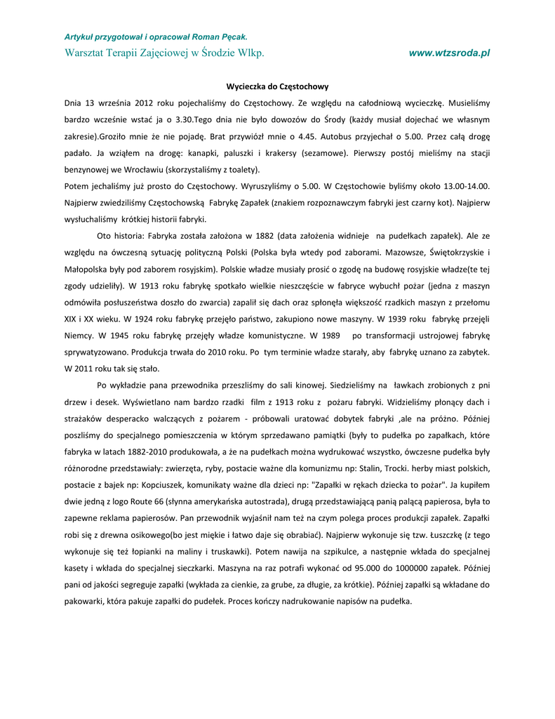 Artykuł przygotował i opracował Roman Pęcak. Warsztat Terapii Zajęciowej w Środzie Wlkp. www.wtzsroda.pl Wycieczka do Częstochowy Dnia 13 września 2012 roku pojechaliśmy do Częstochowy. Ze względu na całodniową wycieczkę. Musieliśmy bardzo wcześnie wstać ja o 3.30.Tego dnia nie było dowozów do Środy (każdy musiał dojechać we własnym zakresie).Groziło mnie że nie pojadę. Brat przywiózł mnie o 4.45. Autobus przyjechał o 5.00. Przez całą drogę padało. Ja wziąłem na drogę: kanapki, paluszki i krakersy (sezamowe). Pierwszy postój mieliśmy na stacji benzynowej we Wrocławiu (skorzystaliśmy z toalety). Potem jechaliśmy już prosto do Częstochowy. Wyruszyliśmy o 5.00. W Częstochowie byliśmy około 13.00-14.00. Najpierw zwiedziliśmy Częstochowską Fabrykę Zapałek (znakiem rozpoznawczym fabryki jest czarny kot). Najpierw wysłuchaliśmy krótkiej historii fabryki. Oto historia: Fabryka została założona w 1882 (data założenia widnieje na pudełkach zapałek). Ale ze względu na ówczesną sytuację polityczną Polski (Polska była wtedy pod zaborami. Mazowsze, Świętokrzyskie i Małopolska były pod zaborem rosyjskim). Polskie władze musiały prosić o zgodę na budowę rosyjskie władze(te tej zgody udzieliły). W 1913 roku fabrykę spotkało wielkie nieszczęście w fabryce wybuchł pożar (jedna z maszyn odmówiła posłuszeństwa doszło do zwarcia) zapalił się dach oraz spłonęła większość rzadkich maszyn z przełomu XIX i XX wieku. W 1924 roku fabrykę przejęło państwo, zakupiono nowe maszyny. W 1939 roku fabrykę przejęli Niemcy. W 1945 roku fabrykę przejęły władze komunistyczne. W 1989 po transformacji ustrojowej fabrykę sprywatyzowano. Produkcja trwała do 2010 roku. Po tym terminie władze starały, aby fabrykę uznano za zabytek. W 2011 roku tak się stało. Po wykładzie pana przewodnika przeszliśmy do sali kinowej. Siedzieliśmy na ławkach zrobionych z pni drzew i desek. Wyświetlano nam bardzo rzadki film z 1913 roku z pożaru fabryki. Widzieliśmy płonący dach i strażaków desperacko walczących z pożarem - próbowali uratować dobytek fabryki ,ale na próżno. Później poszliśmy do specjalnego pomieszczenia w którym sprzedawano pamiątki (były to pudełka po zapałkach, które fabryka w latach 1882-2010 produkowała, a że na pudełkach można wydrukować wszystko, ówczesne pudełka były różnorodne przedstawiały: zwierzęta, ryby, postacie ważne dla komunizmu np: Stalin, Trocki. herby miast polskich, postacie z bajek np: Kopciuszek, komunikaty ważne dla dzieci np: "Zapałki w rękach dziecka to pożar". Ja kupiłem dwie jedną z logo Route 66 (słynna amerykańska autostrada), drugą przedstawiającą panią palącą papierosa, była to zapewne reklama papierosów. Pan przewodnik wyjaśnił nam też na czym polega proces produkcji zapałek. Zapałki robi się z drewna osikowego(bo jest miękie i łatwo daje się obrabiać). Najpierw wykonuje się tzw. Łuszczkę (z tego wykonuje się też łopianki na maliny i truskawki). Potem nawija na szpikulce, a następnie wkłada do specjalnej kasety i wkłada do specjalnej sieczkarki. Maszyna na raz potrafi wykonać od 95.000 do 1000000 zapałek. Później pani od jakości segreguje zapałki (wykłada za cienkie, za grube, za długie, za krótkie). Później zapałki są wkładane do pakowarki, która pakuje zapałki do pudełek. Proces kończy nadrukowanie napisów na pudełka. Artykuł przygotował i opracował Roman Pęcak. Warsztat Terapii Zajęciowej w Środzie Wlkp. www.wtzsroda.pl Po zwiedzeniu fabryki, obejrzeniu filmu, dokonaniu zakupów wyszliśmy na dwór, wsiedliśmy do autokaru i ruszyliśmy na Jasną Górę. Gdy byliśmy na miejscu weszliśmy do bazyliki obejrzeć wizerunek Najświętszej Maryi Panny Matki Bożej Częstochowskiej. ze słynnymi ciętymi rysami. A oto historia rys: działo się to w czasie potopu szwedzkiego w 1655 roku. Pewien szwedzki żołnierz za pomocą wozu chłopskiego ukradł wizerunek Maryi, następnie chcąc go zniszczyć wyjął szablę i roztrzaskał szkło obrazu. Nagle stało się coś dziwnego na twarzy Maryi pojawiły się cięte rysy ,które zaczęły krwawić. Przerażony żołnierz porzucił wizerunek w pobliskim sianie. Przypadkowo tamtędy przechodził Paulin ,ze zgromadzenia Paulinów, którzy mieli w pobliżu siedzibę. Zabrał wizerunek Maryi na Jasną Górę. Od tego czasu wizerunek Maryi przebywa na Jasnej Górze. Później przeszliśmy do kaplicy ,gdzie odbywał się koncert organowy, później przeszliśmy do kaplicy głównej z wizerunkiem Maryi. Obraz ze względu na swoją wartość przechowywany jest za specjalną złotą zasłoną. Odsłaniany jest tylko w trakcie Apelu Jasnogórskiego o 21.00,transmitowanego przez Radio Maryja i telewizję Trwam. Oglądany tylko przez specjalną kratę. Można tylko się tam dostać chodząc na klęcząco wokół ołtarza, który mieści się w pobliżu wizerunku. Tego dnia, gdy my byliśmy na wycieczce nabożeństwo w języku angielskim miała grupa amerykańska, później przyszła grupa francuska. Później zeszliśmy do skarbca. W skarbcu widzieliśmy wota (przedmioty, które wierni zostawiają w celu ochrony przed chorobą, złym urokiem, kalectwem.). Było tam pełno biżuterii. brylantów, diamentów z przełomu XVII-XIX wieku. Laski, kule (wota) od ludzi wyleczonych z kalectwa pod wpływem modlitwy, watykańskie monety (na cześć każdego nowo wybranego papieża Mennica Watykańska wybijała nowe okolicznościowe monety, takie monety też wybito na cześć Jana Pawła II). Były też różne ornaty, Sukienka Najświętszej Maryi Panny podarowana Sanktuarium Jasnogórskiemu. Były też: berło Kazimierza Wielkiego i różaniec królowej Bony. Po zwiedzaniu ekspozycji dokonaliśmy zakupów pamiątek(ja kupiłem drewniany różaniec i wizerunek Jasnogórskiej Pani na drewnie). Po zwiedzaniu wyszliśmy na dwór. Przed wejściem do skarbca stoi pomnik papie