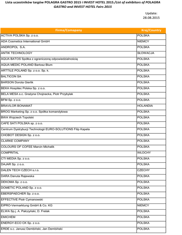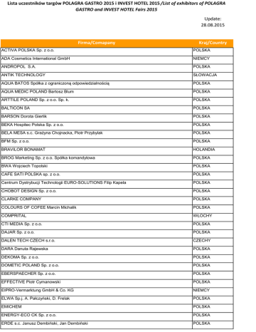Lista uczestników targów POLAGRA GASTRO 2015 i INVEST HOTEL 2015 /List of exhibitors of POLAGRA GASTRO and INVEST HOTEL Fairs 2015 Update: 28.08.2015 Firma/Comapany Kraj/Country ACTIVA POLSKA Sp. z o.o. POLSKA ADA Cosmetics International GmbH NIEMCY ANDROPOL S.A. POLSKA ANTIK TECHNOLOGY SŁOWACJA AQUA BATOS Spółka z ograniczoną odpowiedzialnością POLSKA AQUA MEDIC POLAND Bartosz Blum POLSKA ARTTILE POLAND Sp. z o.o. Sp. k. POLSKA BALTICON SA POLSKA BARSON Dorota Gierlik POLSKA BEKA Hospitec Polska Sp. z o.o. POLSKA BELA MESA s.c. Grażyna Chojnacka, Piotr Przybylak POLSKA BFM Sp. z o.o. POLSKA BRAVILOR BONAMAT HOLANDIA BROG Marketing Sp. z o.o. Spółka komandytowa POLSKA BWA Wojciech Topolski POLSKA CAFE SATI POLSKA sp. z o.o. POLSKA Centrum Dystrybucji Technologii EURO-SOLUTIONS Filip Kapela POLSKA CHOBOT DESIGN Sp. z o.o. POLSKA CLARKE COMPANY POLSKA COLOURS OF COFEE Marcin Michalik POLSKA COMPRITAL WŁOCHY CTI MEDIA Sp. z o.o. POLSKA DAJAR Sp. z o.o. POLSKA DALEN TECH CZECH s.r.o. CZECHY DARA Danuta Rajewska POLSKA DEKOMA Sp. z o.o. POLSKA DOMETIC POLAND Sp. z o.o. POLSKA EBERSPAECHER Sp. z o.o. POLSKA EFFECTIVE Piotr Cymanowski POLSKA EIPRO-Vermarktung GmbH & Co. KG NIEMCY ELWA Sp.j. A. Pałczyński, D. Frelak POLSKA EMICHEM POLSKA ENERGY-ECO CK Sp. z o.o. POLSKA ERDE s.c. Janusz Dembiński, Jan Dembiński POLSKA ETOL-Werk Eberhard Tripp GmbH & Co. OHG NIEMCY EURO-SYSTEM POLSKA Evolution Home Wojciech Kosmowski POLSKA Fabryka Mebli Okrętowych FAMOS Sp. z o.o. POLSKA FAMEG Spółka z o.o. POLSKA Firma BAJA Jacek Konderak POLSKA Firma Handlowa MAZUR Andrzej Mazur POLSKA Firma STOL-MEB Michał Wiewióra POLSKA Forum Media Polska Sp. z o.o. POLSKA FPH PROGRESJA T. W. R. Walentynowicz Sp.j. POLSKA FPHU RODRO Andrzej Drożniak POLSKA FUSION GUSTO Natalia Lewandowska POLSKA GALSOFT - SERVICE Ltd. UKRAINA GRAPIL Grażyna Sobieraj Sp.j. POLSKA GRIFFINE ENDUCTION - COTTING FRANCJA GRUPA AMBER Artur i Aneta Dudek Sp. j. POLSKA HENDI POLSKA Sp. z o.o. POLSKA Instytut Rynku Hotelarskiego M. Dolecka Spółka jawna POLSKA INTER-PLAST Z.Bodziachowska-Kluza Sp.j. POLSKA JMB Spółka z o.o. POLSKA KASO Tadeusz Krawczyk POLSKA KOMAT Mieczysław Kozłowski POLSKA KOREE Sp. z o.o. POLSKA KROSNO METAL Sp. z o.o. POLSKA Krośnieńskie Huty Szkła KROSNO S.A. POLSKA La Vita Sana Sp. z o.o. POLSKA LEGE ARTIS Anna Dubieniecka-Suszek POLSKA LORIEN GROUP sp. z o.o. sp.k. POLSKA MAGOD Łukasz Karolak POLSKA MaisondeRome INTERIOR DESIGN POLSKA MARATHON Barbara Jakubowska POLSKA MM BROWN POLSKA Sp. z o.o Sp.k. POLSKA MM-PREMIUM Małgorzata Mrówczyńska POLSKA MODERN LIGHTING Krzysztof Szyszka POLSKA Morello Forni S.a.s. WŁOCHY MR.HASH Piotr Terlikowski POLSKA MULTIVAC Sp. z o.o. POLSKA Nakielskie Zakłady Maszyn i Urządzeń Gastronomicznych SPOMASZ - NAKŁO Sp. z o.o. POLSKA NORDZUCKER POLSKA SA POLSKA NOTI Sp. z o.o. POLSKA P.H.U. INTERSUN Rafał Marut POLSKA PAGED MEBLE S.A. POLSKA Petit Forestier Polska Sp. z o.o. POLSKA PFLEIDERER GRAJEWO S.A. POLSKA PHU KANDELA Paweł Stachowski POLSKA PHUP Wiesław Zajączek POLSKA PLASTMET Spółka z ograniczoną odpowiedzialnością spółka komandytowa POLSKA Polskie Wydawnictwa Specjalistyczne PROMEDIA Sp. z o.o. POLSKA PRIMULATOR Sp. z o.o. POLSKA PRO ASCOBLOC Sp. z o.o. POLSKA PROFITROOM Sp. z o.o. POLSKA PROJEKT HOTEL sp. z o.o. POLSKA Przedsiębiorstwo Budowlane SPEC - BUD Sp. z o.o. POLSKA Przedsiębiorstwo Handlowo-Usługowe CHEMAN Anna Rogozińska POLSKA RATIONAL Sp. z o.o. POLSKA RIDEX DEKORACJA Sp. z o.o. Sp.k. POLSKA RM GASTRO POLSKA Sp. z o.o. POLSKA ROBOT-COUPE FRANCJA ROTR Spółdzielnia Mleczarska w Rypinie POLSKA RTM Sport Sp. z o.o. POLSKA SALTO POLSKA ScanBox Thermo Products AB SZWECJA SCM sp. z o.o. POLSKA SETART WNĘTRZA POLSKA SIGIS Grzegorz Sikora POLSKA SIMCOM Maciej Idaszak POLSKA SOFTECH Sp. z o.o. POLSKA SPA Sp. z o.o. POLSKA STALGAST Sp. z o.o. POLSKA TECH Sp. z o.o. POLSKA TENZI Sp. z o.o. POLSKA TRILOGIQ POLAND Sp. z o.o. POLSKA UAB ASA PREKYBA LITWA UAB SOFTLINES LITWA UNILEVER POLSKA Sp. z o.o. POLSKA VFP Communications Ltd Sp. z o.o. POLSKA WINTERHALTER GASTRONOM POLSKA Sp. z o.o. POLSKA WIPETECH POLSKA Sp. z o.o. Spółka Komandytowa POLSKA Władysław Brzeziński Ma Foi! POLSKA WODA BONART-POZNAŃ Anita Dyzert POLSKA PRO-WELLNESS POLSKA SYSTEM Sp. z o.o. POLSKA METRO-PLAST Paweł Klimas, Anna Andruszkiewicz Sp.j. POLSKA FCA POLAND S.A POLSKA CARVER s.r.l. WŁOCHY EGZOLLOOR POLSKA HID ULTRAVIOLET LLC USA SADECHAF UV BVBA BELGIA STOLBUD Włoszczowa SA POLSKA HOBART GmbH NIEMCY MR GASTRO STAL s.c. POLSKA PRIMAX WŁOCHY RENEHA FRANCJA SMEG WŁOCHY TECNOINOX SLR WŁOCHY FUTURE PRODUCTS GROUP LIMITED NOWA ZELANDIA THE SALVAJOR COMPANY USA HOBART GmbH NIEMCY THE VOLLRATTH CO., L.L.C. USA OY HALTON GROUP LTD FINLANDIA CMA MACCHINE PER CAFFE S.R.L. WŁOCHY GERLAND COMMERCIAL RANGES LTD USA TOUCH AND EAT POLSKA HORECALINK.PL POLSKA BMW Vertriebs GmbH Sp. z o.o NIEMCY