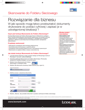Skanowanie do Folderu Sieciowego Rozwiązanie dla biznesu W jaki sposób mogę łatwo przekształcić dokumenty drukowane do postaci cyfrowej i zapisać je w udostępnionej lokalizacji ? Czym jest funkcja Skanowania do Folderu Sieciowego? Funkcja Skanowania do Folderu Sieciowego Scan to Network) to wydajna i łatwa metoda przekształcania dokumentów papierowych do postaci cyfrowej i zapisywania ich w predefiniowanej lokalizacji w udostępnionym folderze sieciowym. Ułatwia to automatyczną konwersję procesów zarządzania dokumentami. Przykłady zastosowań • Wewnętrzne zarządzanie dokumentacją elektroniczną • Scentralizowana archiwizacja w systemie plików • Zarządzanie dokumentacją elektroniczną w kancelariach prawniczych • Skanowanie na żądanie reklam, broszur, rachunków itp. Jak działa funkcja Skanowania do Folderu Sieciowego? Drukuj mniej i oszczędzaj Oszczędzaj czas Zautomatyzowane rozwiązanie Skanowania do Folderu Sieciowego ułatwia zarządzanie plikami i zmniejsza ryzyko wystąpienia błędów. Oszczędzaj przestrzeń Zredukuj konieczność przechowywania w biurze papierowych dokumentów, uniknij zapełniania swojej skrzynki pocztowej zeskanowanymi dokumentami. 1. Lexmark Expert Partnerzy mogą uzyskać dostęp do Wirtualnego Centrum Rozwiązań Lexmark i pobrać aplikację. 2. Zainstaluj aplikację Skanowania do Folderu Sieciowego. (Przeczytaj podręcznik instalacji dostępny na stronie www.) 3. Wybierz ikonę Skanowania do Folderu Sieciowego w interfejsie eTask. 4. Wybierz dla dokumentu docelowy folder sieciowy (np. dysk H:). 5. Zdefiniuj nazwę i ustawienia dokumentu. 6. Wybierz „Skanuj”, aby przesłać dokument w postaci cyfrowej do folderu sieciowego. Dane techniczne urządzenia mogą zostać zmienione bez powiadomienia. Lexmark i Lexmark ze znakiem rombu są znakami towarowymi firmy Lexmark International, Inc., zastrzeżonymi w Stanach Zjednoczonych i innych krajach. Wszelkie inne wymienione znaki towarowe stanowią własność odpowiednich firm. www.lexmark.com 1 29/03/13 16:55:20
