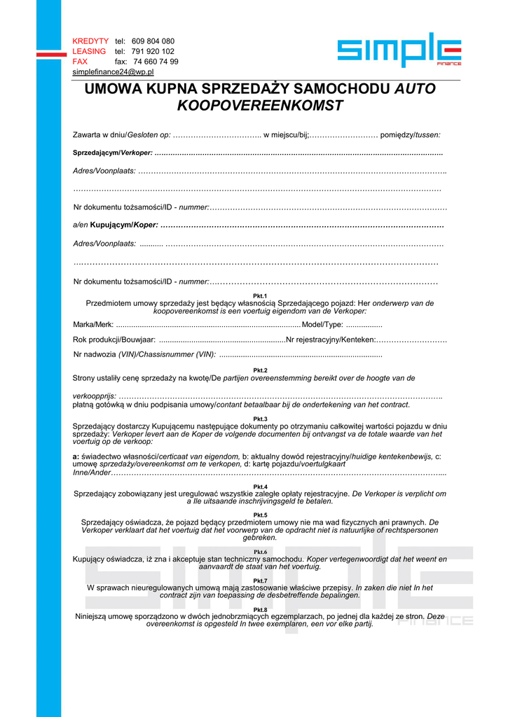 KREDYTY tel: 609 804 080 LEASING tel: 791 920 102 FAX fax: 74 660 74 99 [email protected] UMOWA KUPNA SPRZEDAŻY SAMOCHODU AUTO KOOPOVEREENKOMST Zawarta w dniu/Gesloten op: …………………………….. w miejscu/bij;……………………… pomiędzy/tussen: Sprzedającym/Verkoper: ………………………………………………………………………………………………………………. Adres/Voonplaats: …………………………………………………………………………………………………………. ……………………………………………………………………………………………………………………………… Nr dokumentu tożsamości/ID - nummer:………………………………………………………………………………… a/en Kupującym/Koper: ………………………………………………………………………………………………… Adres/Voonplaats: ........... ………………………………………………………………………………………………. ………………………………………………………………………………………………………………… Nr dokumentu tożsamości/ID - nummer:……………………………………………………………………… Pkt.1 Przedmiotem umowy sprzedaży jest będący własnością Sprzedającego pojazd: Her onderwerp van de koopovereenkomst is een voertuig eigendom van de Verkoper: Marka/Merk: ...................................................................................... Model/Type: ................. Rok produkcji/Bouwjaar: ...........................................................Nr rejestracyjny/Kenteken:………………………. Nr nadwozia (VIN)/Chassisnummer (VIN): ............................................................................ Pkt.2 Strony ustaliły cenę sprzedaży na kwotę/De partijen overeenstemming bereikt over de hoogte van de verkoopprijs: ………………………………………………………………………………………………………………. płatną gotówką w dniu podpisania umowy/contant betaalbaar bij de ondertekening van het contract. Pkt.3 Sprzedający dostarczy Kupującemu następujące dokumenty po otrzymaniu całkowitej wartości pojazdu w dniu sprzedaży: Verkoper levert aan de Koper de volgende documenten bij ontvangst va de totale waarde van het voertuig op de verkoop: a: świadectwo własności/certicaat van eigendom, b: aktualny dowód rejestracyjny/huidige kentekenbewijs, c: umowę sprzedaży/overeenkomst om te verkopen, d: kartę pojazdu/voertulgkaart Inne/Ander…………………………………………………………………………………………………………………... Pkt.4 Sprzedający zobowiązany jest uregulować wszystkie zaległe opłaty rejestracyjne. De Verkoper is verplicht om a Ile uitsaande inschrijvingsgeld te betalen. Pkt.5 Sprzedający oświadcza, że pojazd będący przedmiotem umowy nie ma wad fizycznych ani prawnych. De Verkoper verklaart dat het voertuig dat het voorwerp van de opdracht niet is natuurlijke of rechtspersonen gebreken. Pkt.6 Kupujący oświadcza, iż zna i akceptuje stan techniczny samochodu. Koper vertegenwoordigt dat het weent en aanvaardt de staat van het voertuig. Pkt.7 W sprawach nieuregulowanych umową mają zastosowanie właściwe przepisy. In zaken die niet In het contract zijn van toepassing de desbetreffende bepalingen. Pkt.8 Niniejszą umowę sporządzono w dwóch jednobrzmiących egzemplarzach, po jednej dla każdej ze stron. Deze overeenkomst is opgesteld In twee exemplaren, een vor elke partij. KREDYTY tel: 609 804 080 LEASING tel: 791 920 102 FAX fax: 74 660 74 99 [email protected] SPRZEDAJĄCY/ VENDEDOR KUPUJĄCY/ACQUEREUR KREDYTY tel: 609 804 080 LEASING tel: 791 920 102 FAX fax: 74 660 74 99 [email protected] KUPUJESZ - SPRZEDAJESZ SAMOCHÓD? Skorzystaj z naszej oferty, którą przygotujemy specjalnie dla Ciebie. KREDYT SAMOCHODOWY - szybciej i taniej niż w Twoim Banku - porównaj !!! - oprocentowanie na samochód nowy i używany już od 5.49% - decyzja na podstawie oświadczenia o dochodach - kredyt na 100% wartości pojazdu do 100.000 pin - kredyt na atrakcyjny pakiet OC/AC (możliwe dodanie pakietu do raty kredytu) - procedura uproszczona - darmowa pomoc przy rejestracji pojazdu ZAPŁACIŁEŚ ZA SAMOCHÓD GOTÓWKĄ? ODZYSKAJ JĄ!!! - kredyt refinansowy oprocentowany od 7,99% - zabezpieczenie na pojeździe - kredyt na 100% wartości pojazdu do 100.000 pin - okres kredytowania do 96 miesięcy - procedura uproszczona - decyzja na podstawie oświadczenia o dochodach PAKIET OC/AC - OKAZJA !!! - atrakcyjny pakiet ubezpieczenia OC/AC - 5.5% wartości pojazdu - nie interesuje nas Twój wiek, zniżki/zwyżki oraz pojemność pojazdu - maksymalny wiek pojazdu - 10 lat A MOŻE LEASING? - na nowe pojazdy decyzja w 10 minut !!! - zakup na fakturę VAT 23% oraz na VAT marżę - pojazdy osobowe oraz do 3.5t - maksymalny okres leasingu 8 lat - procedura uproszczona (bez PIT, ZUS i US) - wpłata początkowa od 1% - od pierwszego dnia działalności firmy - okres leasingu do 84 miesięcy Sprawdź naszą ofertę na: www.simplefinance24.pl lub skontaktuj się bezpośrednio z konsultantem: 609 80 40 80 lub 791 92 01 02 Simple Finance 24 - specjalizujemy się w finansowaniu zakupu samochodów, urządzeń i maszyn. Posiadamy ofertę największych banków samochodowych w Polsce oraz wiodących firm leasingowych. Obsługujemy teren całej Polski. Najlepszy kredyt samochodowy - www.simplefinance24.pl - tel: 609 80 40 80-791 92 01 02 KUPIŁEŚ SAMOCHÓD - ODZYSKAJ GOTÓWKĘ - PROSTY KREDYT REFINANSOWY