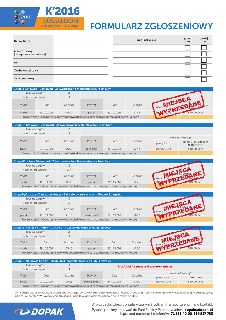 FORMULARZ ZGŁOSZENIOWY pokój 1-os. Imię i nazwisko Nazwa firmy pokój 2-os. Adres firmowy (do wpisania na fakturze) NIP Osoba kontaktowa Tel. komórkowy Grupa '1' Katowice - Dortmund - Zakwaterowanie w Hotelu Mercure am Dom Ilość noclegów 2 Ilość dni na targach 3 cena za 1 osobę* Wylot Data Godzina Powrót Data Godzina środa 19.10.2016 06:10 piątek 21.10.2016 17:45 pokój 1-os. pokój 2-os. z łożem małżeńskim 690,00 Euro 580,00 Euro Proszę wpisać ilość uczestników w odpowiednim polu oznaczonym pomarańczowym kolorem Grupa '2' Katowice - Dortmund - Zakwaterowanie w Hotelu Mercure am Dom Ilość noclegów 2 Ilość dni na targach 3 cena za 1 osobę* Wylot Data Godzina Powrót Data Godzina piątek 21.10.2016 06:10 niedziela 23.10.2016 17:45 pokój 1-os. pokój 2-os. z łożem małżeńskim 690,00 Euro 580,00 Euro Proszę wpisać ilość uczestników w odpowiednim polu oznaczonym pomarańczowym kolorem Grupa Wrocław - Düsseldorf - Zakwaterowanie w Hotelu Mercure Europlatz Ilość noclegów 2 Ilość dni na targach 2,5 Wylot Data Godzina Powrót Data Godzina środa 19.10.2016 12:55 piątek 21.10.2016 17:45 cena za 1 osobę* pokój 1-os. pokój 2-os. 680,00 Euro 530,00 Euro Proszę wpisać ilość uczestników w odpowiednim polu oznaczonym pomarańczowym kolorem Grupa Bydgoszcz - Düsseldorf Weeze - Zakwaterowanie w Hotelu Mercure Europlatz Ilość noclegów 3 Ilość dni na targach 3 Wylot Data Godzina Powrót Data Godzina piątek 21.10.2016 21:15 poniedziałek 24.10.2016 19:15 cena za 1 osobę* pokój 1-os. pokój 2-os. 680,00 Euro 530,00 Euro Proszę wpisać ilość uczestników w odpowiednim polu oznaczonym pomarańczowym kolorem Grupa '1' Warszawa Chopin - Düsseldorf - Zakwaterowanie w Hotelu Novotel Ilość noclegów 2 Ilość dni na targach 3 Wylot Data Godzina Powrót Data Godzina środa 19.10.2016 09:15 piątek 21.10.2016 17:50 cena za 1 osobę* pokój 1-os. pokój 2-os. 690,00 Euro 580,00 Euro Proszę wpisać ilość uczestników w odpowiednim polu oznaczonym pomarańczowym kolorem Grupa '2' Warszawa Chopin - Düsseldorf -Zakwaterowanie w Hotelu Novotel Ilość noclegów 3 Ilość dni na targach 3 UWAGA! Pozostało 6 wolnych miejsc. Wylot Data Godzina Powrót Data Godzina piątek 21.10.2016 09:15 poniedziałek 24.10.2016 17:50 cena za 1 osobę* pokój 1-os. pokój 2-os. 690,00 Euro 580,00 Euro Proszę wpisać ilość uczestników w odpowiednim polu oznaczonym pomarańczowym kolorem * cena obejmuje: bilety lotnicze w obie strony, przejazdy autokarem na trasie lotnisko-hotel-lotnisko oraz hotel-targi-hotel, bilety wstępu na targi, ubezpieczenie, noclegi w hotelu ****, wyżywienie (śniadania, obiadokolacje oraz po 3 napoje do każdego posiłku). W przypadku chęci dojazdu własnym środkiem transportu prosimy o kontakt. Pytania prosimy kierować do Pani Pauliny Paniok na adres: [email protected] bądź pod numerami telefonów: 71 358 40 00, 519 537 753