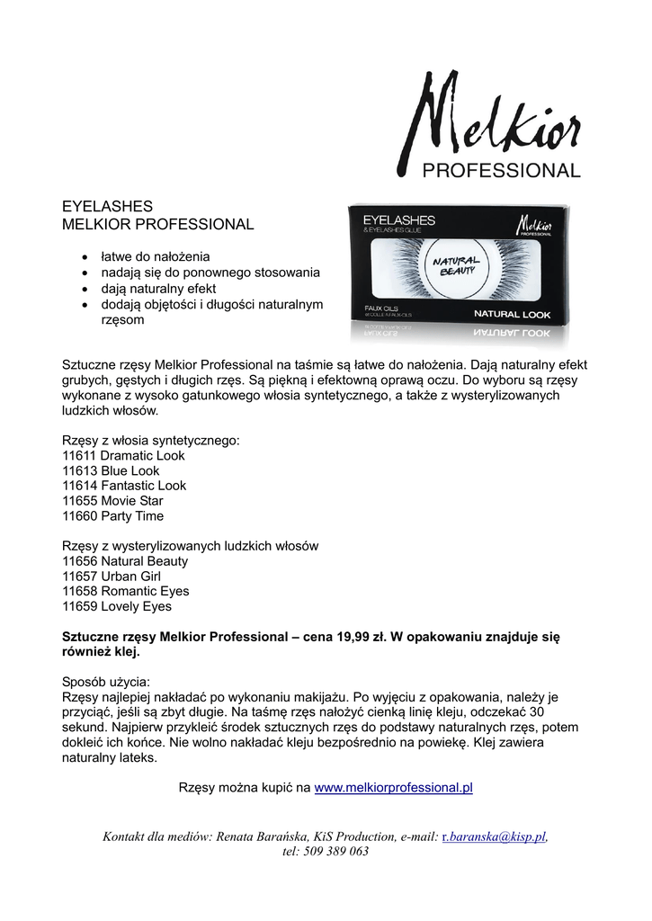 EYELASHES MELKIOR PROFESSIONAL łatwe do nałożenia nadają się do ponownego stosowania dają naturalny efekt dodają objętości i długości naturalnym rzęsom Sztuczne rzęsy Melkior Professional na taśmie są łatwe do nałożenia. Dają naturalny efekt grubych, gęstych i długich rzęs. Są piękną i efektowną oprawą oczu. Do wyboru są rzęsy wykonane z wysoko gatunkowego włosia syntetycznego, a także z wysterylizowanych ludzkich włosów. Rzęsy z włosia syntetycznego: 11611 Dramatic Look 11613 Blue Look 11614 Fantastic Look 11655 Movie Star 11660 Party Time Rzęsy z wysterylizowanych ludzkich włosów 11656 Natural Beauty 11657 Urban Girl 11658 Romantic Eyes 11659 Lovely Eyes Sztuczne rzęsy Melkior Professional – cena 19,99 zł. W opakowaniu znajduje się również klej. Sposób użycia: Rzęsy najlepiej nakładać po wykonaniu makijażu. Po wyjęciu z opakowania, należy je przyciąć, jeśli są zbyt długie. Na taśmę rzęs nałożyć cienką linię kleju, odczekać 30 sekund. Najpierw przykleić środek sztucznych rzęs do podstawy naturalnych rzęs, potem dokleić ich końce. Nie wolno nakładać kleju bezpośrednio na powiekę. Klej zawiera naturalny lateks. Rzęsy można kupić na www.melkiorprofessional.pl Kontakt dla mediów: Renata Barańska, KiS Production, e-mail: [email protected], tel: 509 389 063 INFORMACJE O FIRMIE: Melkior Professional założyło dwóch przyjaciół. Eric – dążący do perfekcji menadżer, oraz Aleksander – wielbiciel marketingu i designu. Połączyły ich wspólne marzenia, podobne ambicje i te same pasje. Tworząc Melkior Professional, postawili sobie jeden cel – zrozumieć kobiety. Dowiedzieć się, co w kosmetykach jest dla nich najważniejsze. Obecnie, dzięki ponad 15-letniemu doświadczeniu w branży, Eric i Aleksander tworzą najwyższej jakości produkty dla kobiet w każdym wieku. Melkior Professional to marka oferująca szeroką gamę kosmetyków kolorowych oraz akcesoriów do pielęgnacji paznokci. Nad produktami i ich ulepszaniem pracuje sztab specjalistów, dlatego kosmetyki Melkior Professional są coraz doskonalsze. Każdy produkt poddawany jest specjalnej kontroli jakości, aby w końcu trafić do rąk kobiety. Firma współpracuje z najlepszymi profesjonalistami. Kosmetyków marki Melkior Professional używają styliści, wizażyści i naildesignerzy na całym świecie. Wybitna wizażystka z Nowej Zelandii, Candia Trugly, uważa że Melkior ma najlepszą na świecie kredkę do powiek, a międzynarodowa instruktorka przedłużania i zdobienia paznokci, Dorina Cordes twierdzi natomiast, że marka ma najlepsze lakiery do paznokci. Kontakt dla mediów: Renata Barańska, KiS Production, e-mail: [email protected], tel: 509 389 063